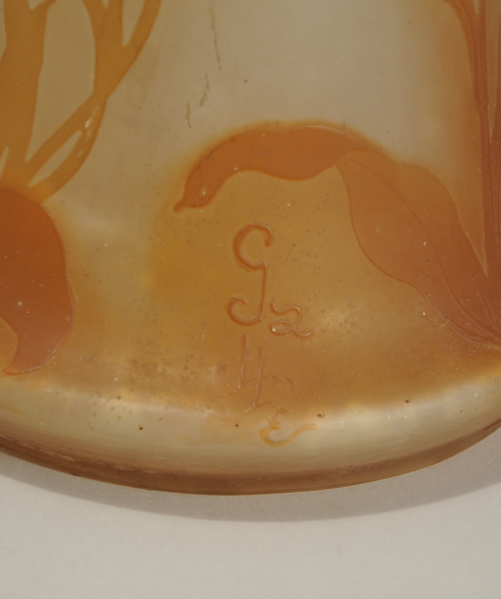 VASE tronconique à panse renflée et col évasé en verre multicouche à décor orangé dégagé à l'acide de giroflées sur fond opaque blanc nuancé orange.