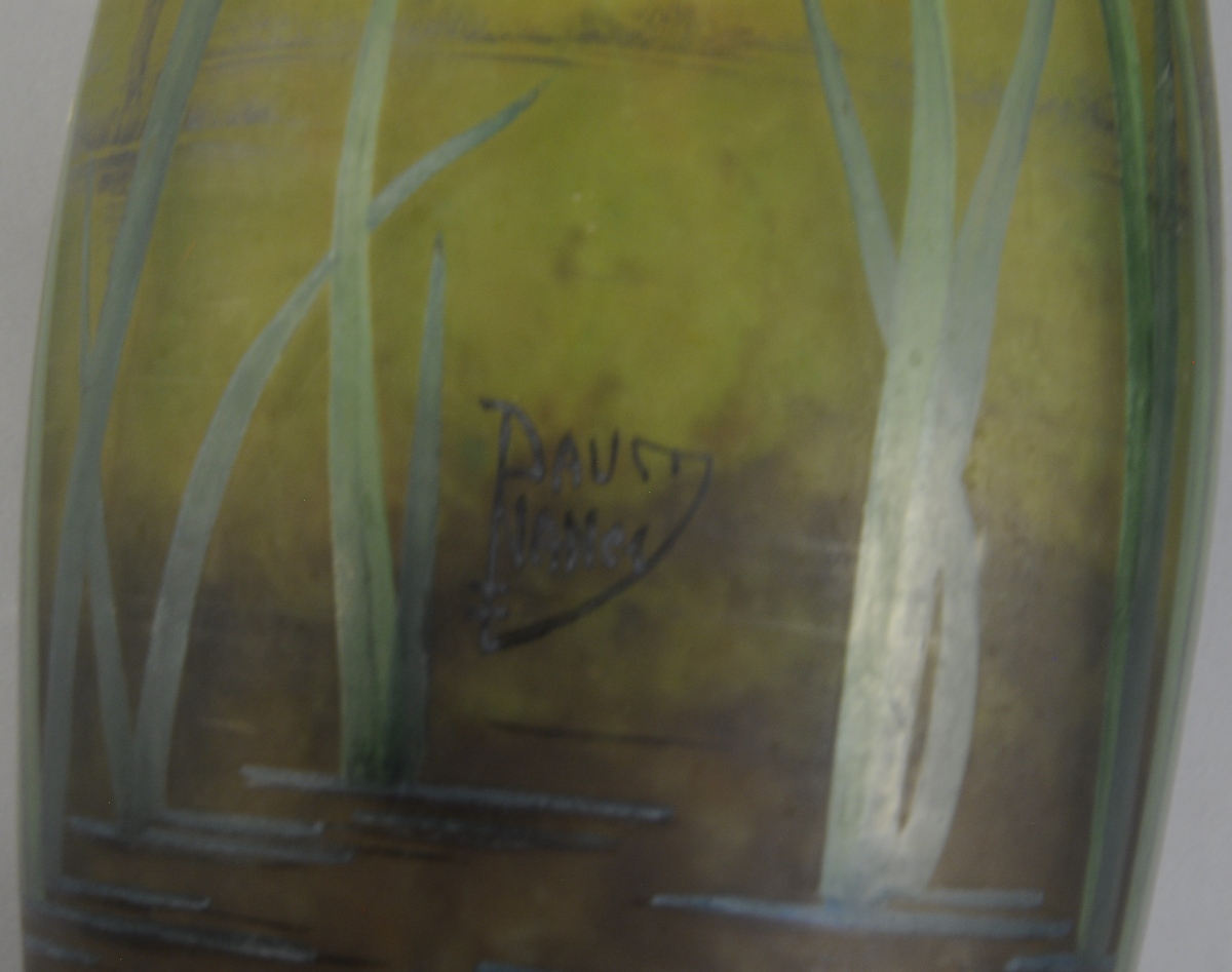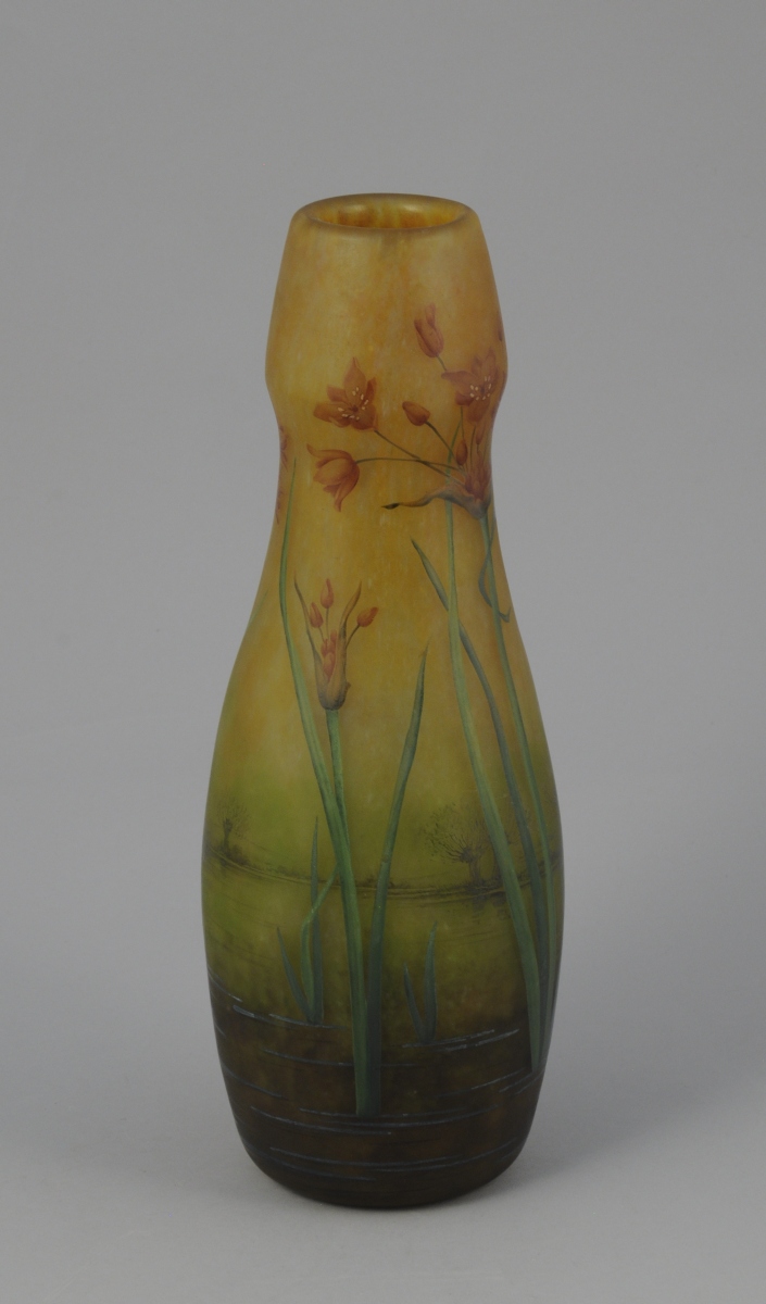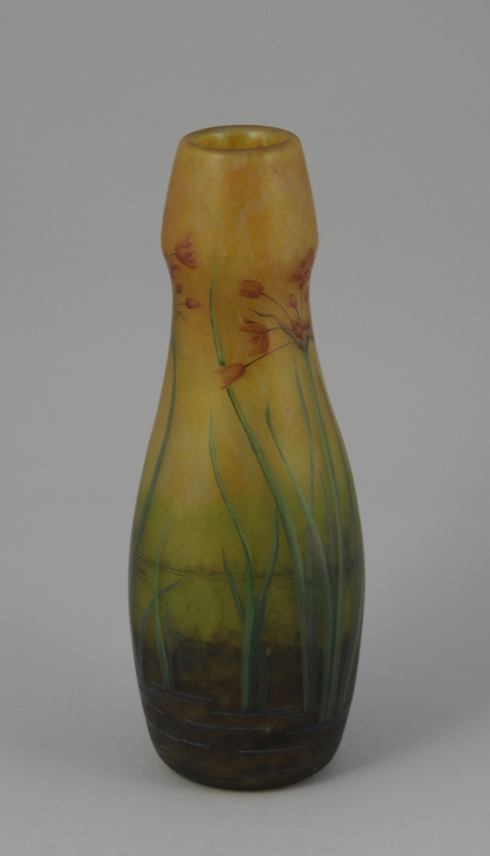 DAUM NACY. VASE balustre à col renflé en verre multicouche à marbrure intercalaire jaune verte et brune. Décor peint de fleurs et feuilles d'ail rose sur fond paysagé figurant une étendue d'eau. Signé "Daum + Nancy".