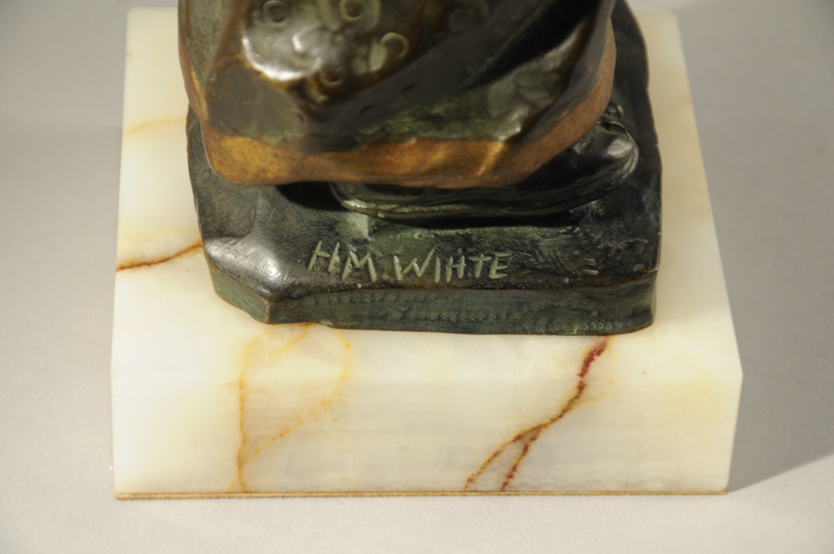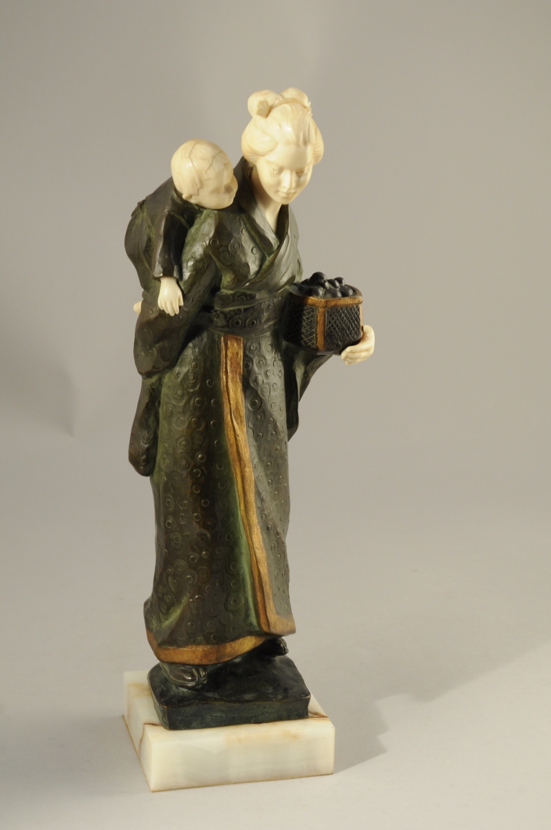 Sculpture chryséléphantine en bronze polychrome à patine verte et or, sur contre socle en onyx. Têtes, mains et pieds de l'enfant en ivoire.