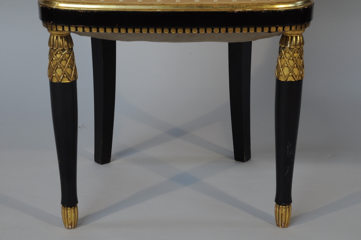 PAIRE de CHAISES à dossier renversé en bois mouluré, sculpté et laqué noir et or. Frise dentelée en ceinture. Pieds antérieurs ornés de quadrillages et godrons, pieds postérieurs sabre. Garniture de tissu jaune et rose d'origine. Numéros d'identification.
