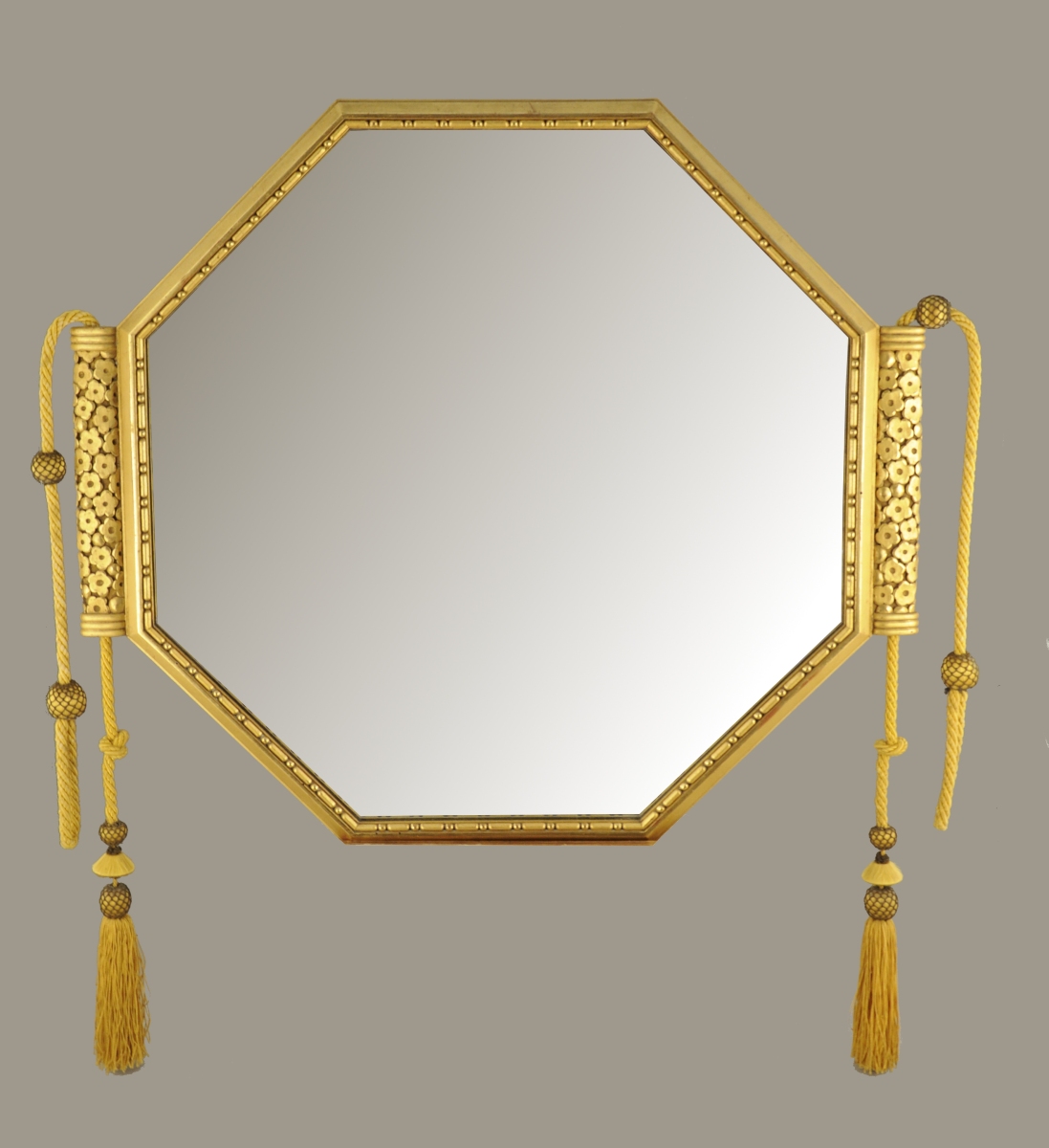 MIROIR octogonal en bois sculpté, stucqué et doré. Baguettes moulurées agrémentées d'une frise d'olives et perles. Flanqués de deux éléments latéraux oblongs ornés de fleurettes accueillant une cordelière à gland.