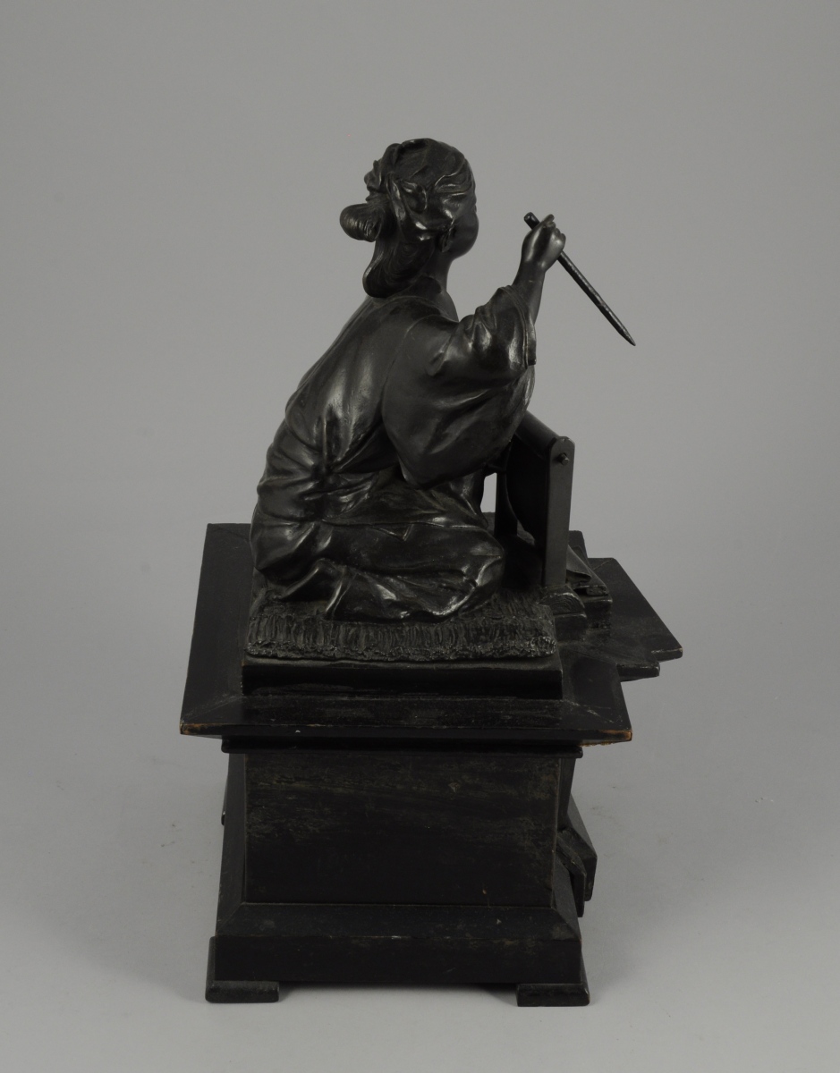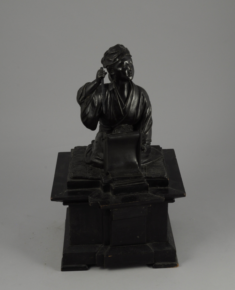 JAPON. PEINTRE ACCROUPI, en bronze à patine brune sur un socle en bois. XIXe.
