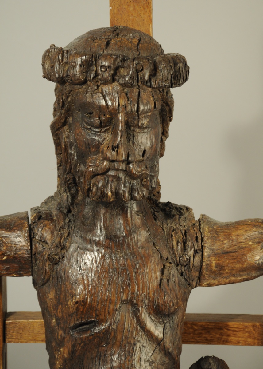 CHRIST en bois sculpté couronné d'épines, le visage apaisé, les bras perpendiculaires au corps. Traces d'enduit.