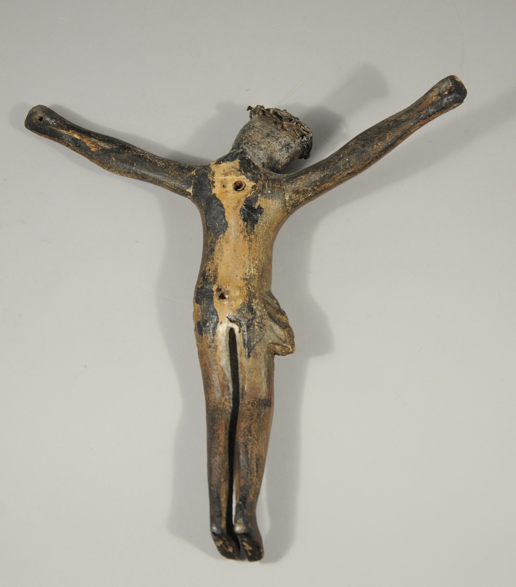 CHRIST en bois sculpté et peint. La couronne d'épines en fil de fer.