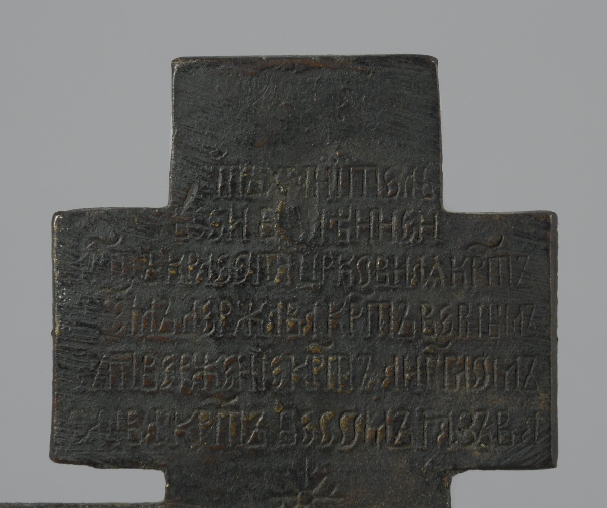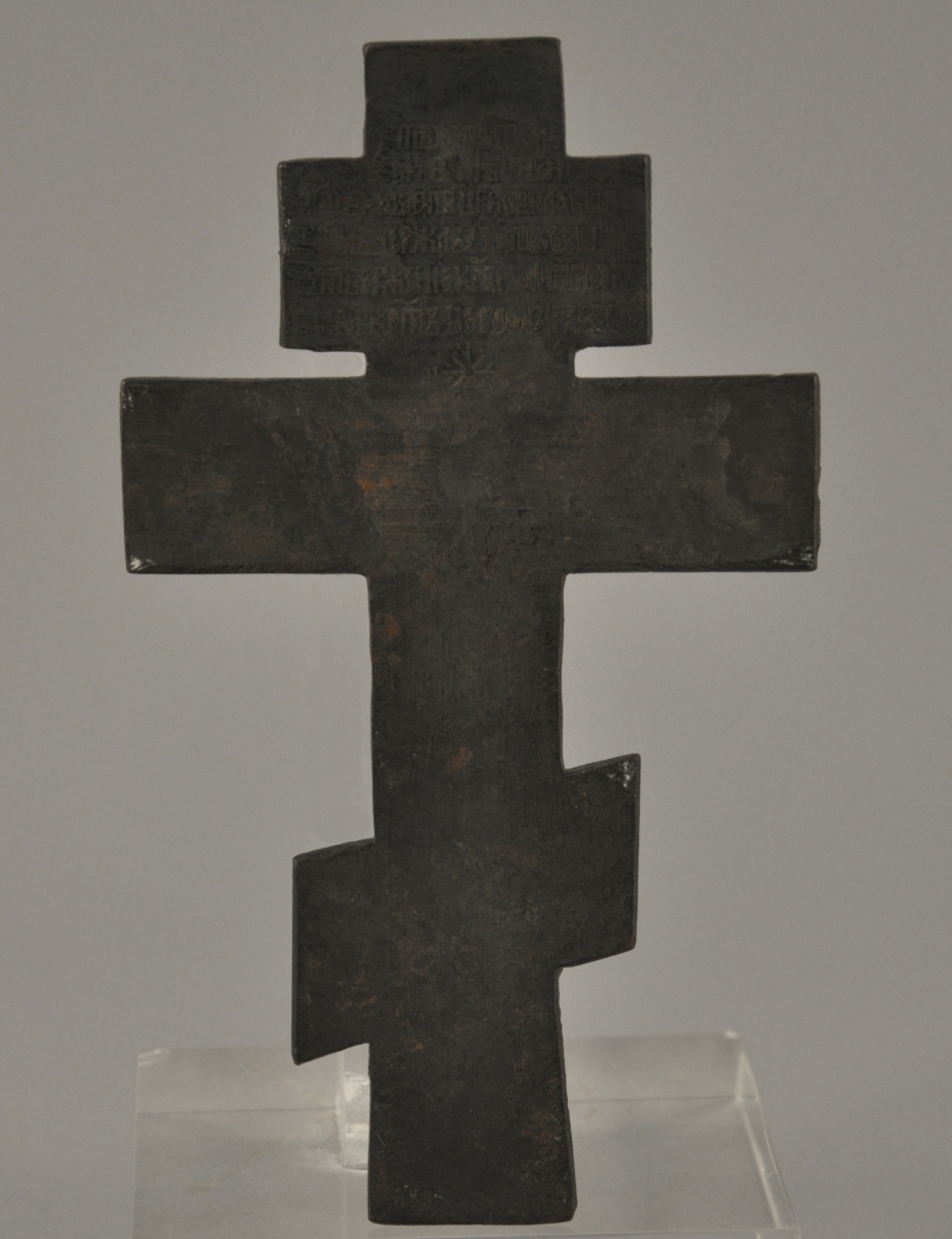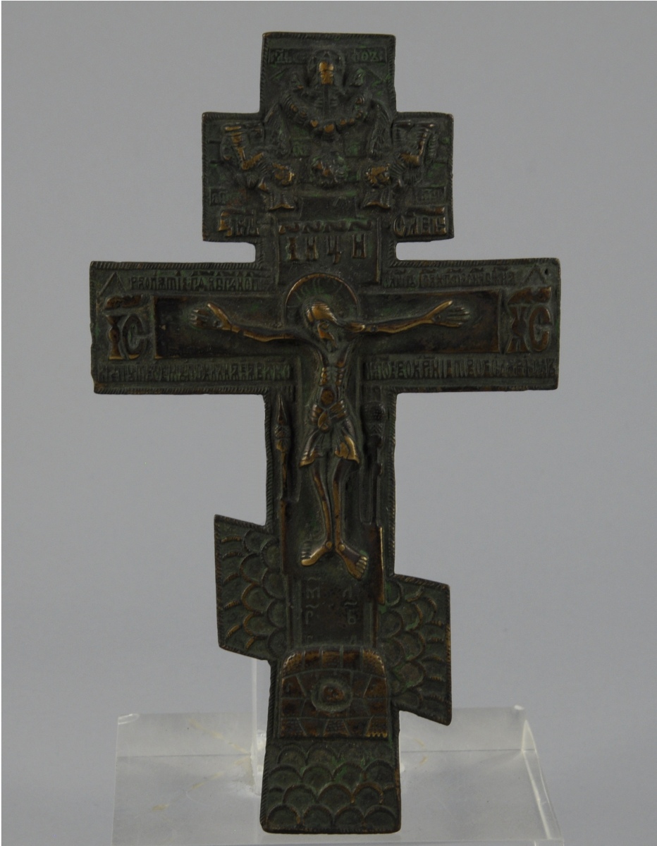 CRUCIFIX en bronze. Travail russe ancien. Haut. 19,5 Larg. 11,5 cm.