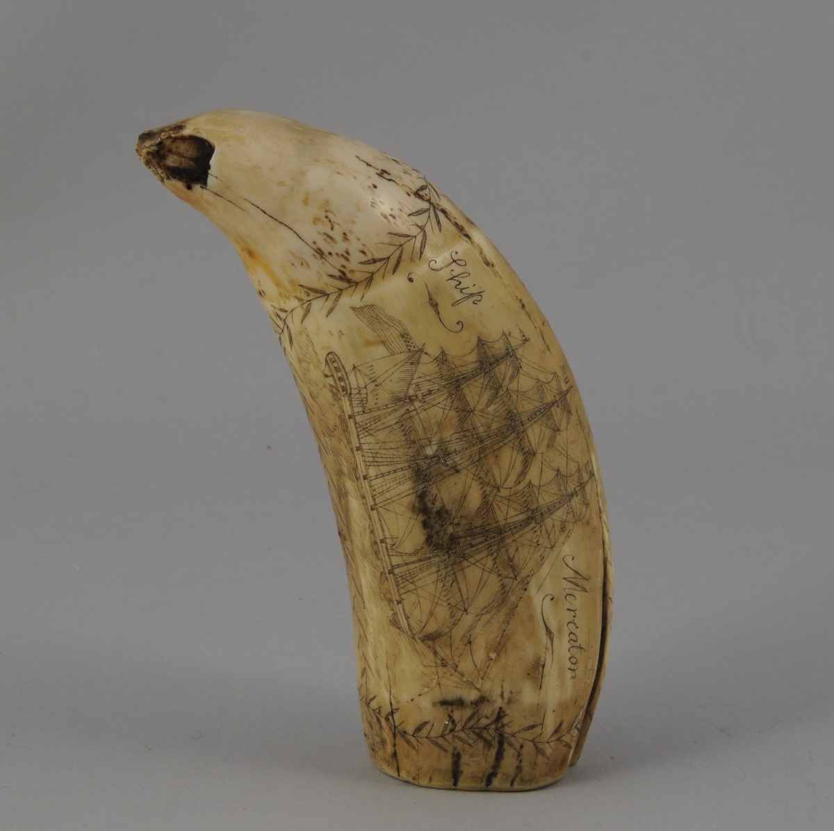 DENT DE CACHALOT en résine patinée et gravée du baleinier américain "Ship Mereaton" et d'une femme dénudée, tenant une lyre, en bord de mer.