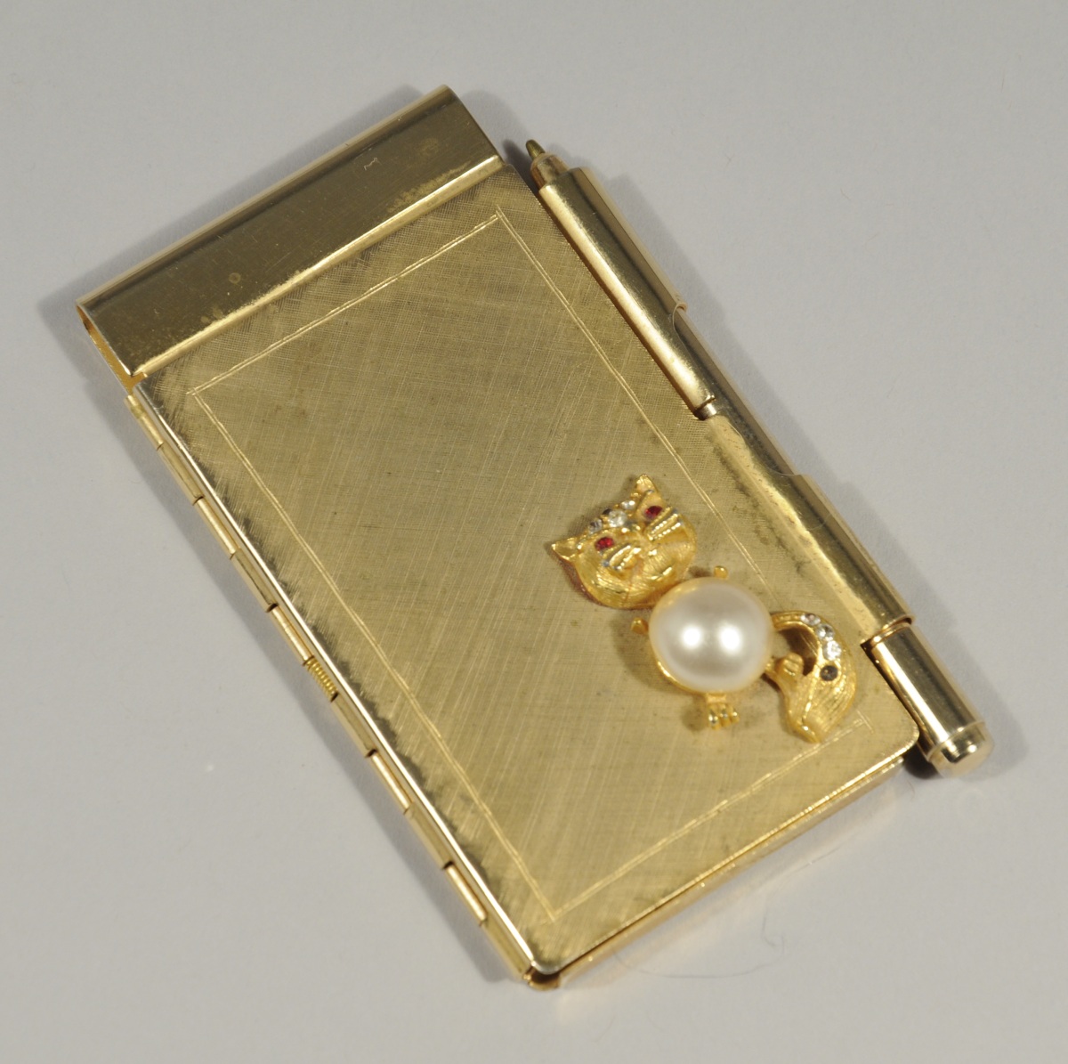 RÉPERTOIRE rectangulaire en métail doré, orné d'un chat sertis de pierreries et perles sur le premier plat. Fermeture par charnière rentenue par un stylographe.