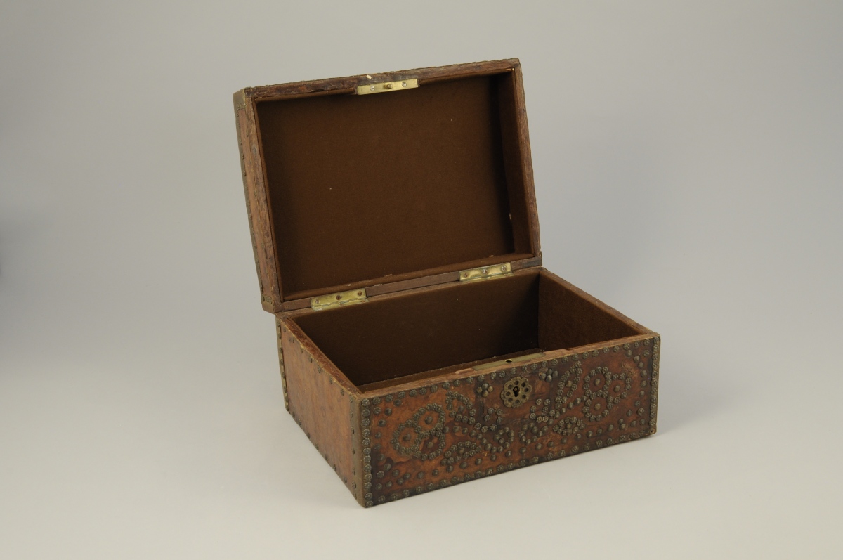 COFFRET de forme rectangulaire à couvercle légèrement arrondi gainé de cuir fauve. Décor de clous bombés ou en forme de rosettes. Une petite poignée au centre du couvercle.
