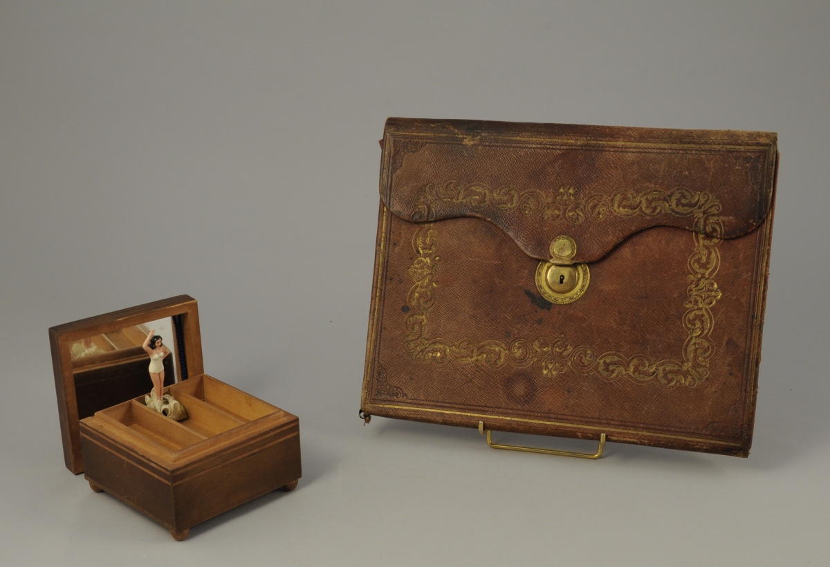 - BOÎTE À CIGARETTES musicale de forme carrée en bois teinté. Elle découvre une danseuse tournant sur elle-même. Le couvercle bombé foncé d'un miroir. Repose sur quatre pieds boulle.