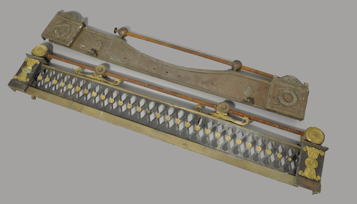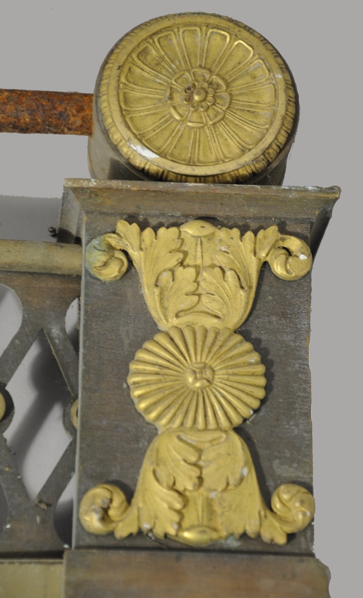 BARRE DE FOYER en bronze et laiton. La traverse ajourée de motifs géométriques. Ornements en bronze ciselé et doré tels qu'enroulements feuillagés à têtes d'aigle, rosaces, fleurons et feuilles d'acanthe stylisées.