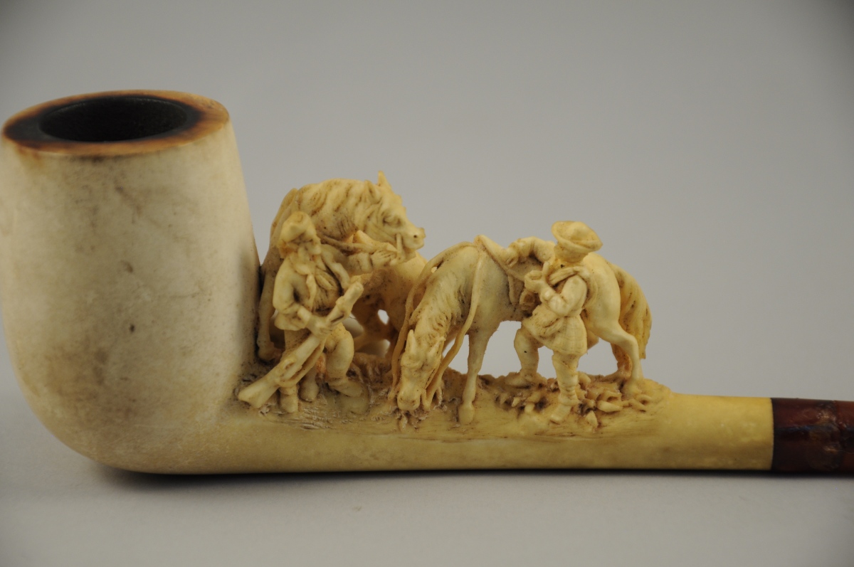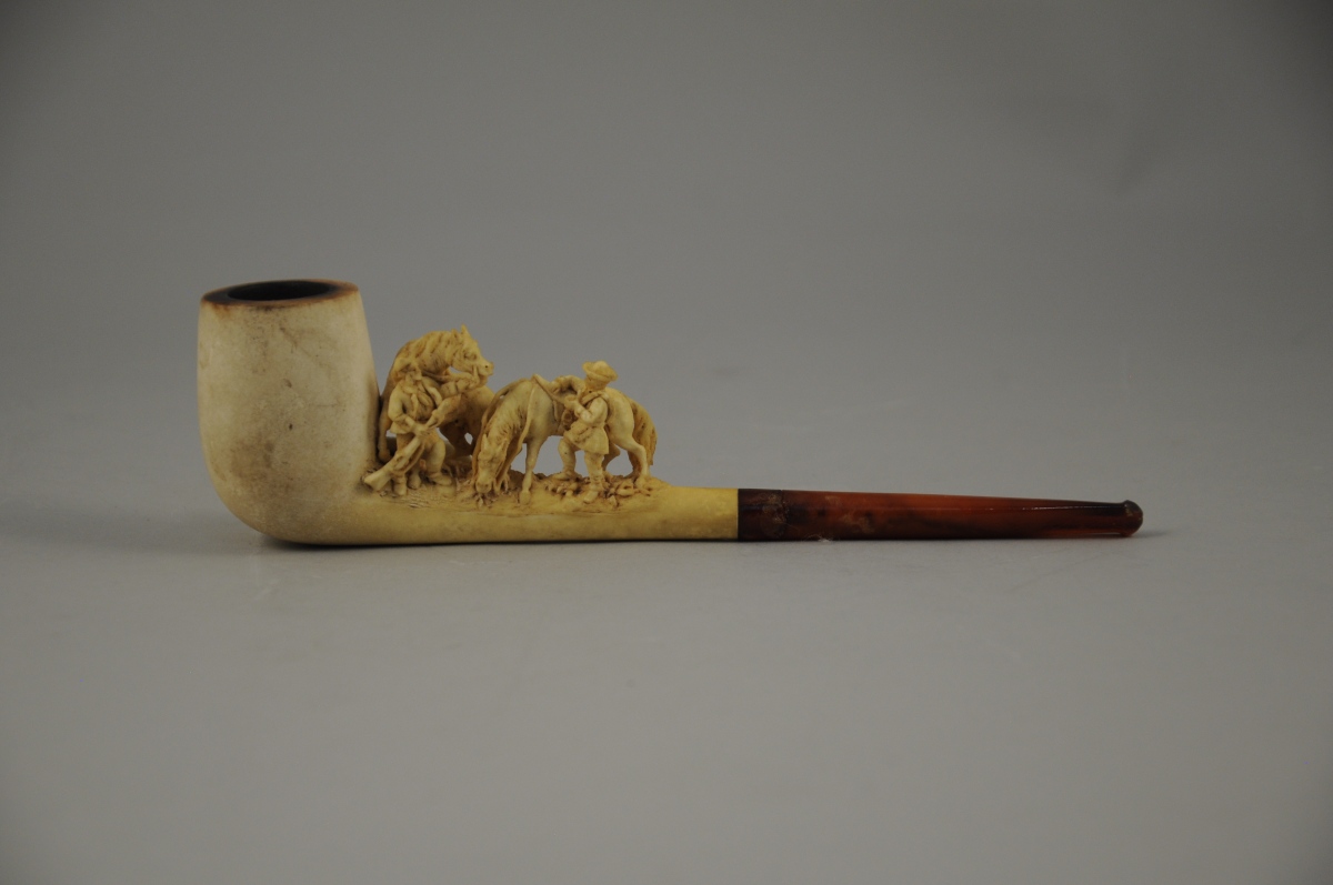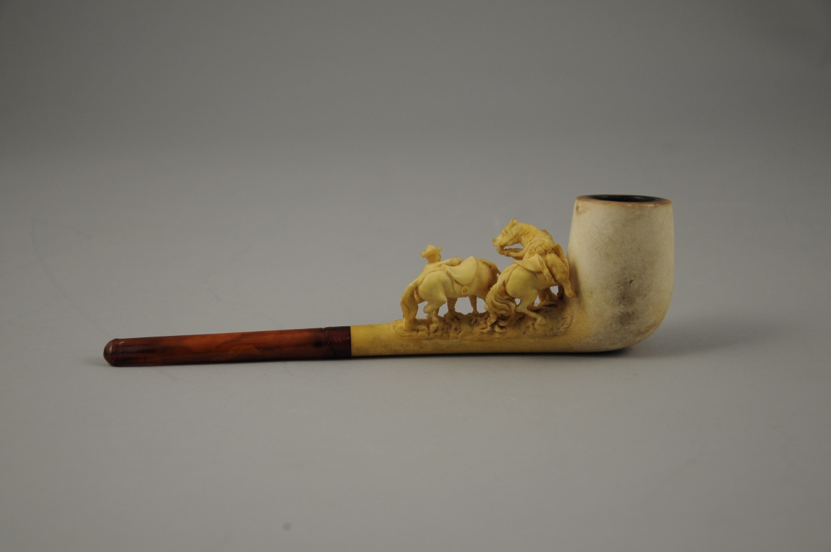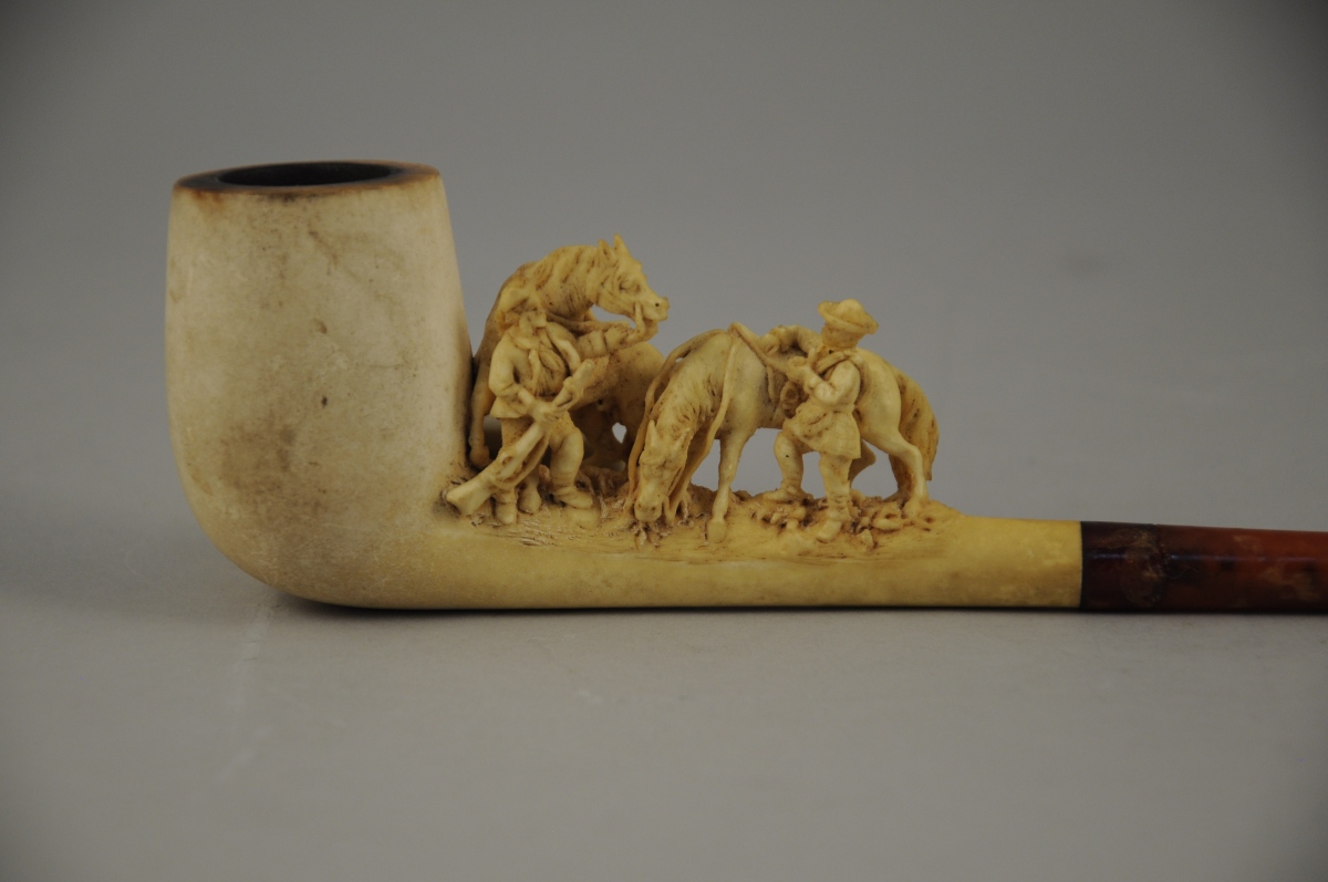 PIPE, le foyer en écume sculptée de deux cavaliers au repos, l'un armé d'un fusil. La tige à l'imitation de l'ambre. Dans son étui gainé de cuir.