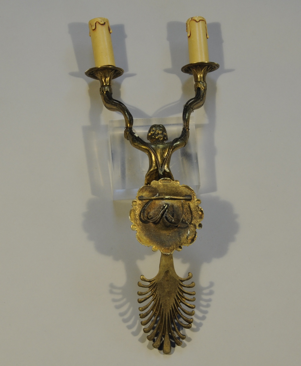 APPLIQUE de style composite en bronze doré figurant un chérubin tenant deux bras de lumière, rosace et palmette ajourée.