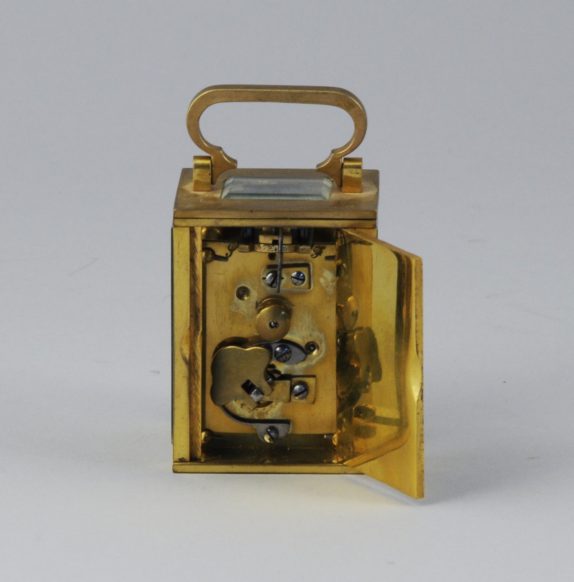 PENDULE dite d'OFFICIER. Cage en bronze à vitres en verre biseauté sur quatre faces laissant voir le mécanisme. Cadran émaillé blanc indiquant les heures et les minutes en chiffres romains et signé "Au touriste".
