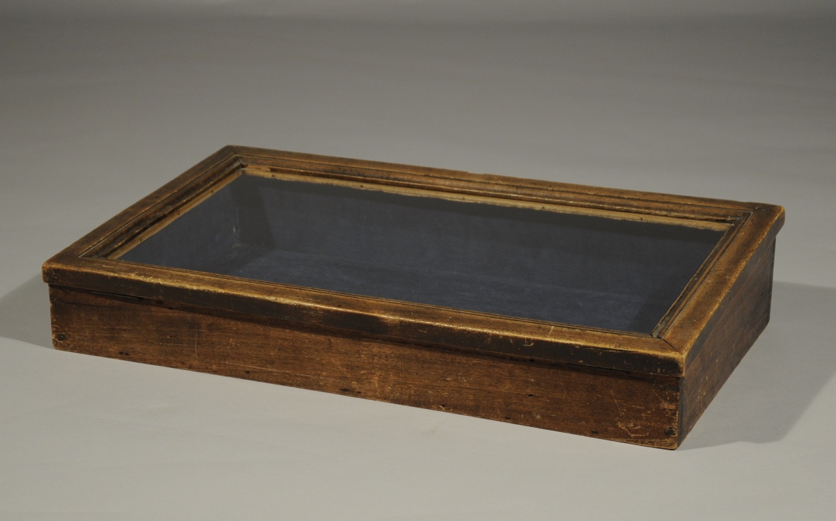 VITRINE PLATE de forme rectangulaire en bois mouluré. Le couvercle vitré incliné.