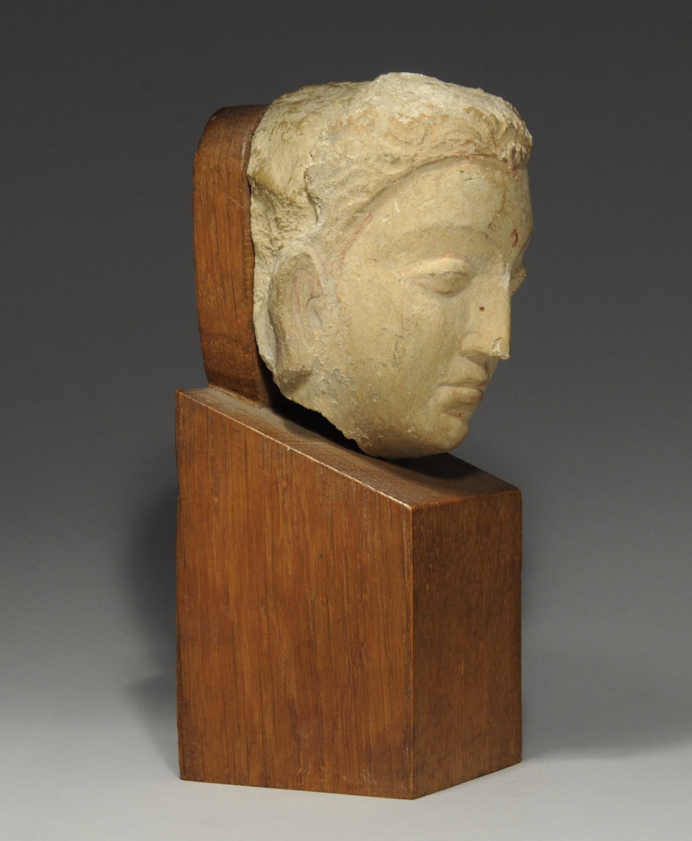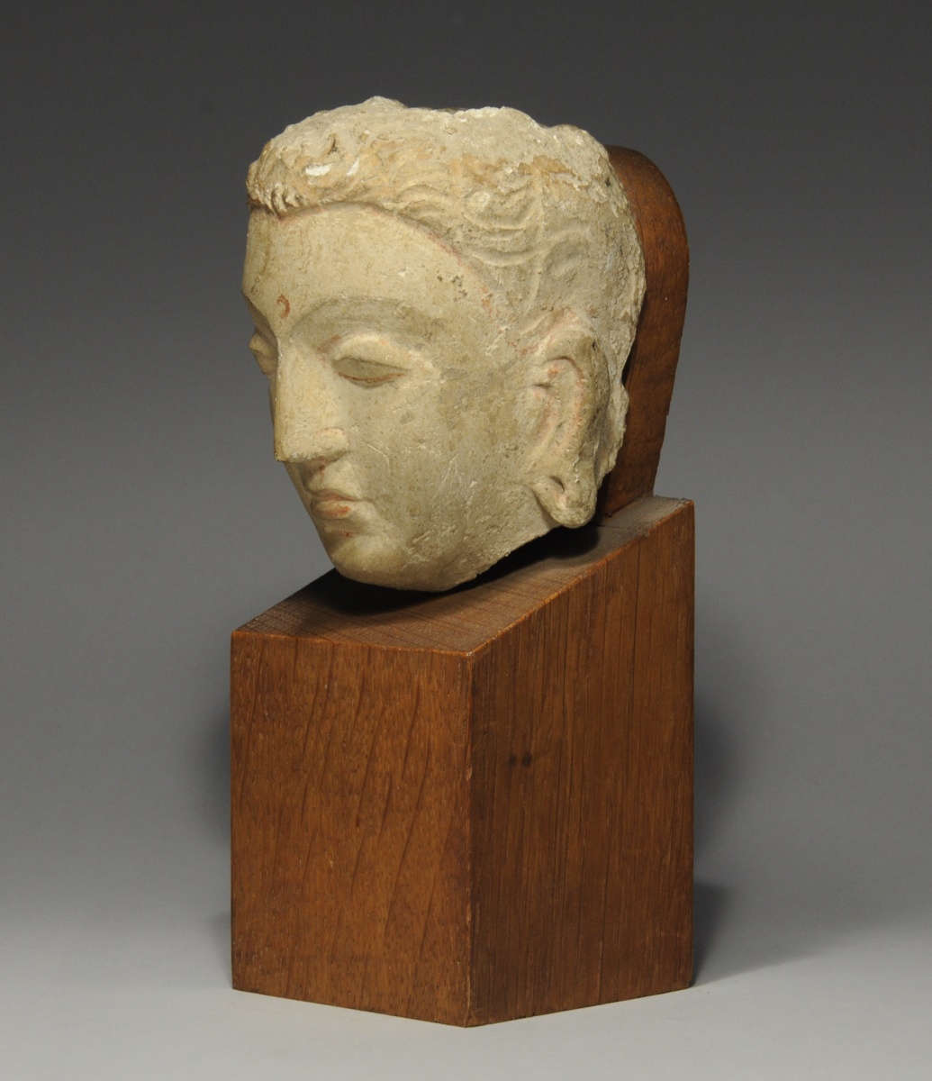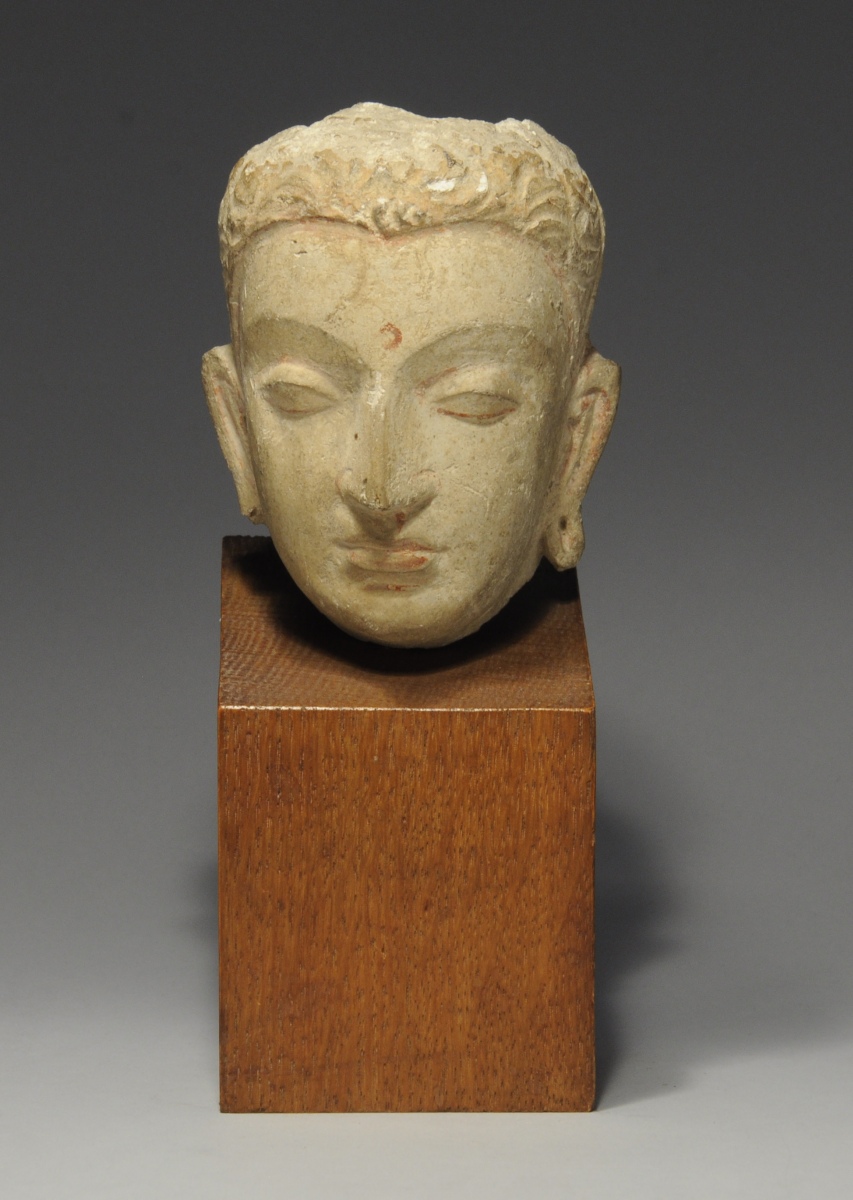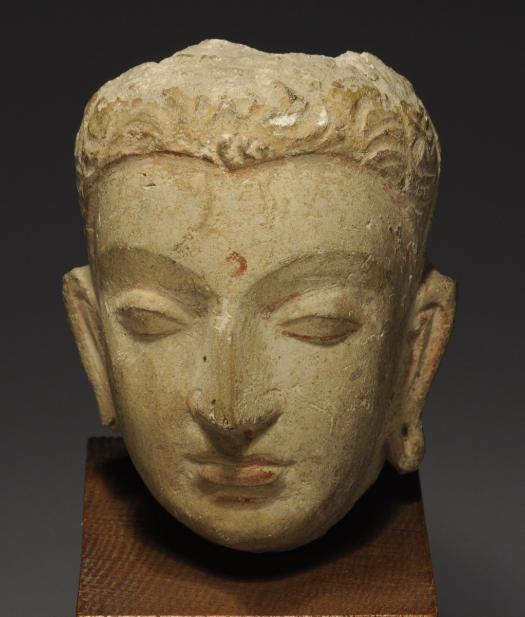GANDHARA. TÊTE DE BOUDDHA en stuc sculpté. Traces de peinture rouge.