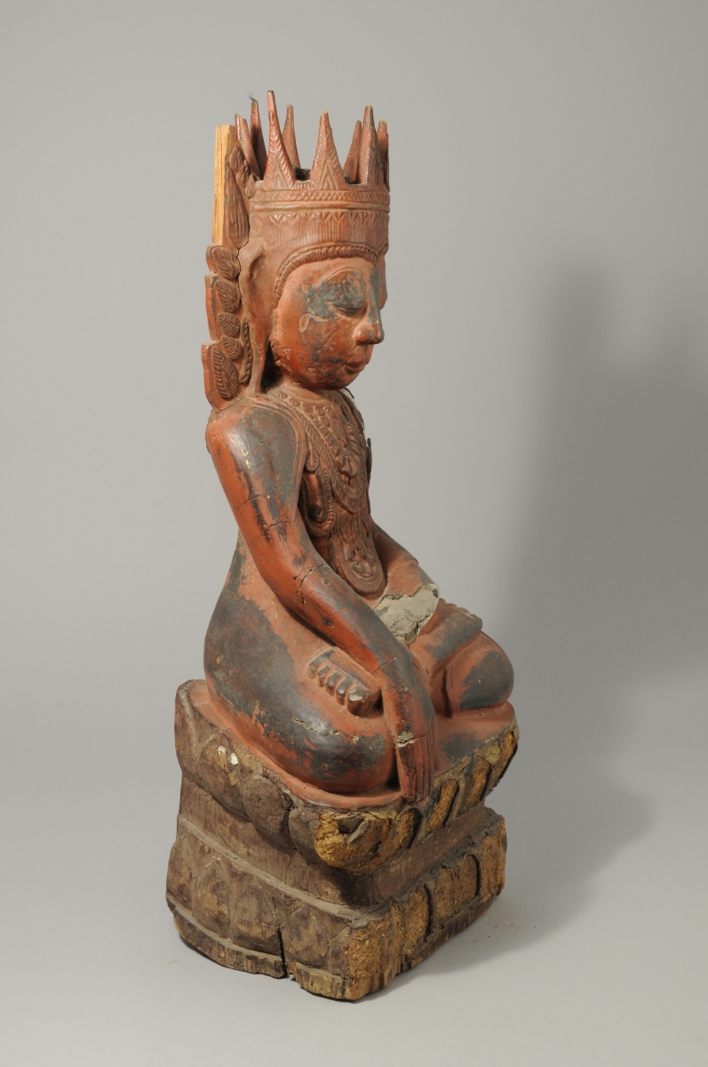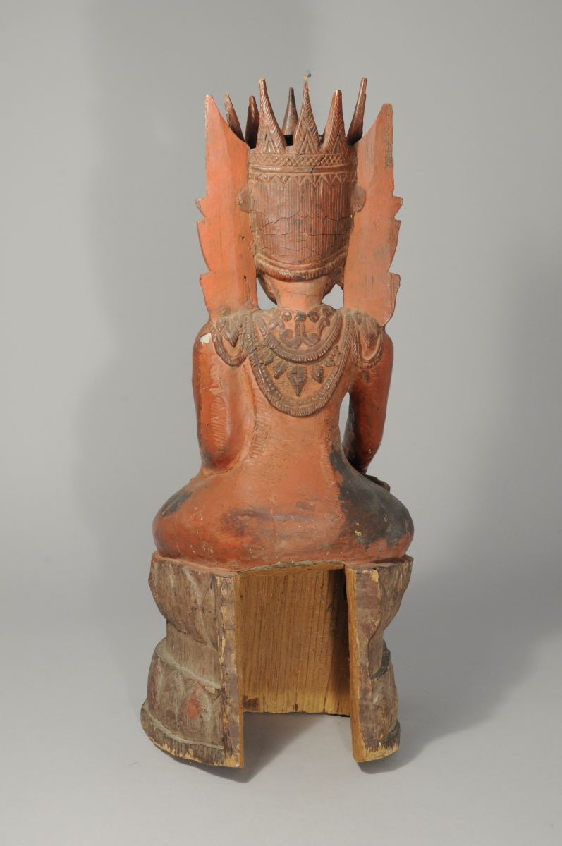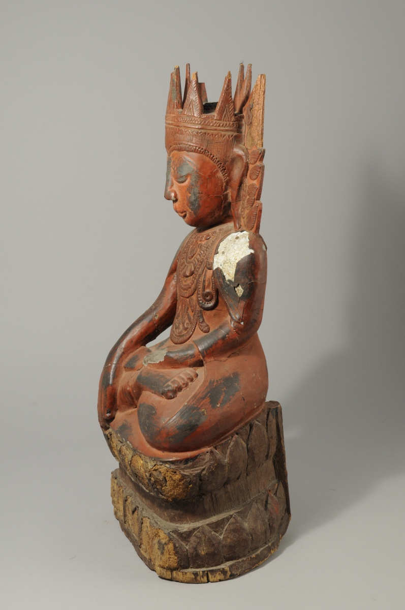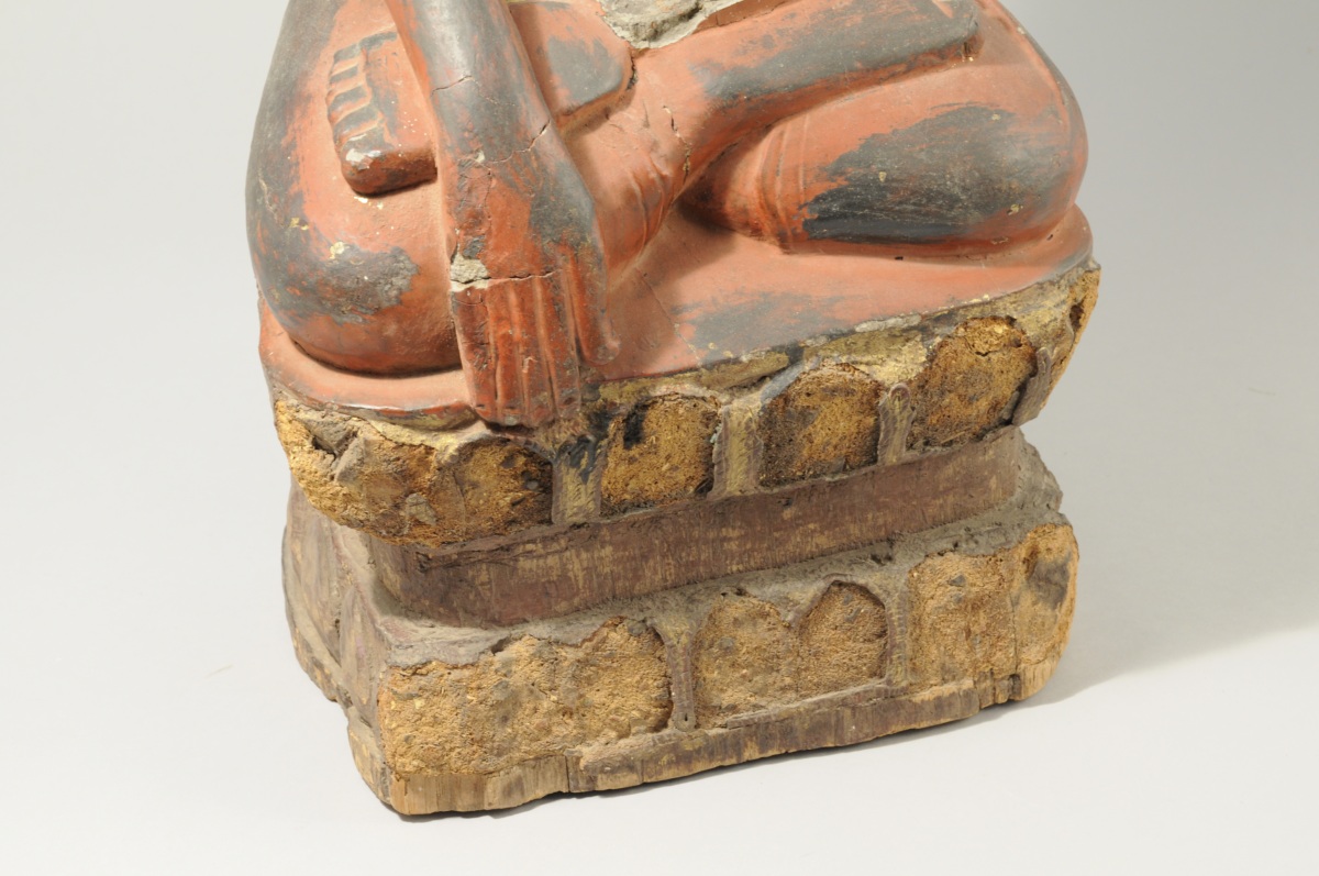 BIRMANIE. STATUE en bois sculpté et stuquée rouge figurant une divinité accroupie.
