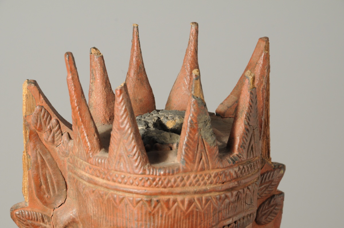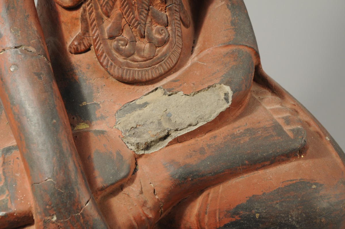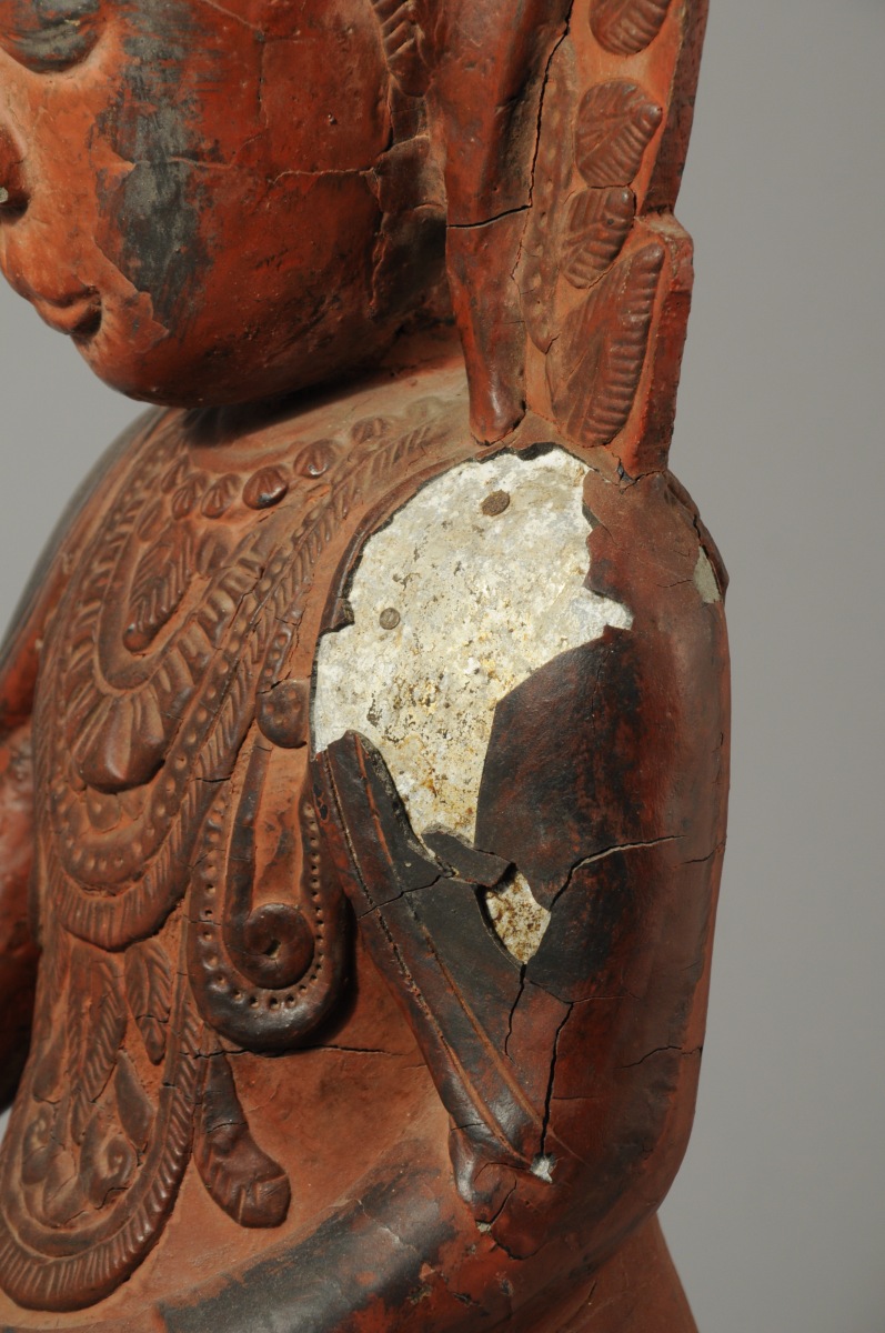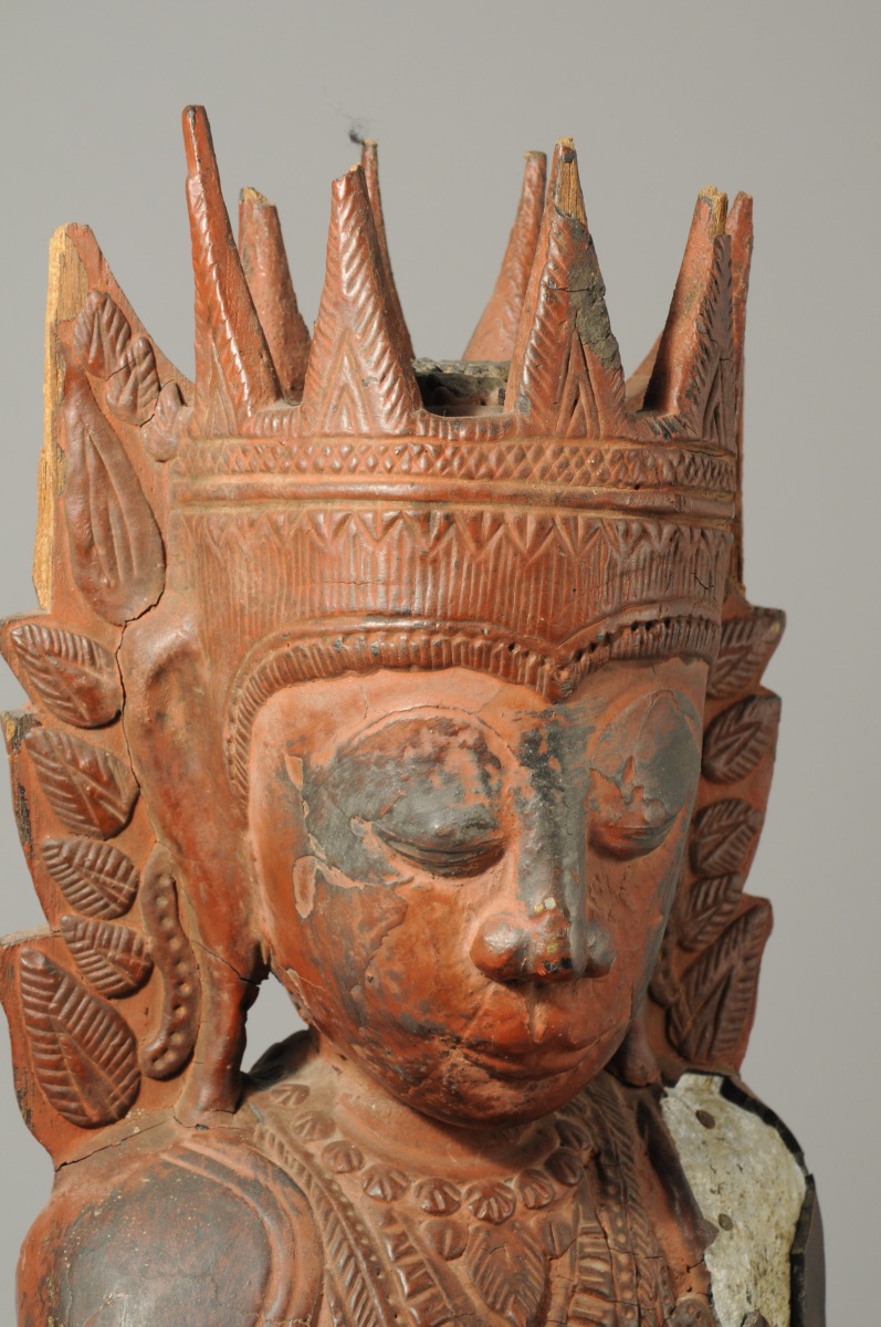 BIRMANIE. STATUE en bois sculpté et stuquée rouge figurant une divinité accroupie.
