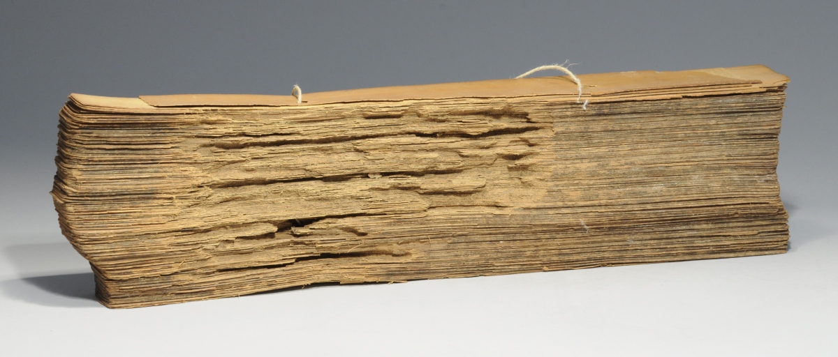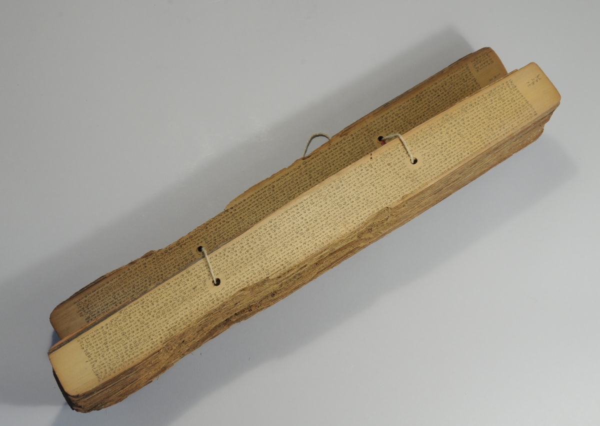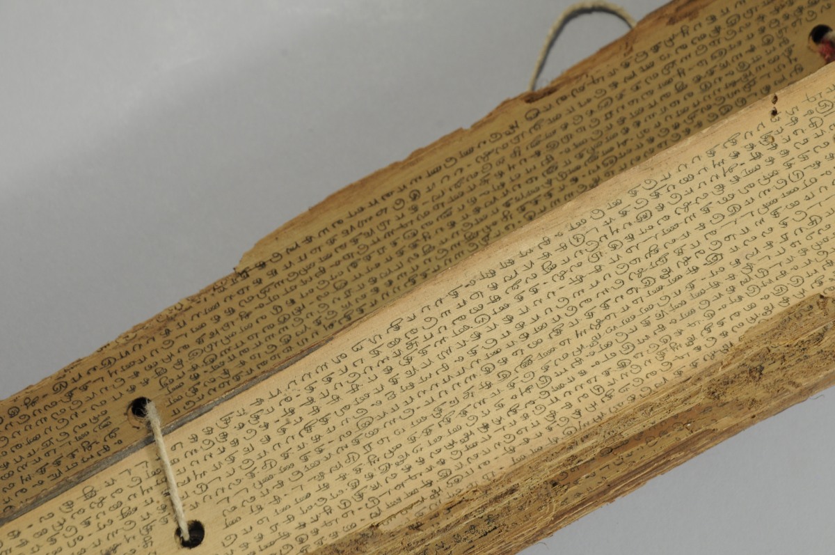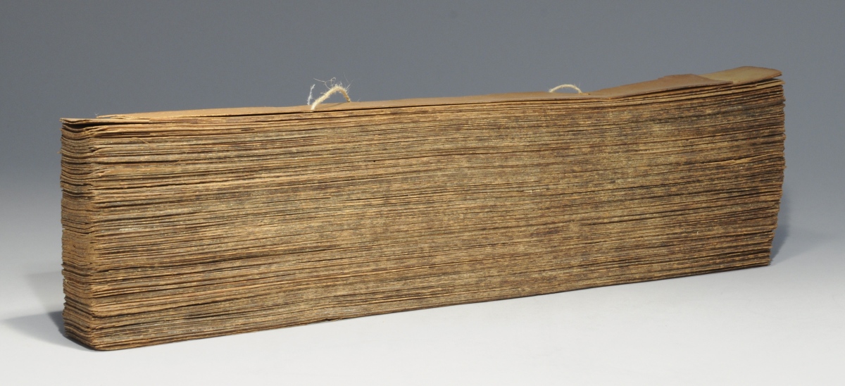 BIRMANIE. LIVRE DE PRIÈRES sur plaquettes de bambou, étiquettes : "Livre de médecine. / Délier la ficelle pour ouvrir." et "Souvenir du P.J. Bourdot / Missionnaire au Maduré (Inde.) / 1897." Dans sa boîte.