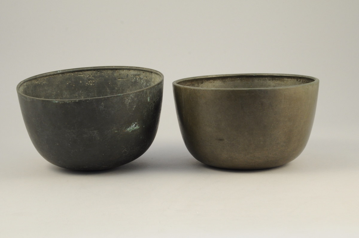 CAMBODGE, probablement . Deux MORTIERS en bronze patiné.