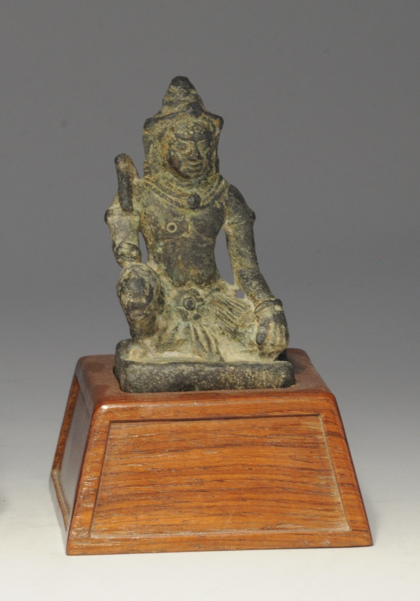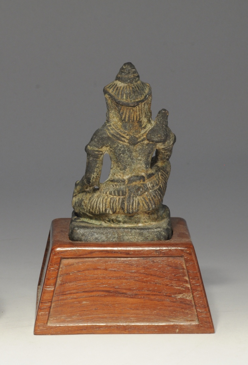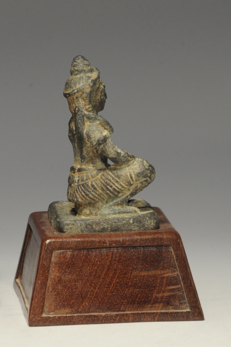 SUD-EST ASIATIQUE. DIVINITÉ AGENOUILLÉE en bronze patiné. Sur un socle de bois.