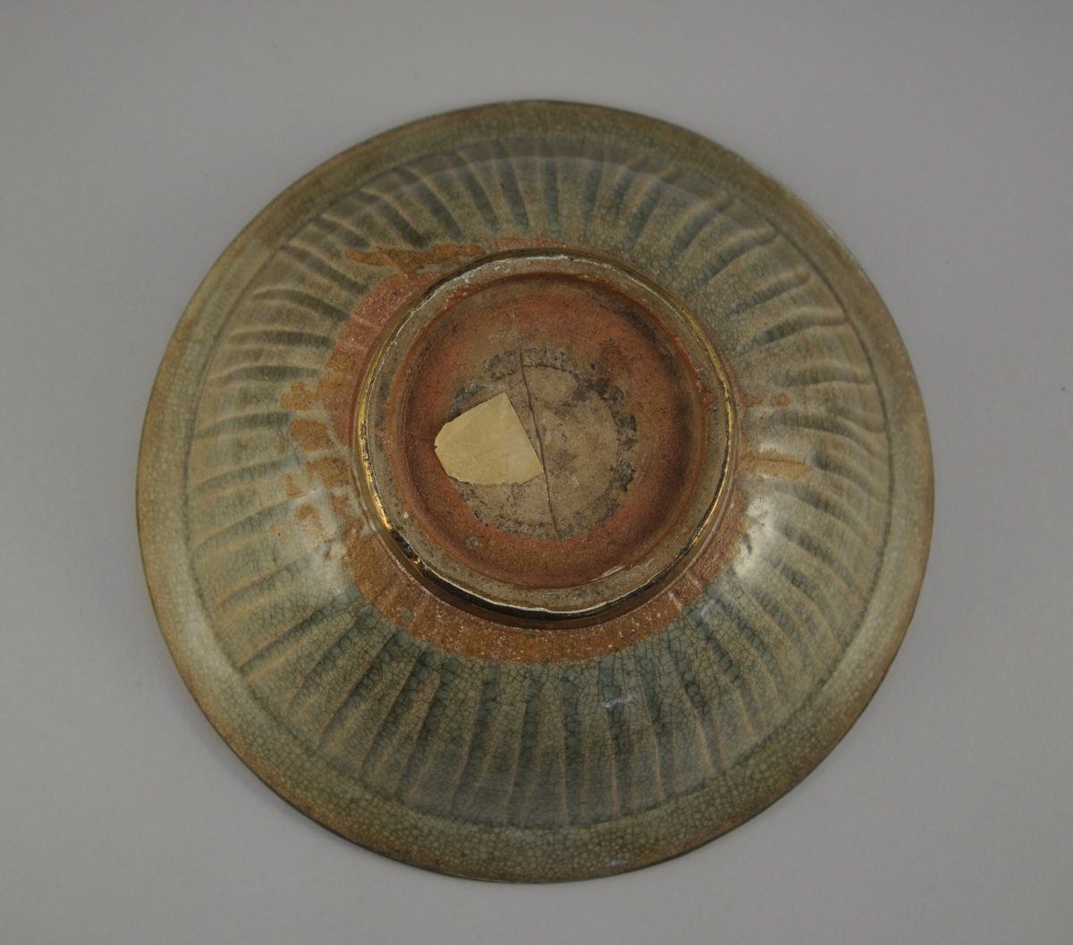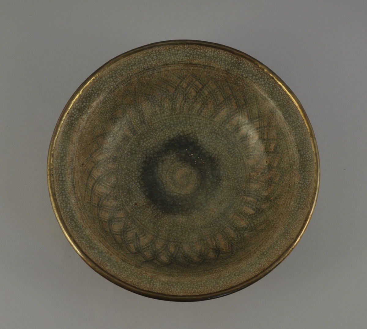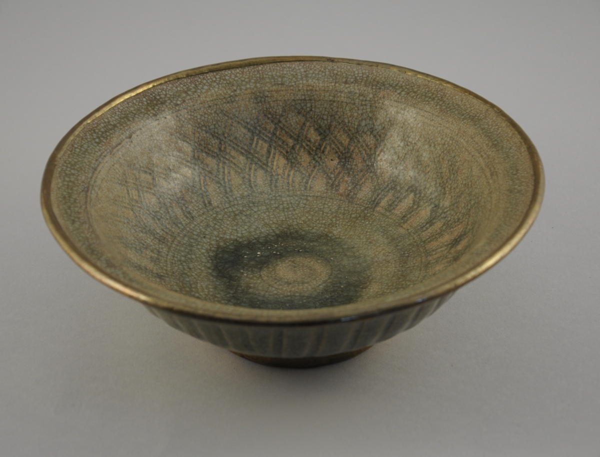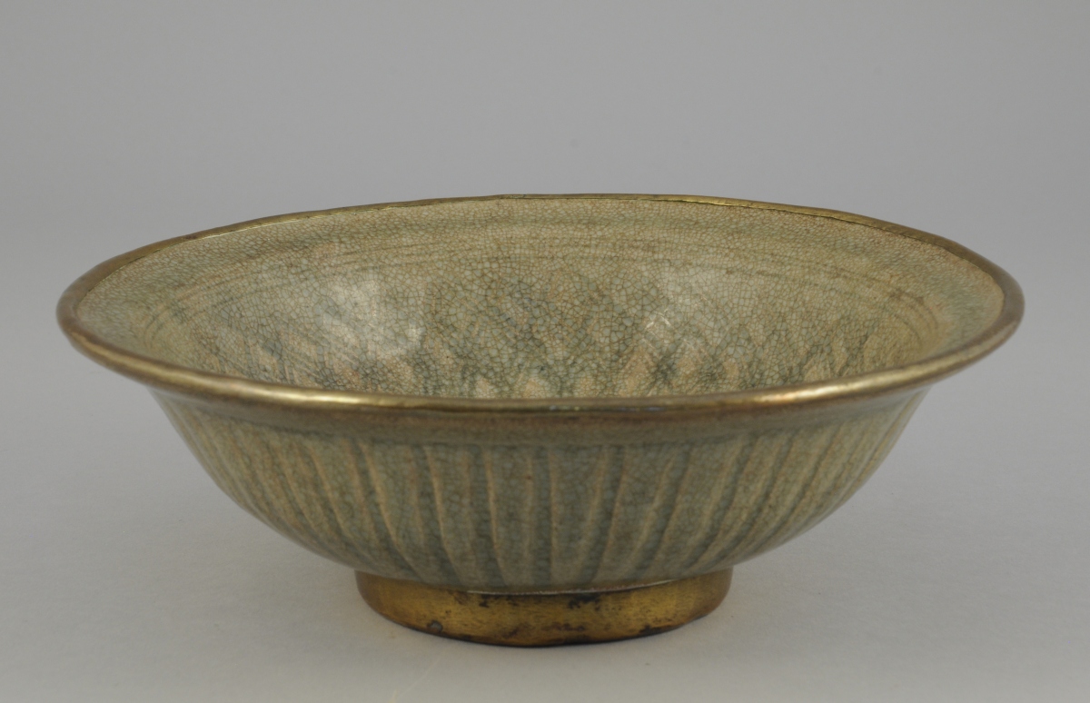 THAÏLANDE. JATTE en grés, l'aile à motif de godrons et fleurs de lotus, couverte céladon craquelée. Le col et le talon cerclés d'un alliage de cuivre et laiton.