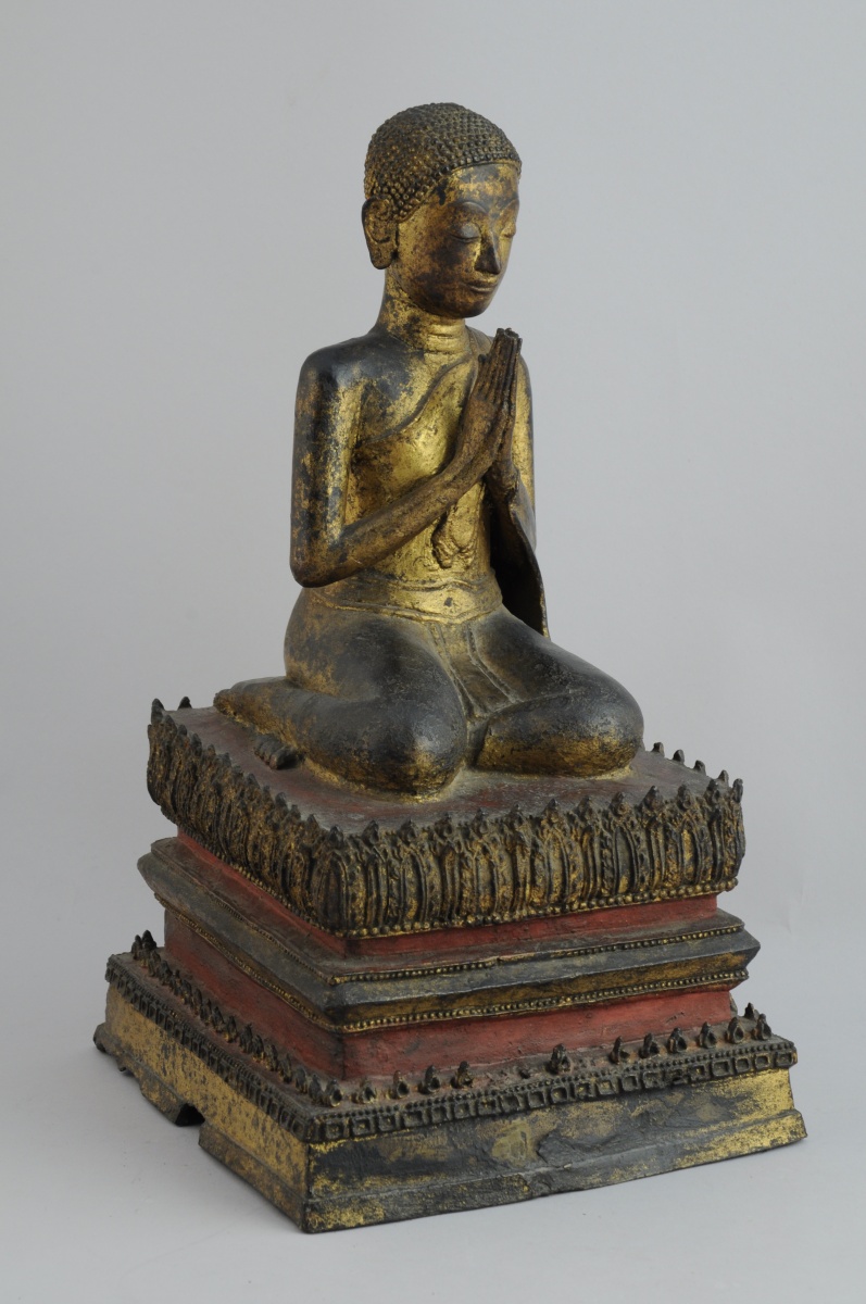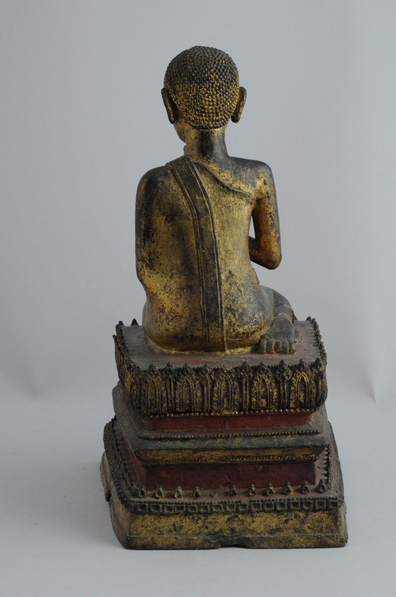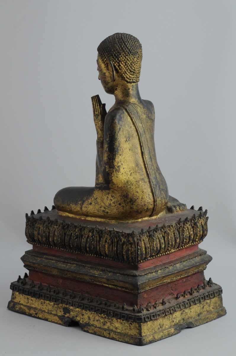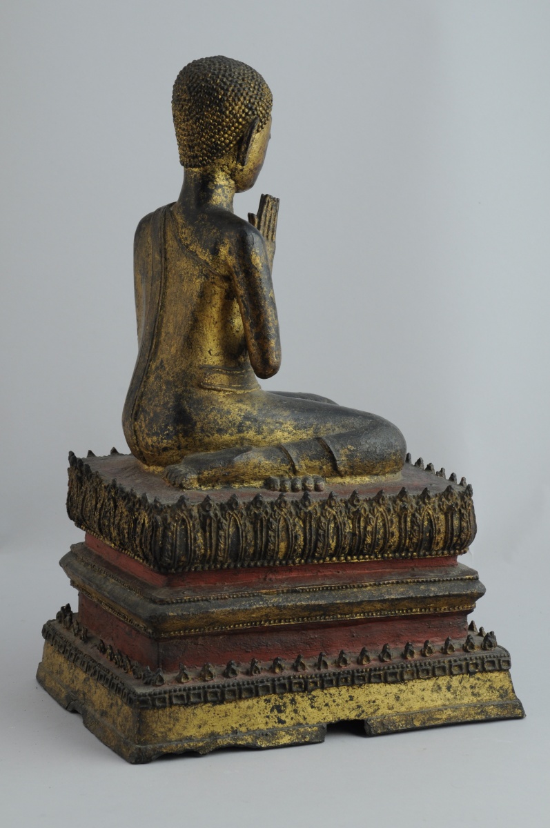 THAÏLANDE. BOUDDHA agenouillé en bronze doré et laqué rouge. Il se tient sur un socle rectangulaire à plusieurs niveaux.