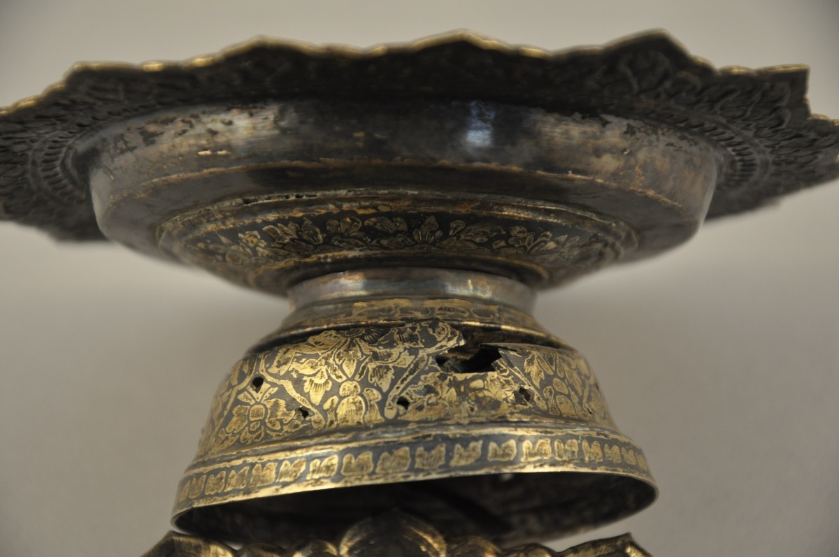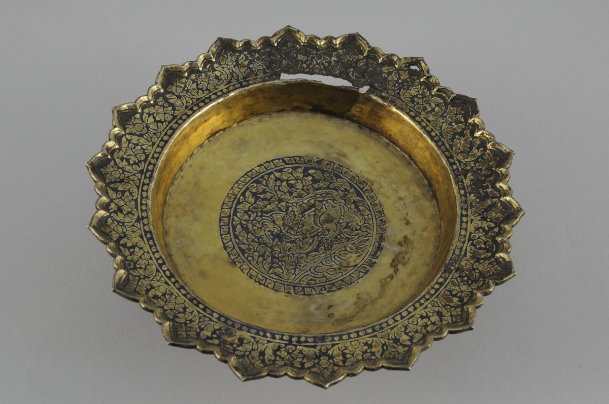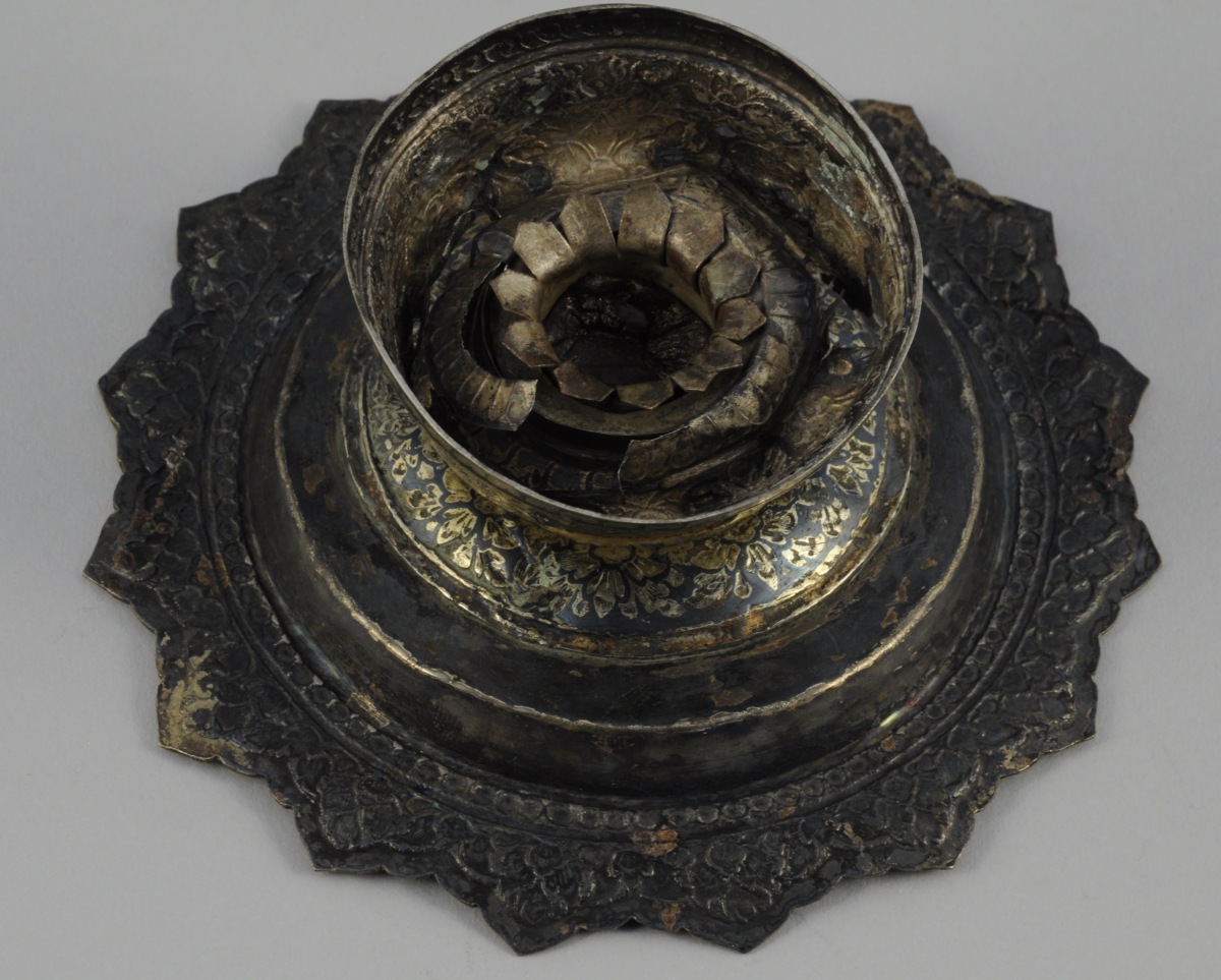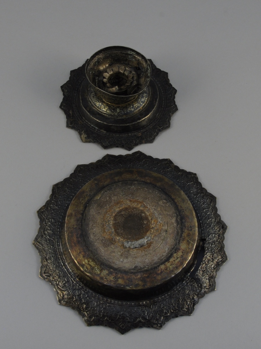 THAÏLANDE. PRÉSENTOIR sur piédouche et son dormant en métal (vermeille ?) à décor niellé de feuilles et fleurs.
