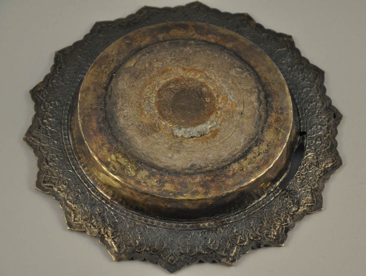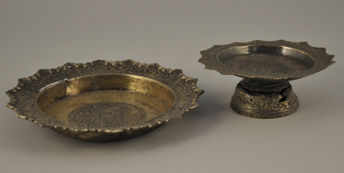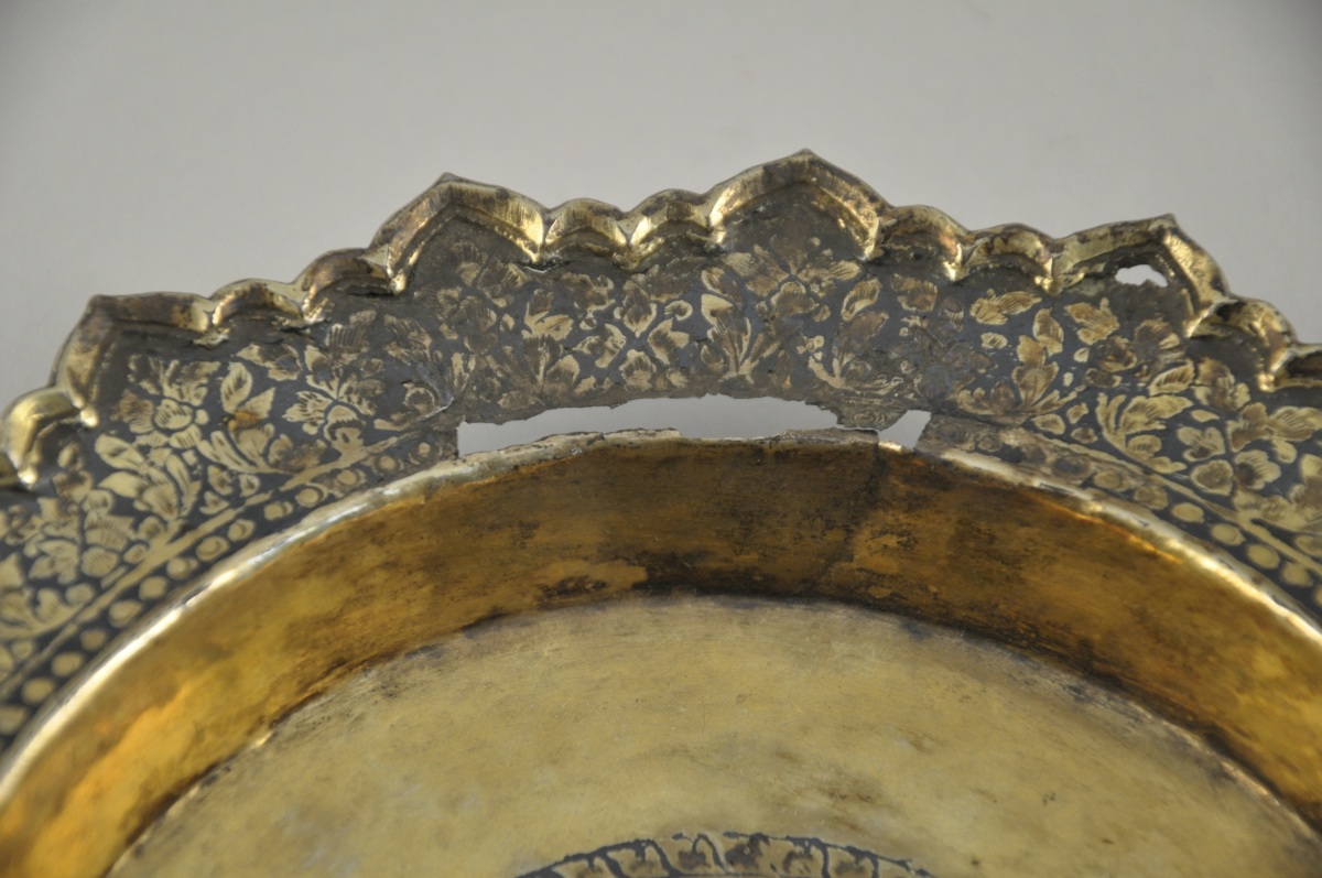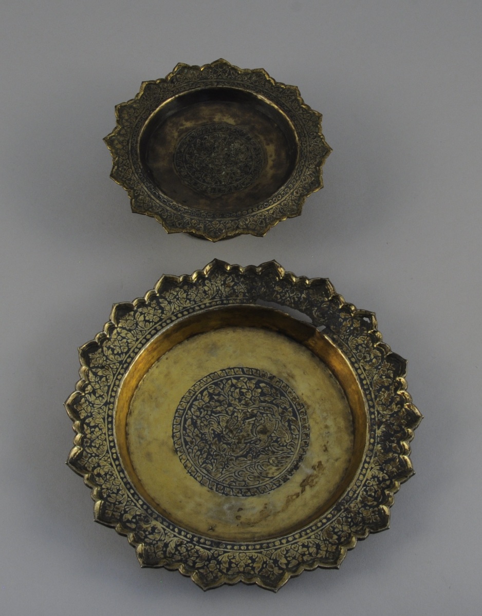 THAÏLANDE. PRÉSENTOIR sur piédouche et son dormant en métal (vermeille ?) à décor niellé de feuilles et fleurs.