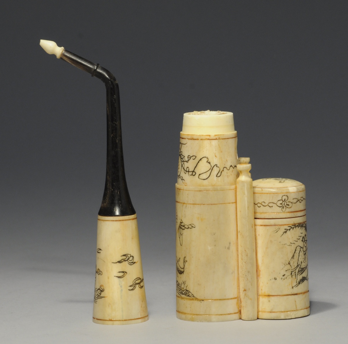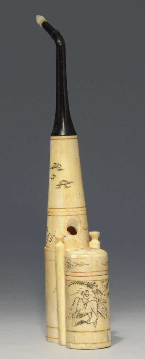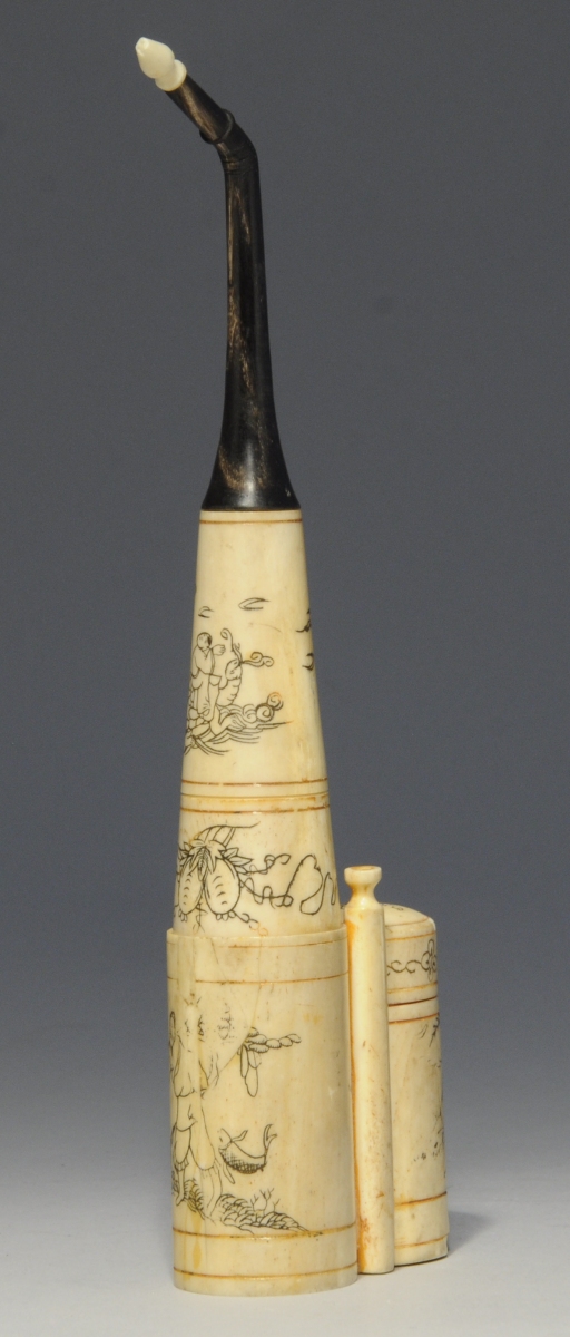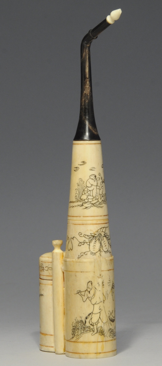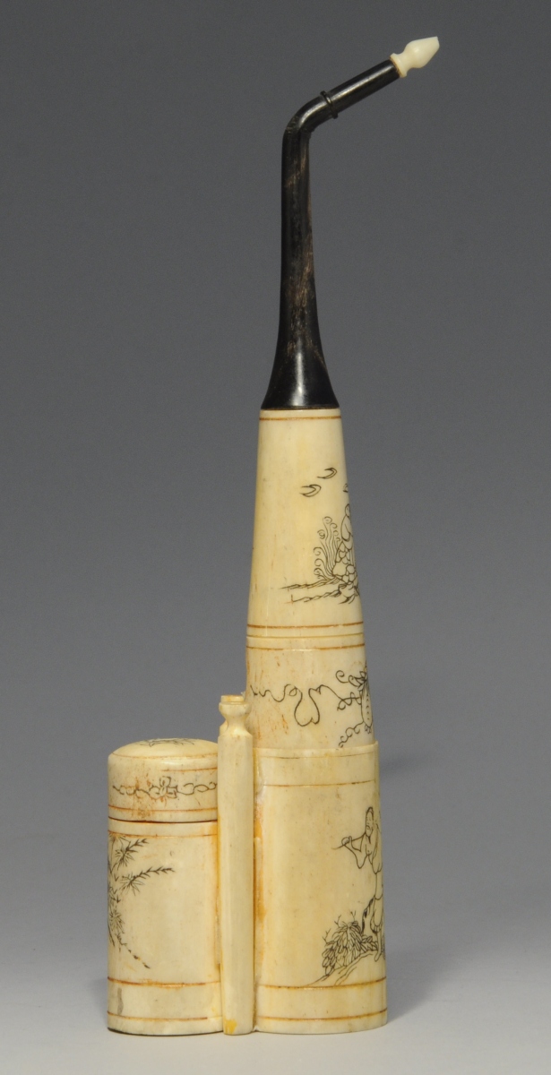 VIETNAM. PIPE À EAU de forme cylindrique en os. Signée