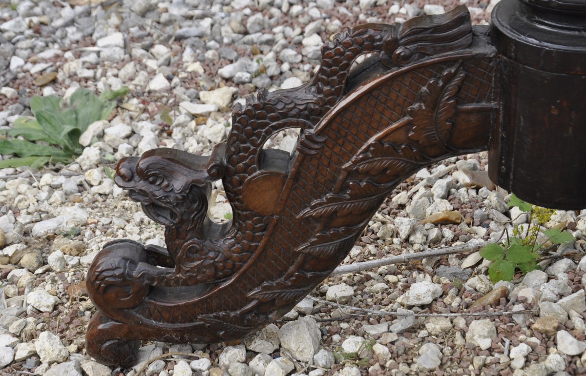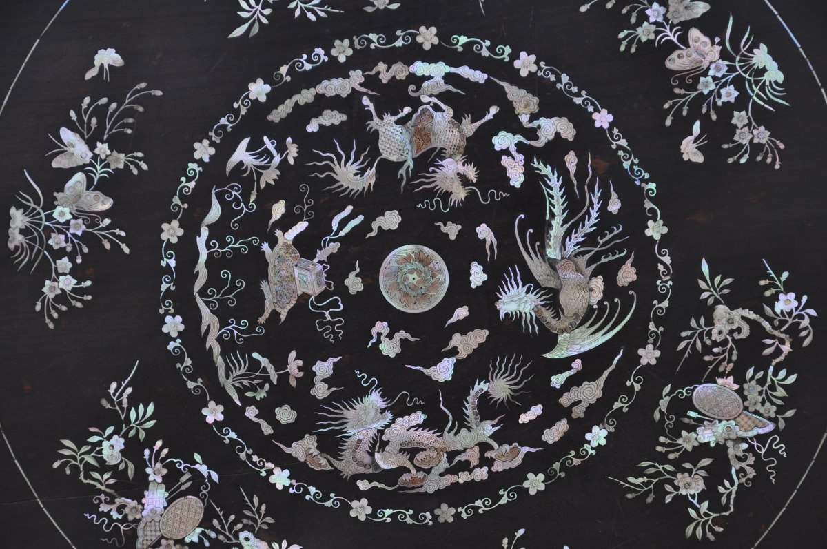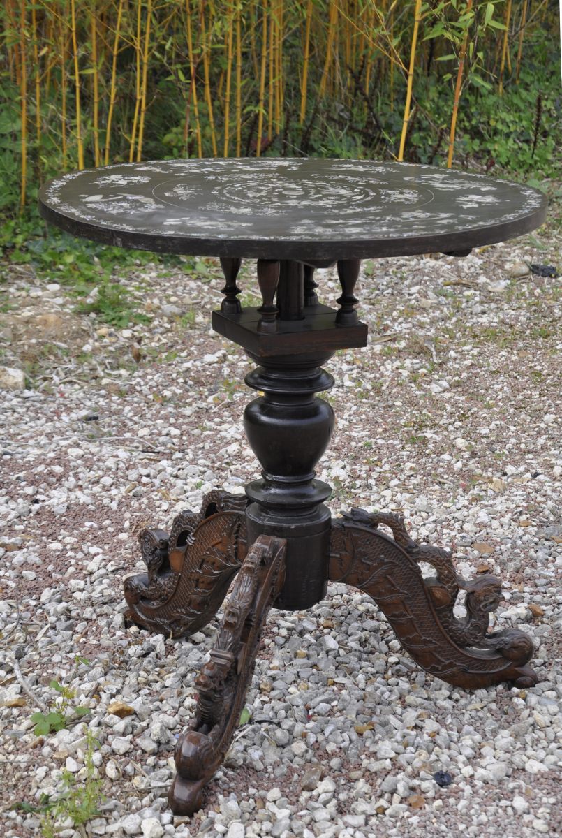 INDOCHINE. GUÉRIDON tripode en bois sculpté. Le plateau rotatif de forme circulaire richement incrusté de scènes paysagées, papillons, motifs végétaux et créatures fabuleuses. Pieds cambrés sculptés et ajourés d'un dragon enserrant la perle sacrée et de feuillages stylisés.