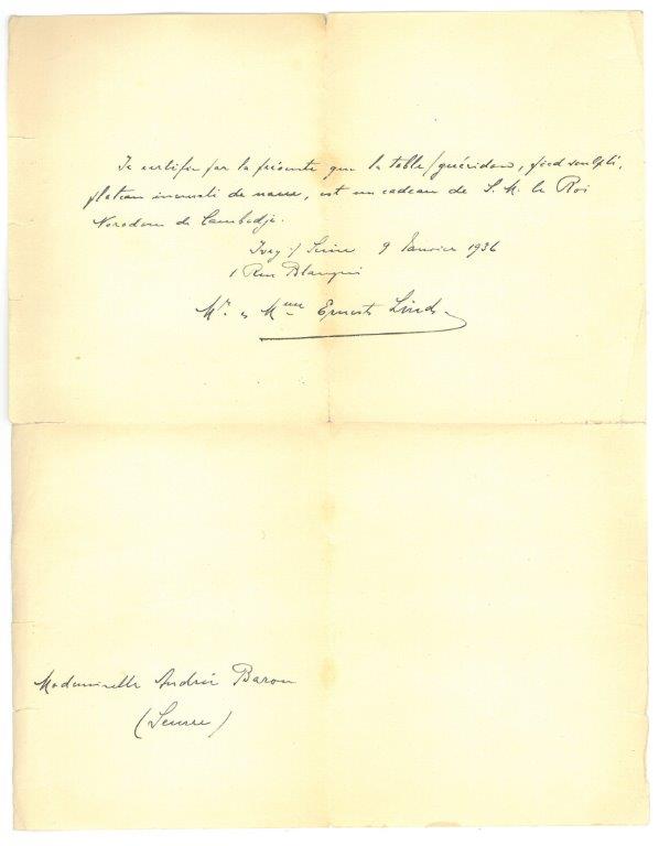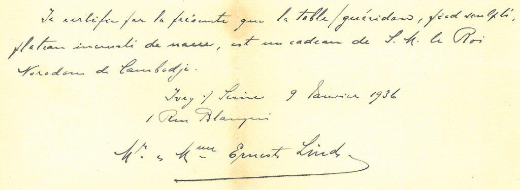 Provenance : offert en cadeau par S. M. le roi Norodom du Cambodge.