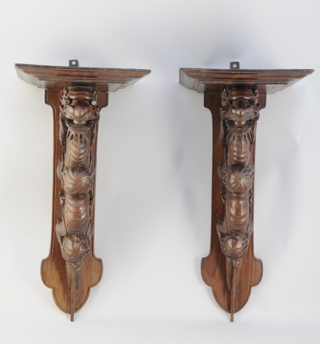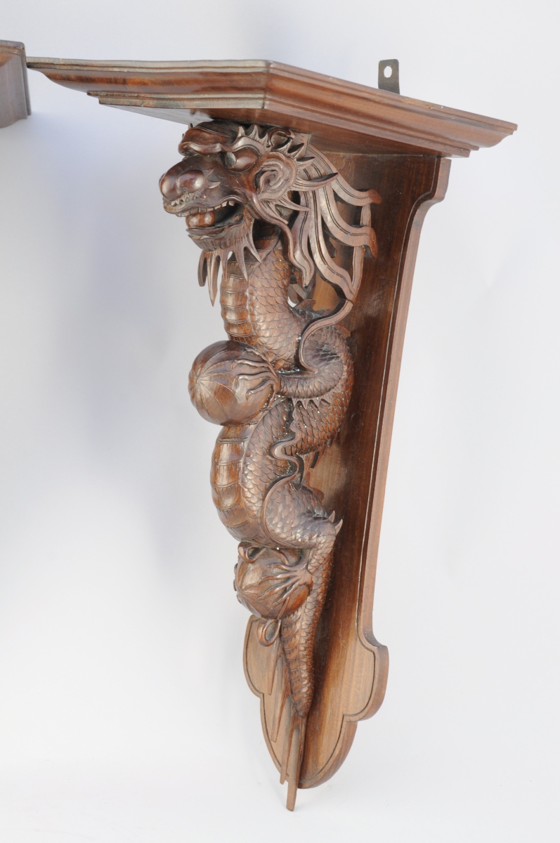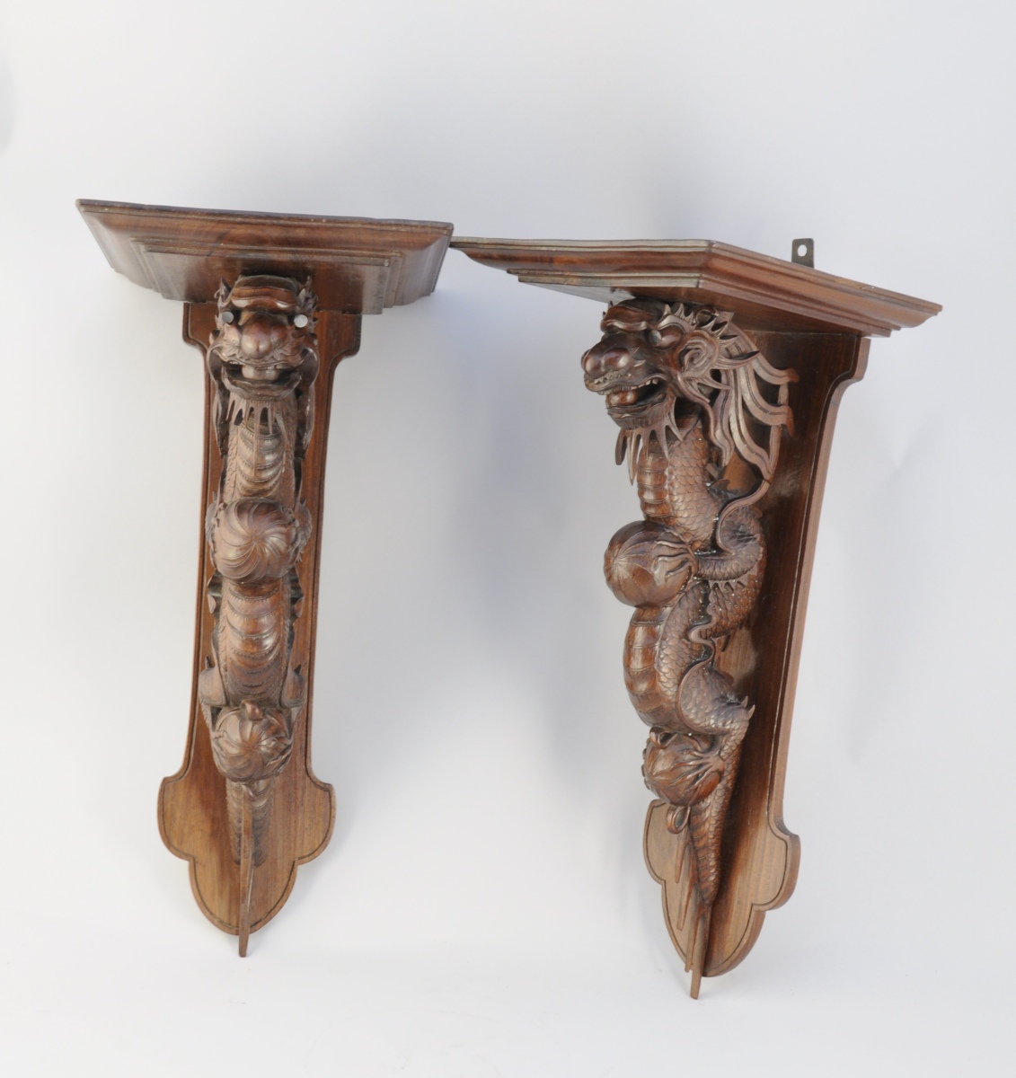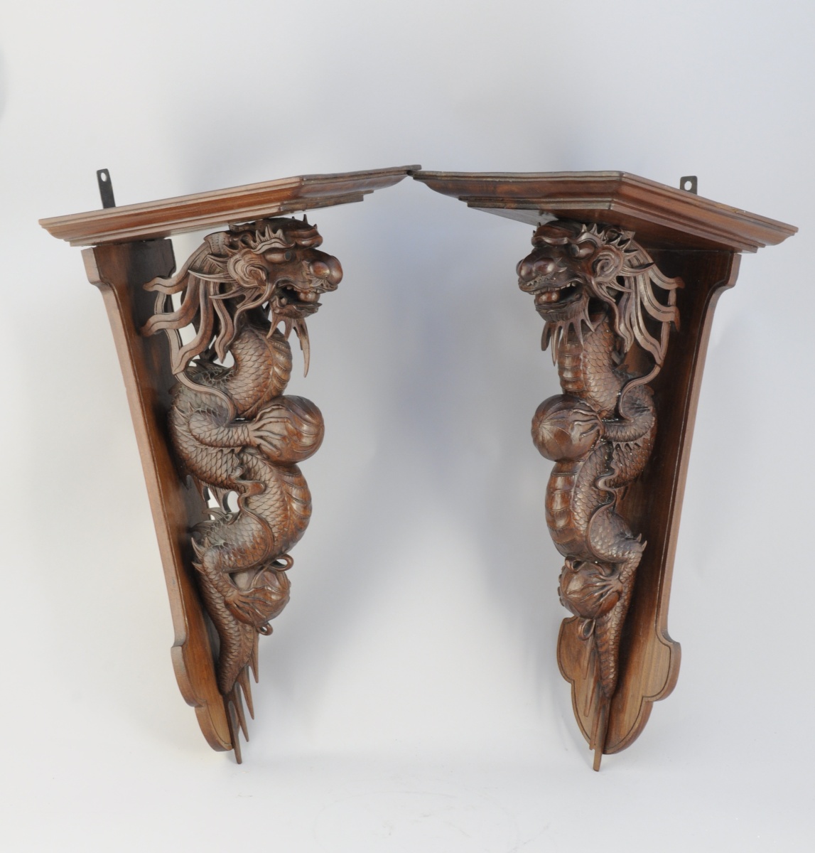 - Paire de CONSOLES D'APPLIQUE en teck sculpté et ajouré figurant un dragon enserrant deux perles sacrées.