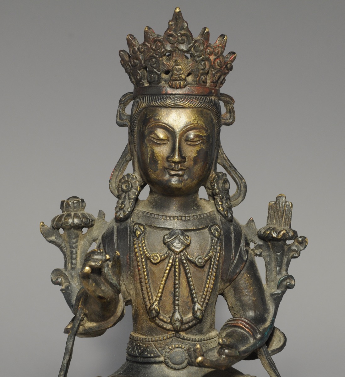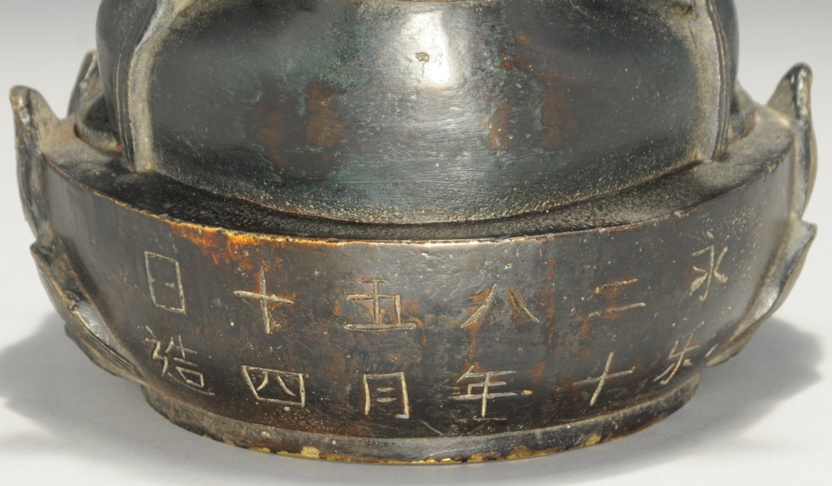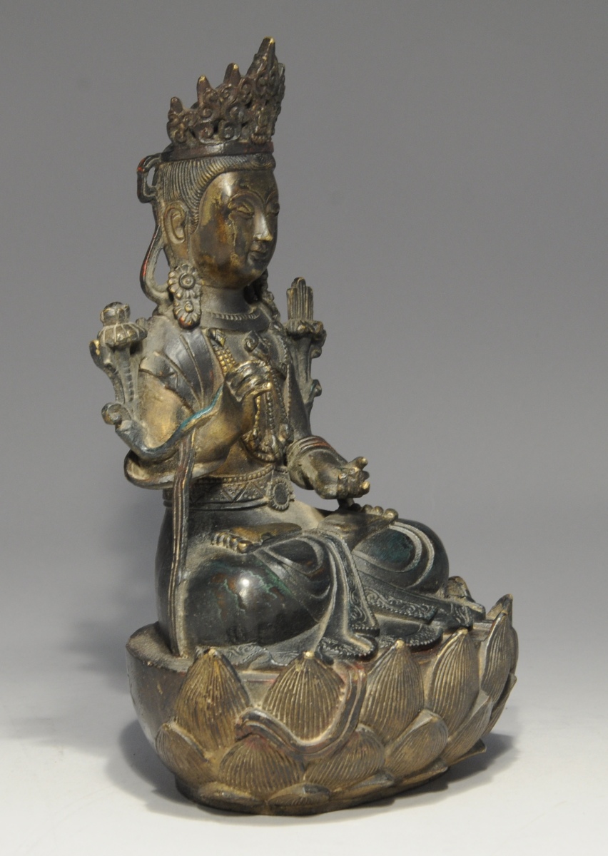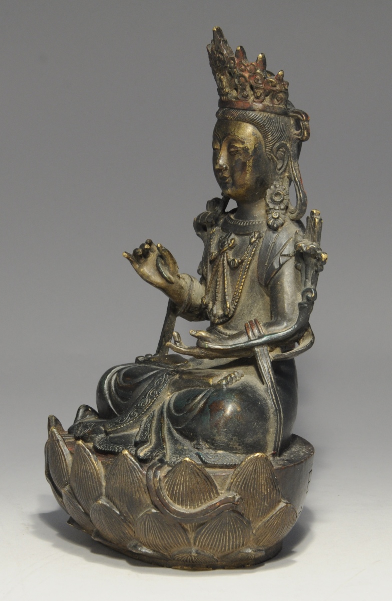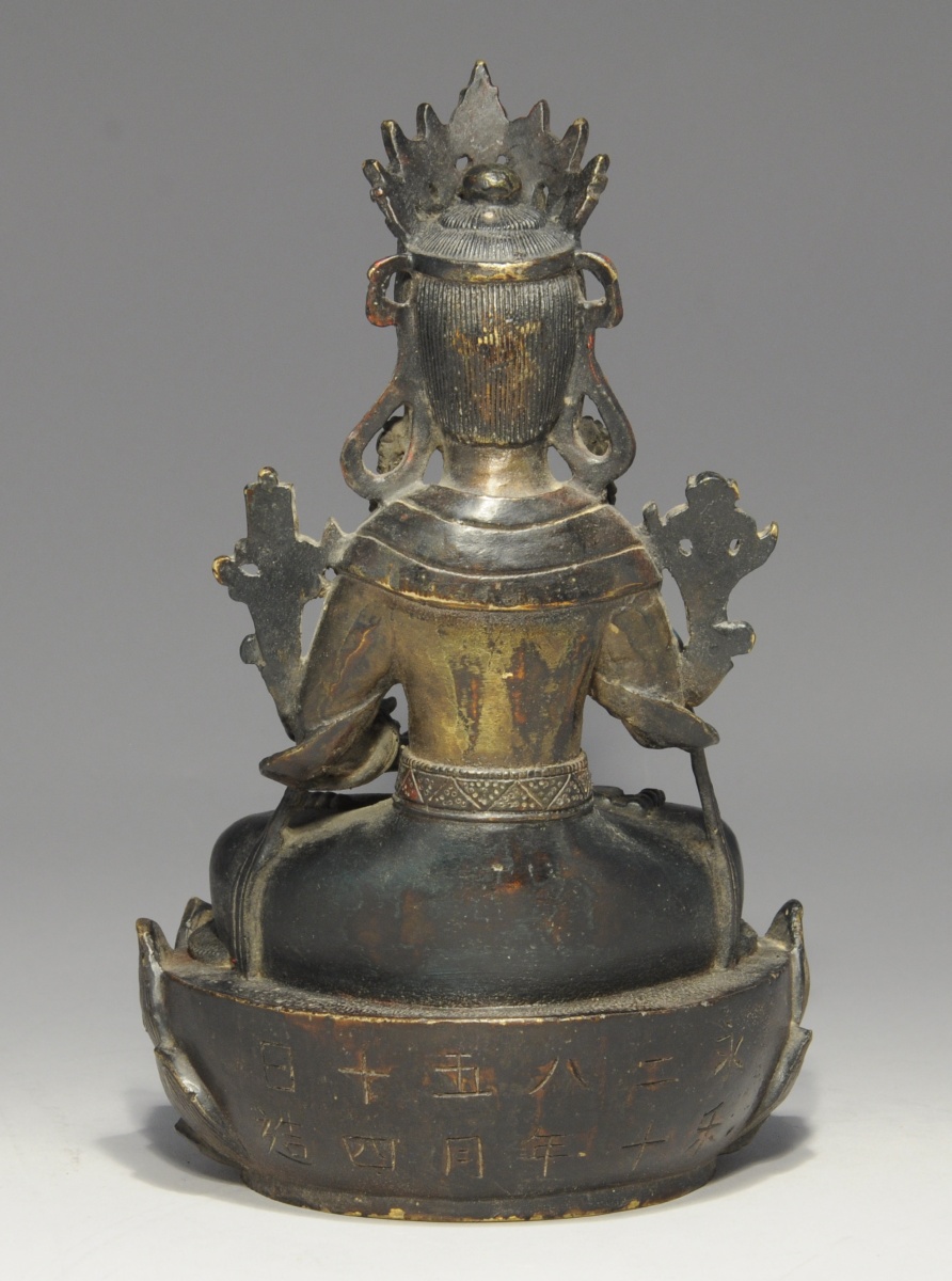 CHINE. BODHISATTVA en bronze, assis en padmasana sur un socle loti forme et tenant un lotus. Inscription apocryphe : "vingt-huit ans de Yongle ".