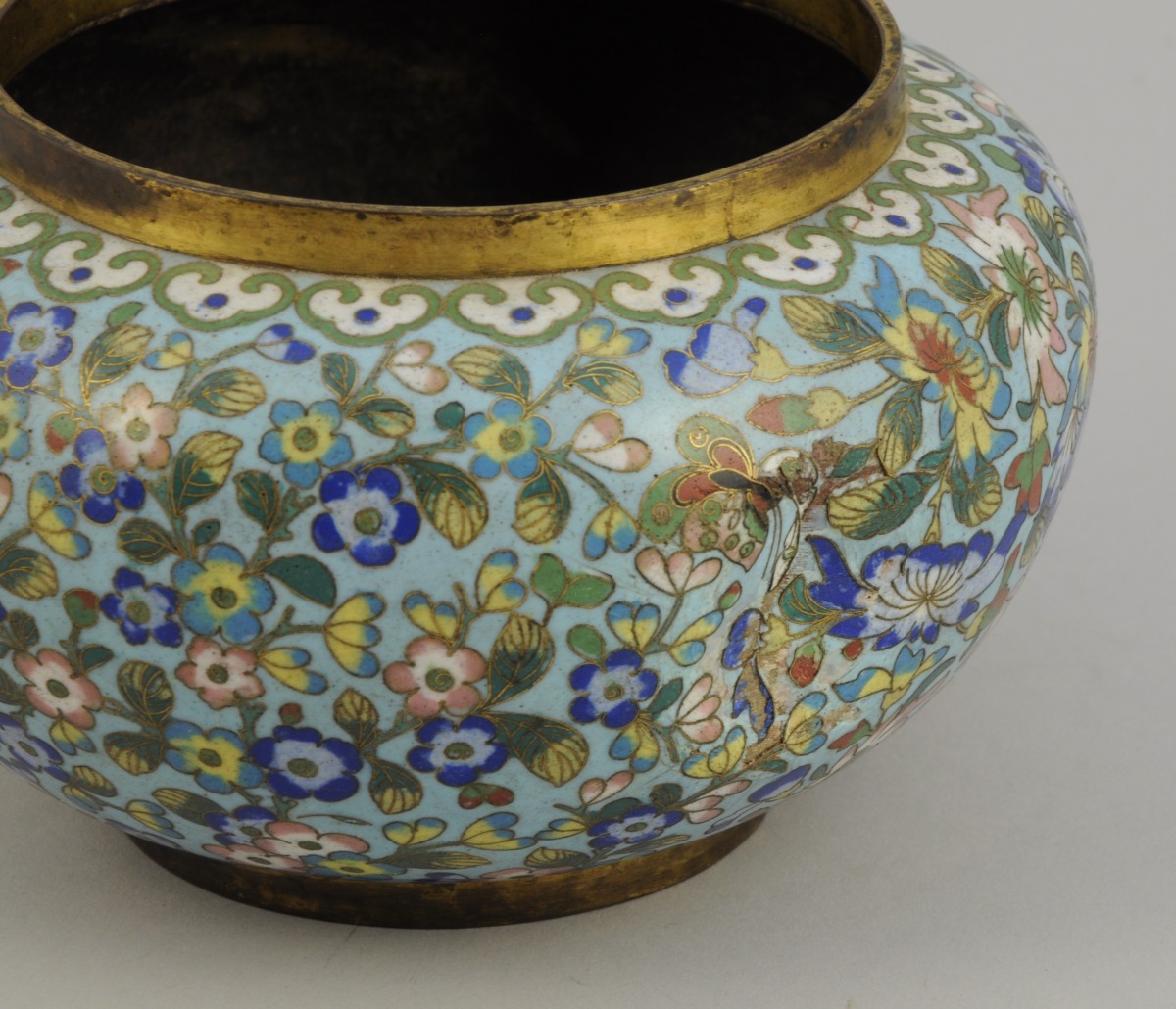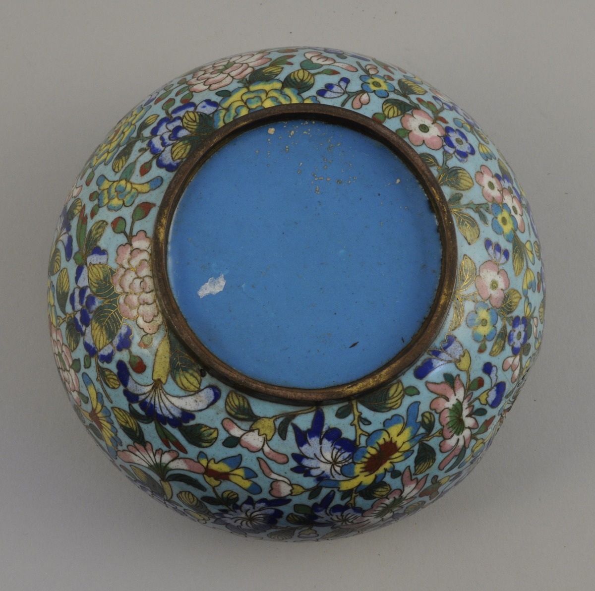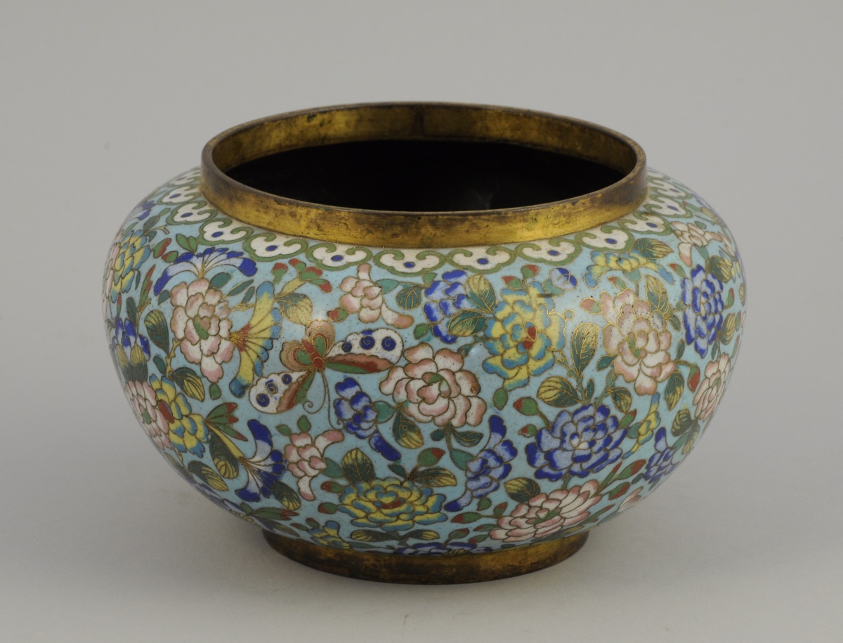 CHINE. POT circulaire en émaux polychromes cloisonnés à motifs de pivoines et de feuillages sur fond bleu.