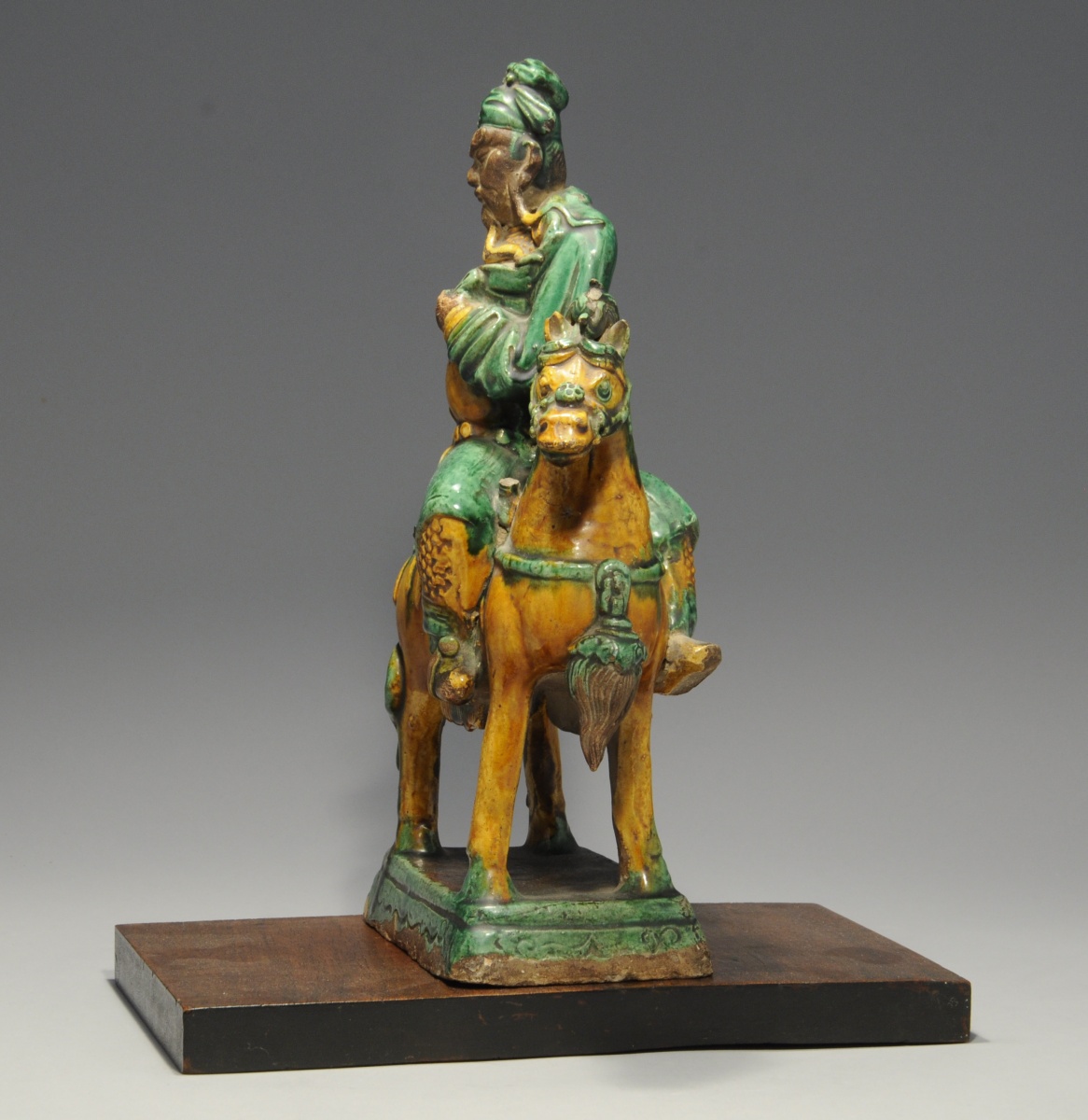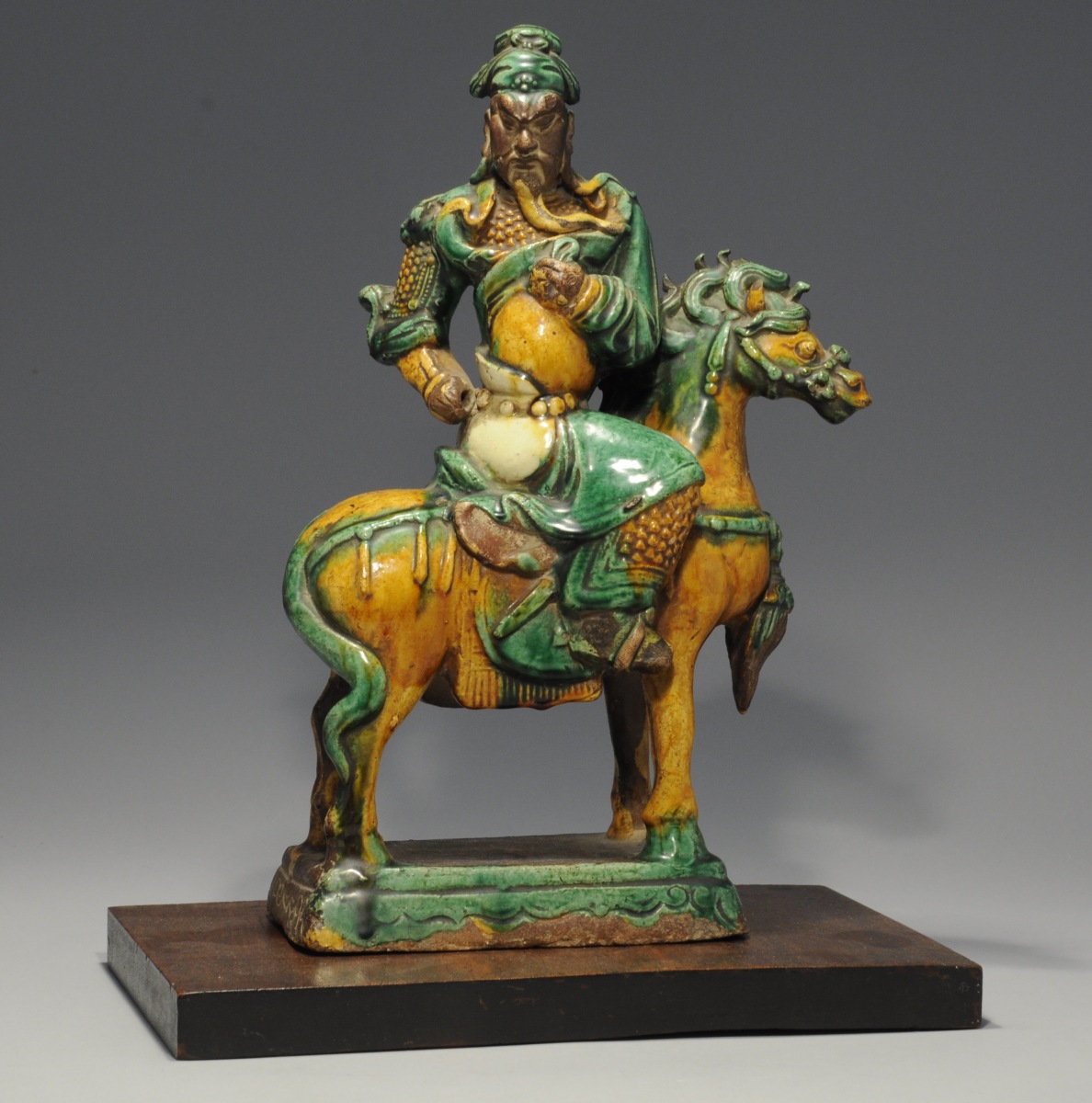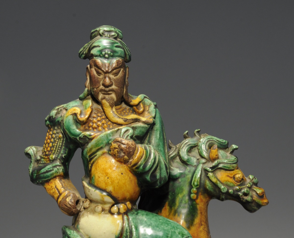 CHINE. SATUETTE de GUANDI À CHEVAL en grès émaillé jaune et vert.