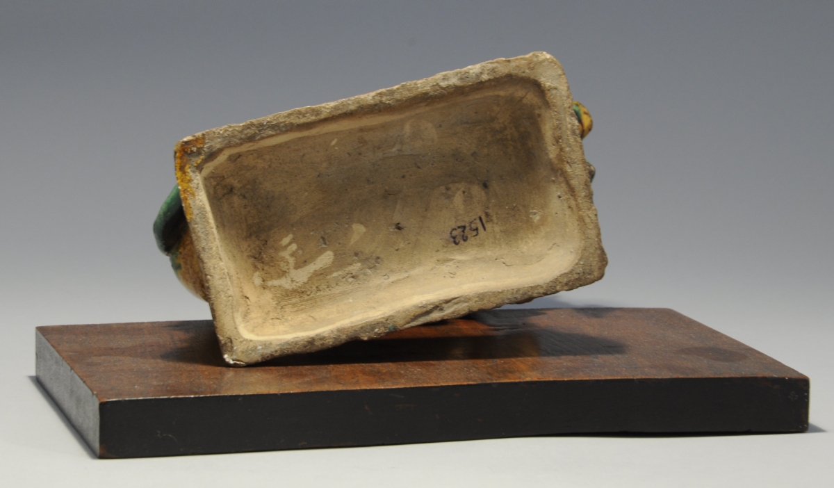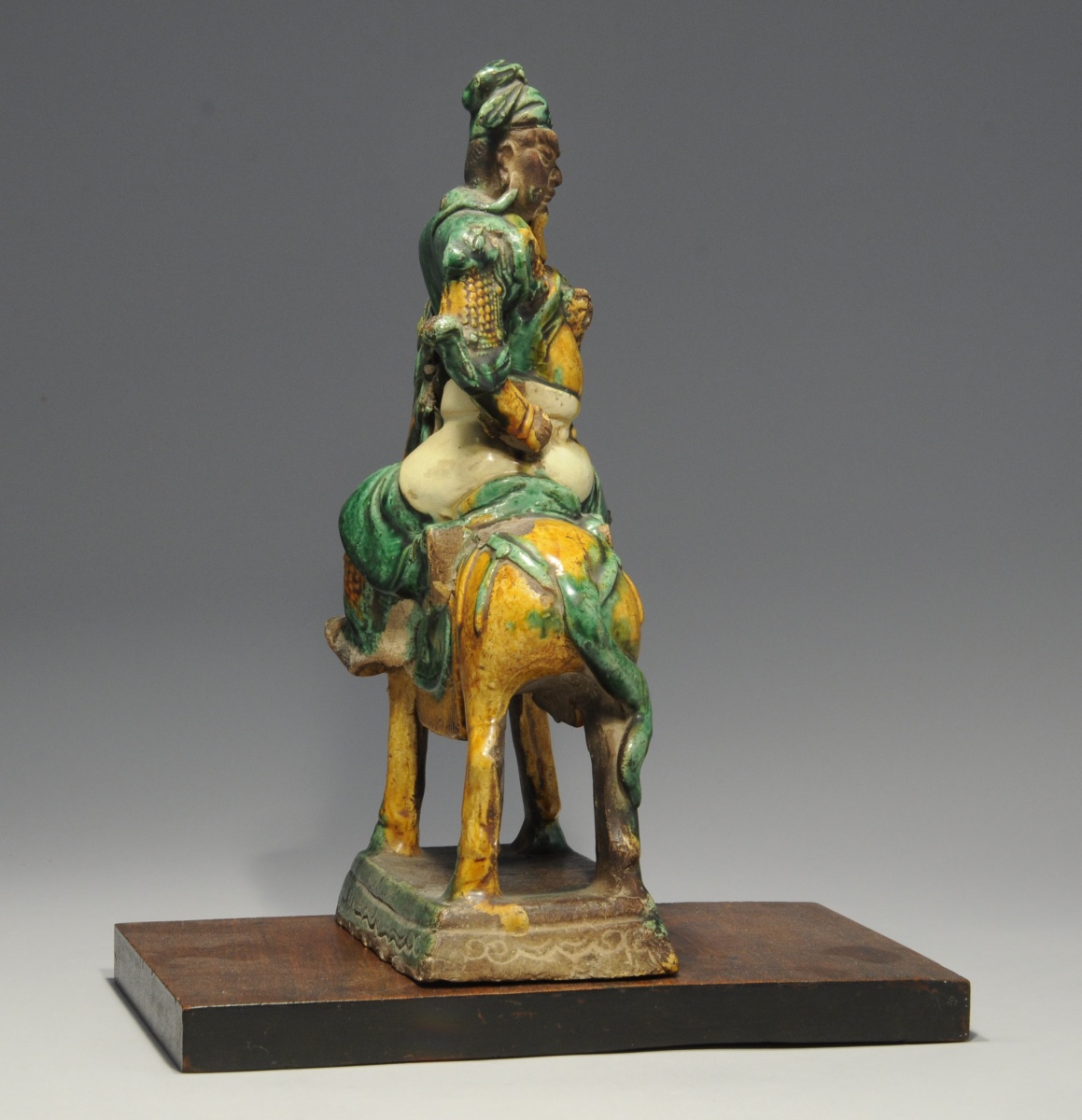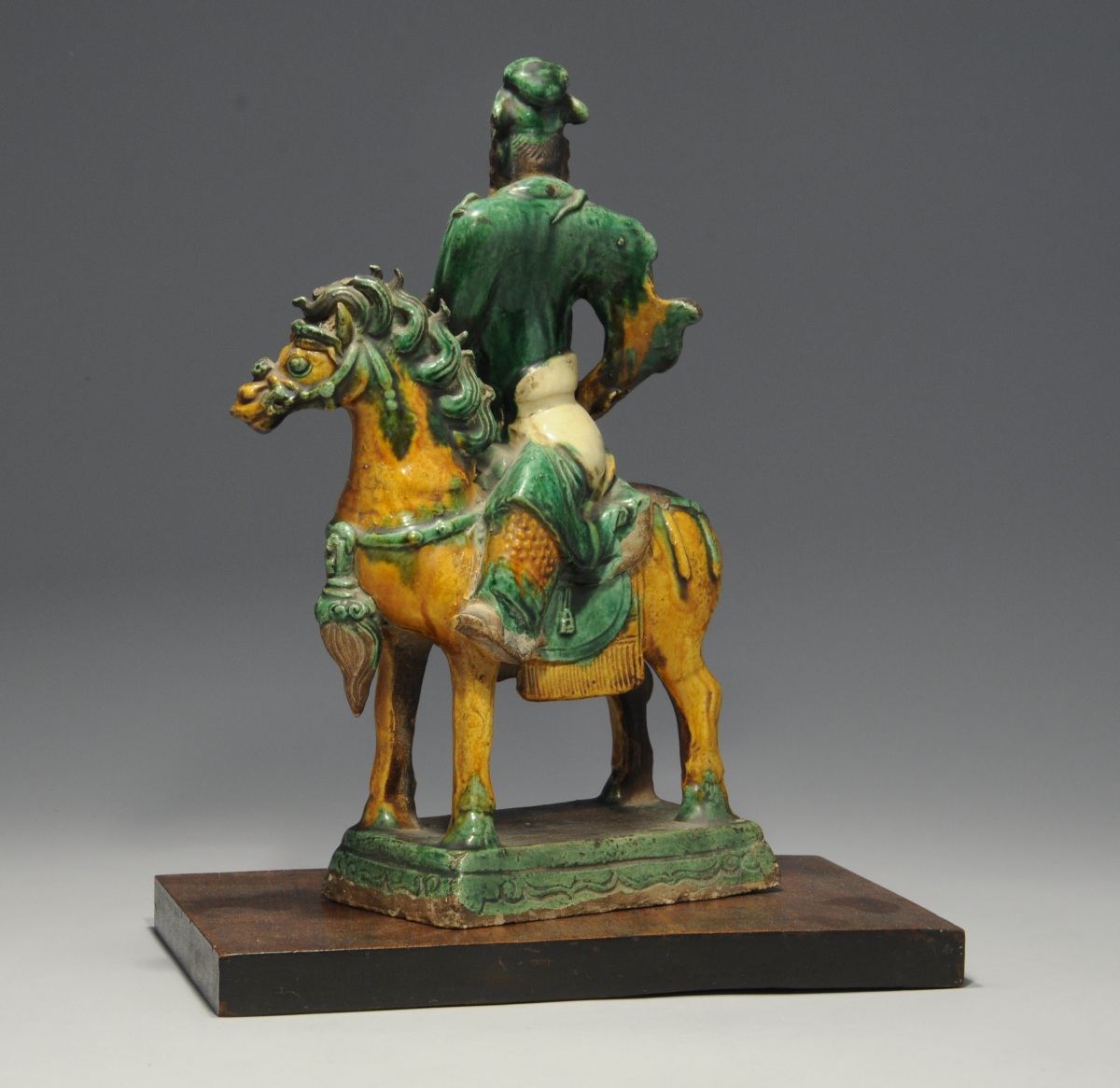 CHINE. SATUETTE de GUANDI À CHEVAL en grès émaillé jaune et vert.