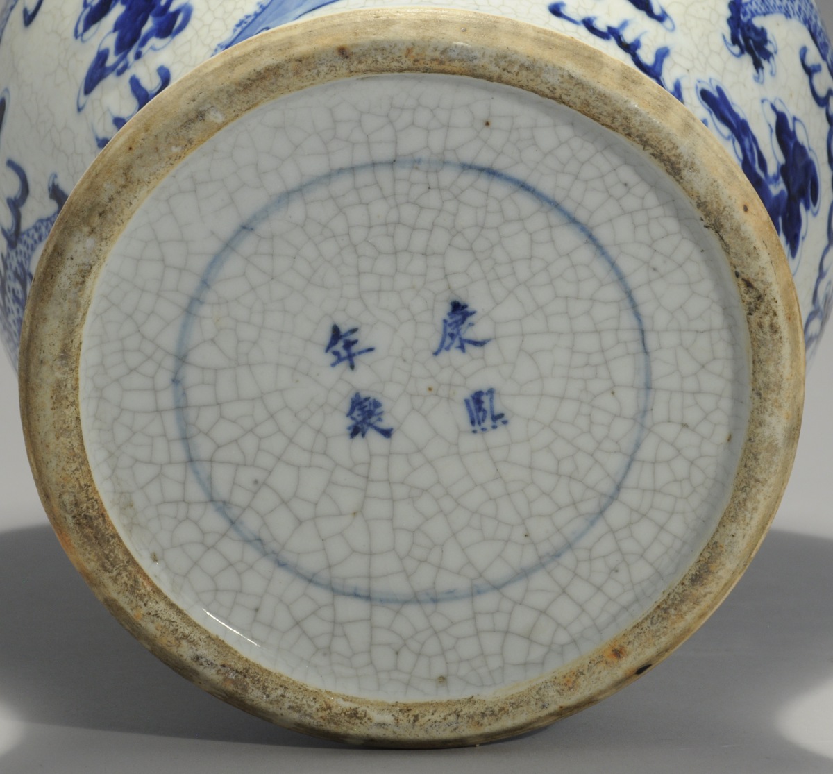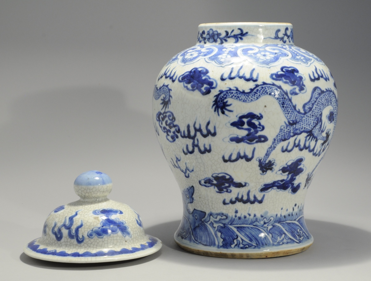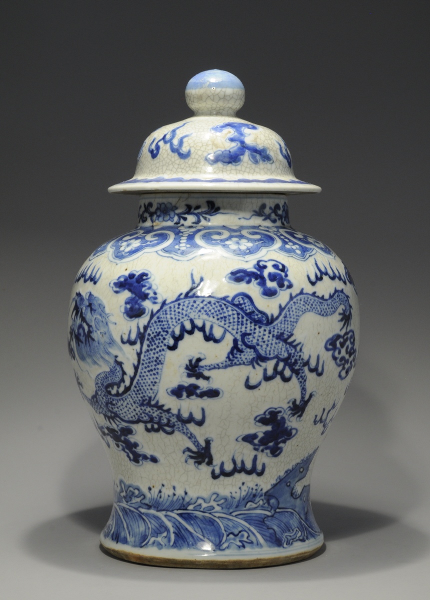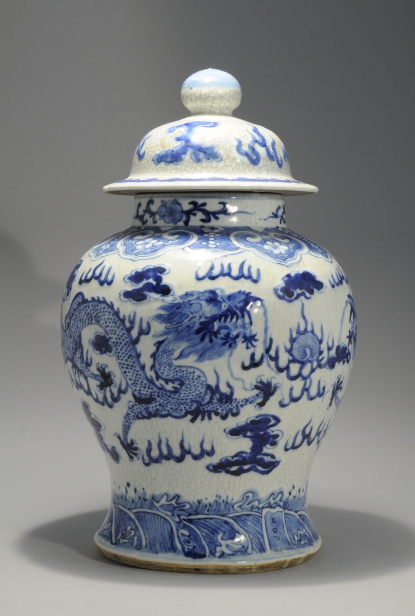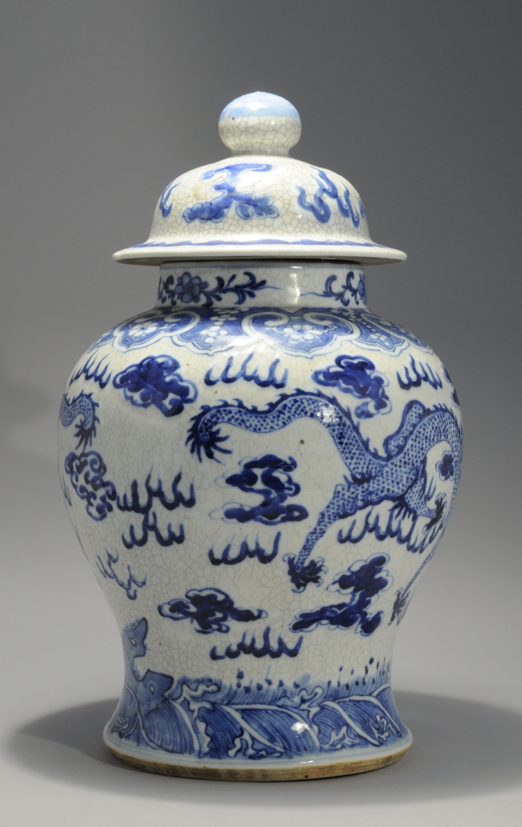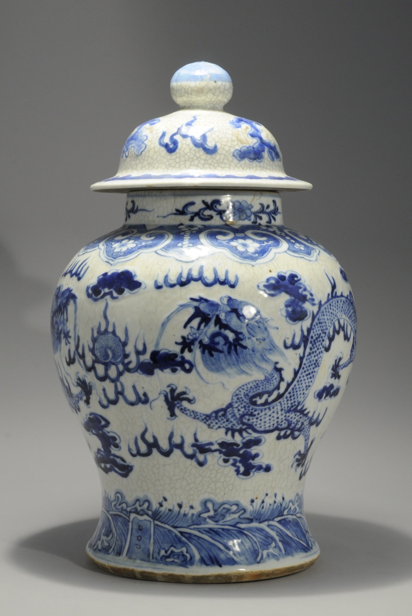CHINE. VASE COUVERT de forme balustre en porcelaine à décor émaillé bleu de dragons. Fond craquelé. Marque apocryphe Kangxi, fin XIXe.