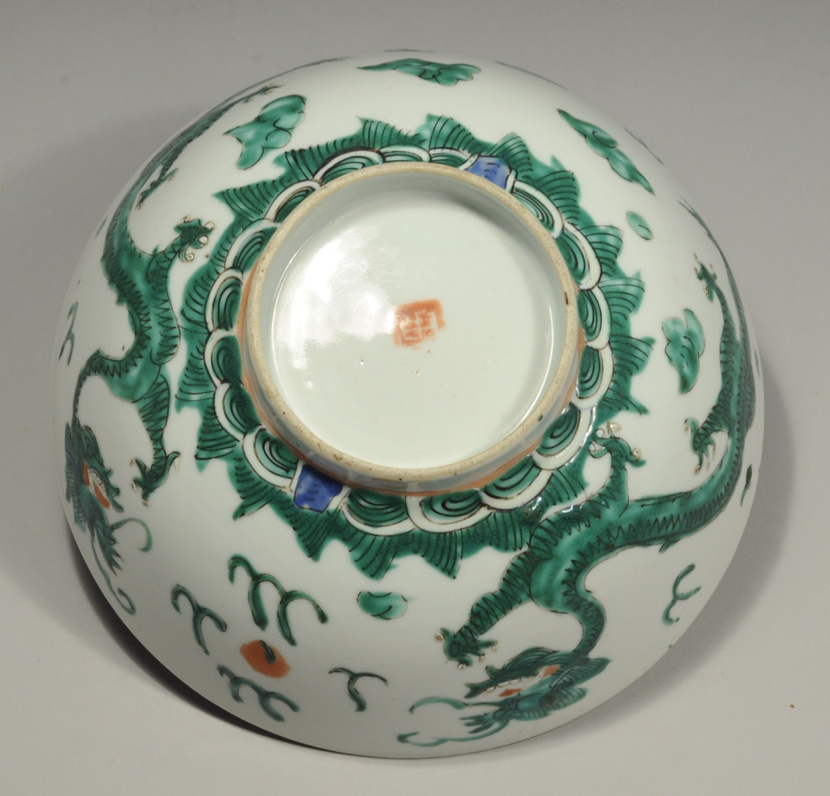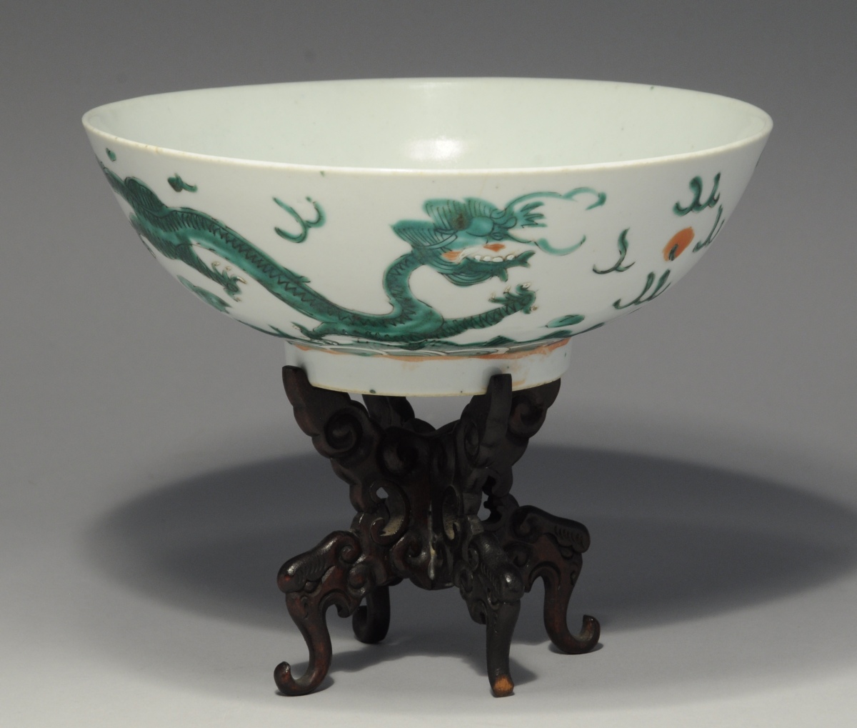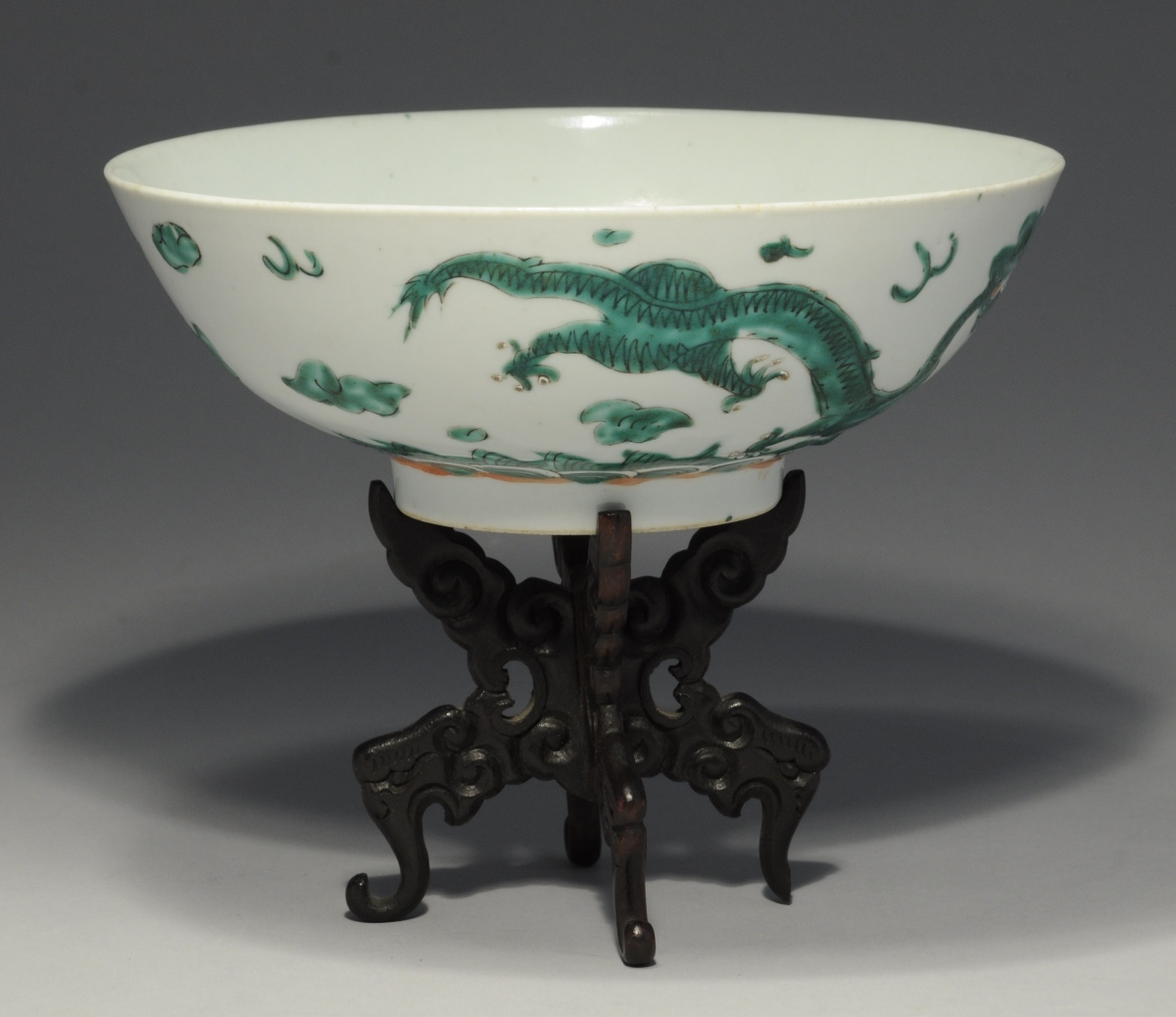 CHINE. COUPE sur talon en porcelaine à décor émaillé vert de dragons dans des nuées.