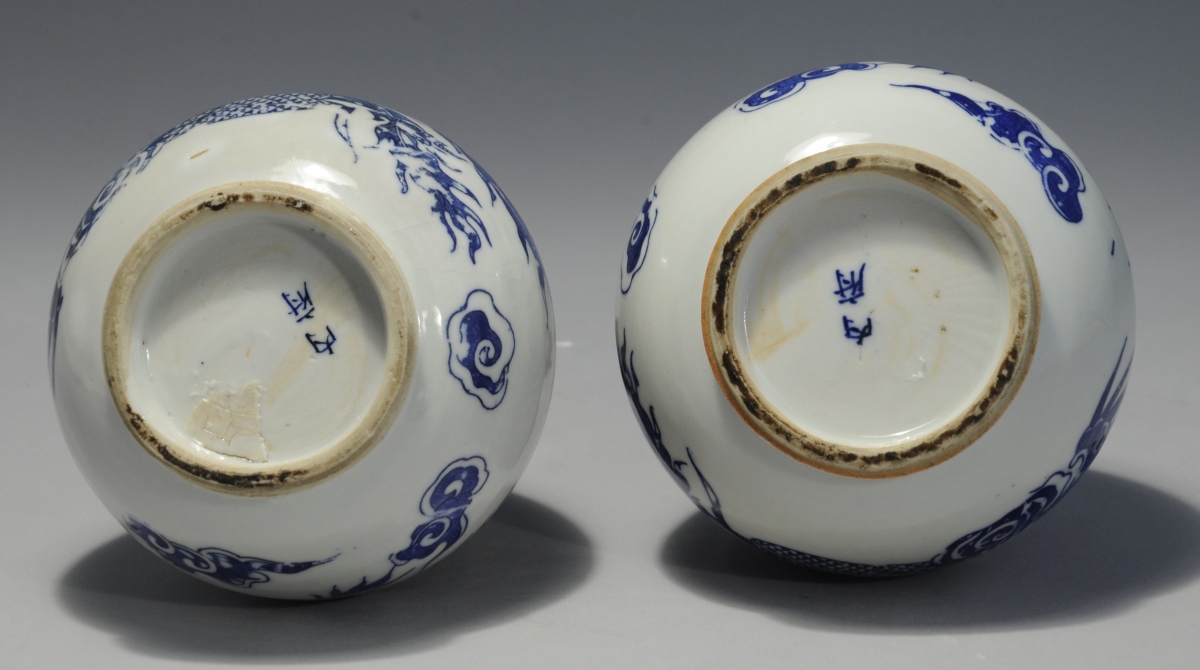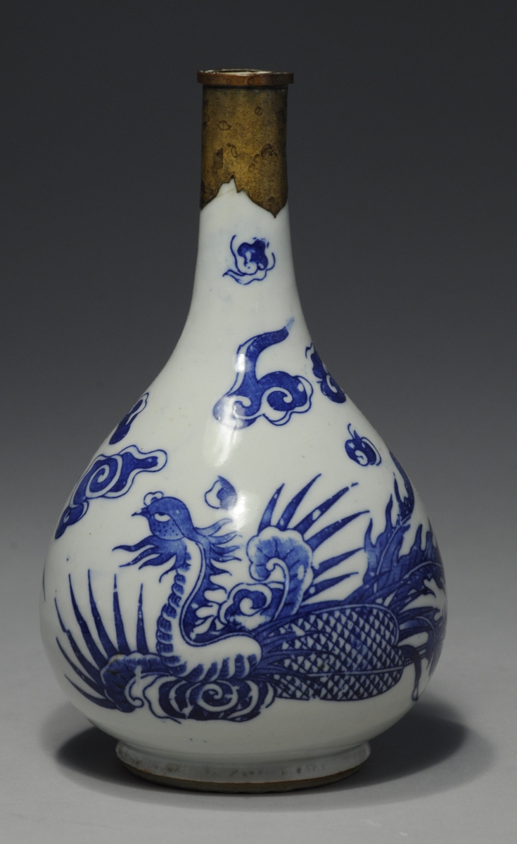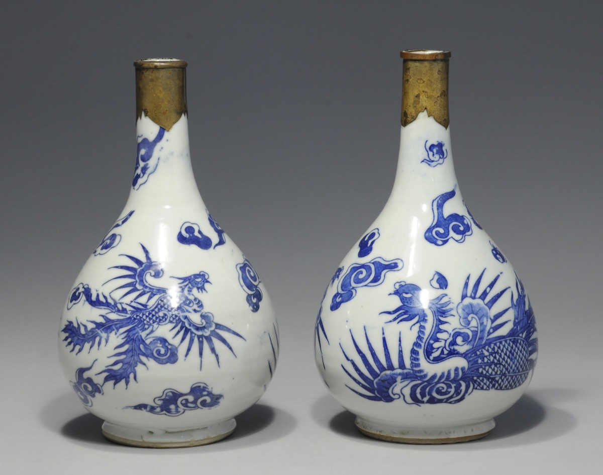 JOINT : VIETNAM. PAIRE de VASES piriforme en porcelaine à décor bleu fait au pochoir de phoenix et de nuages. Le col monté de laiton.