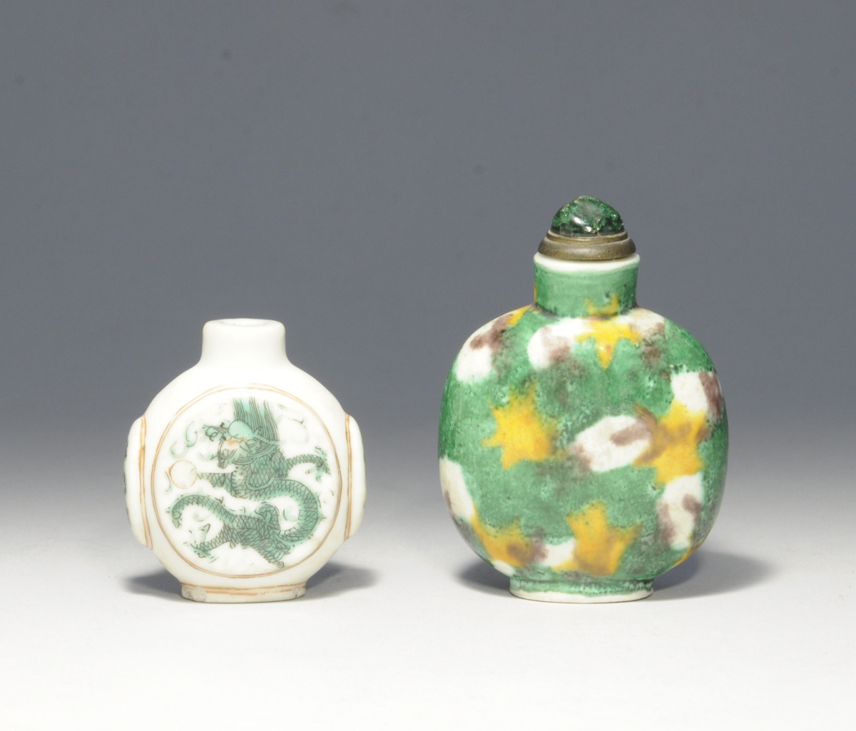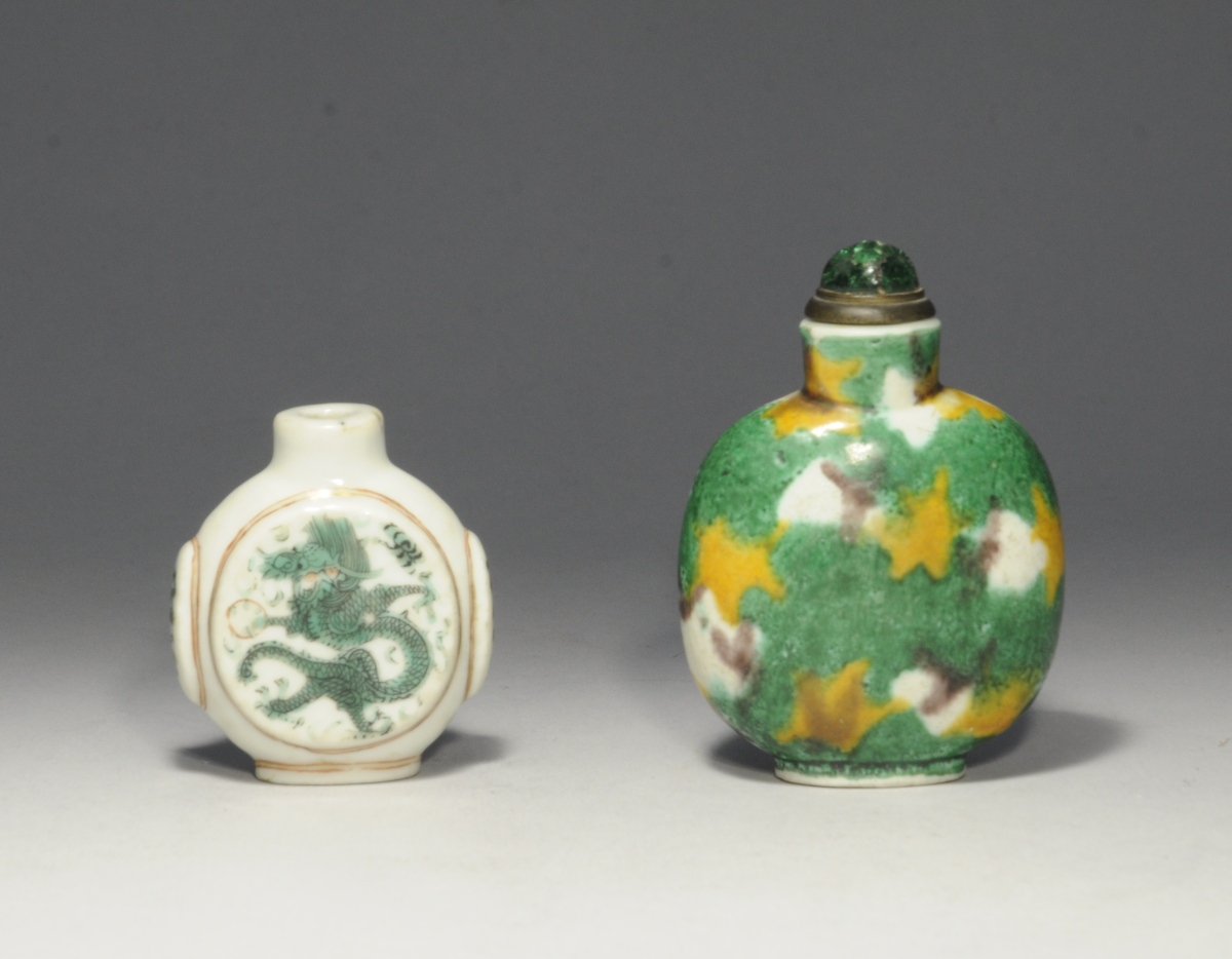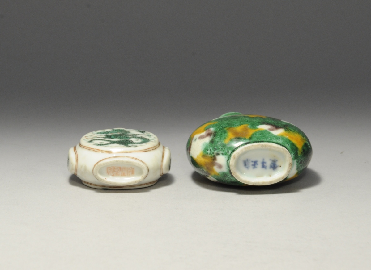 CHINE. Deux FLACONS TABATIÈRES en porcelaine polychrome. Marques. XIXe.