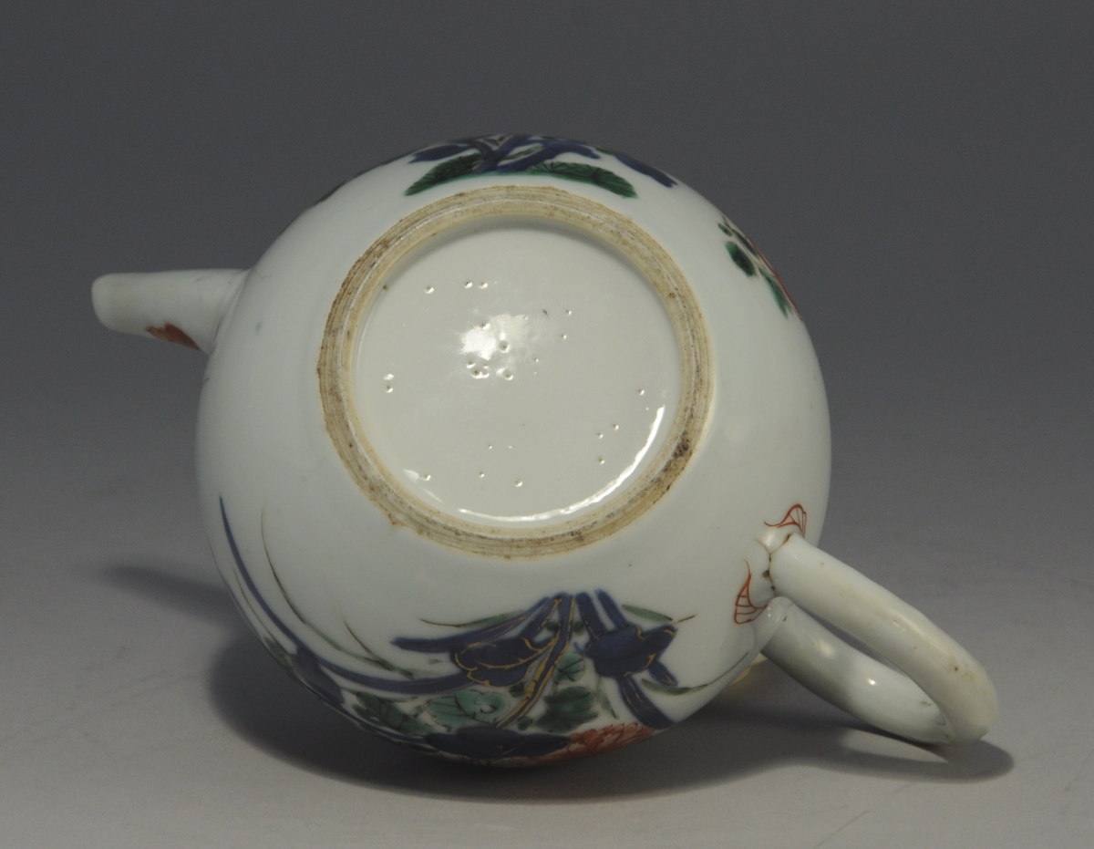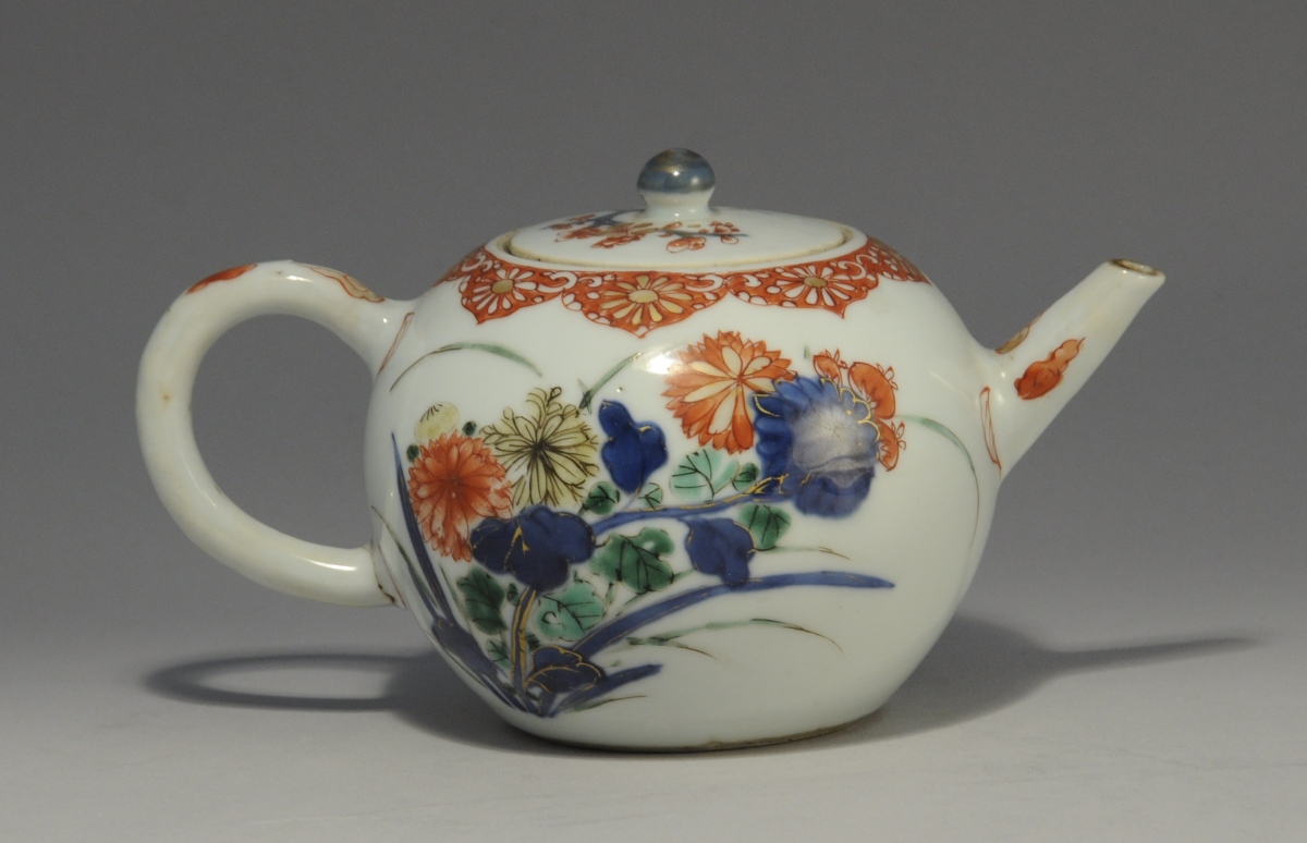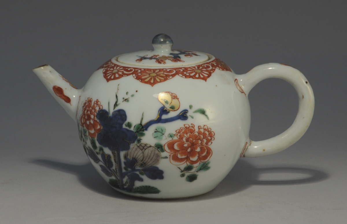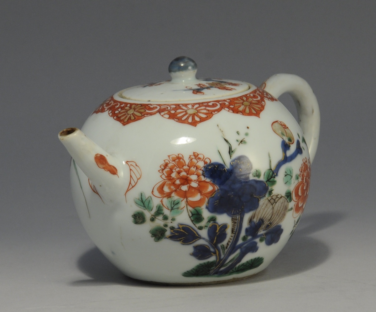 CHINE. THÉIÈRE en porcelaine à décor polychrome et or d'un bouquet de chrysanthèmes, d'une frise fleurie et d'une branche de cerisier en fleurs sur le couvercle.