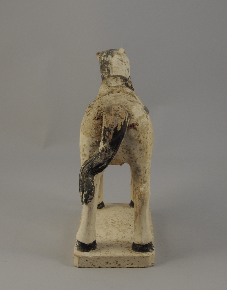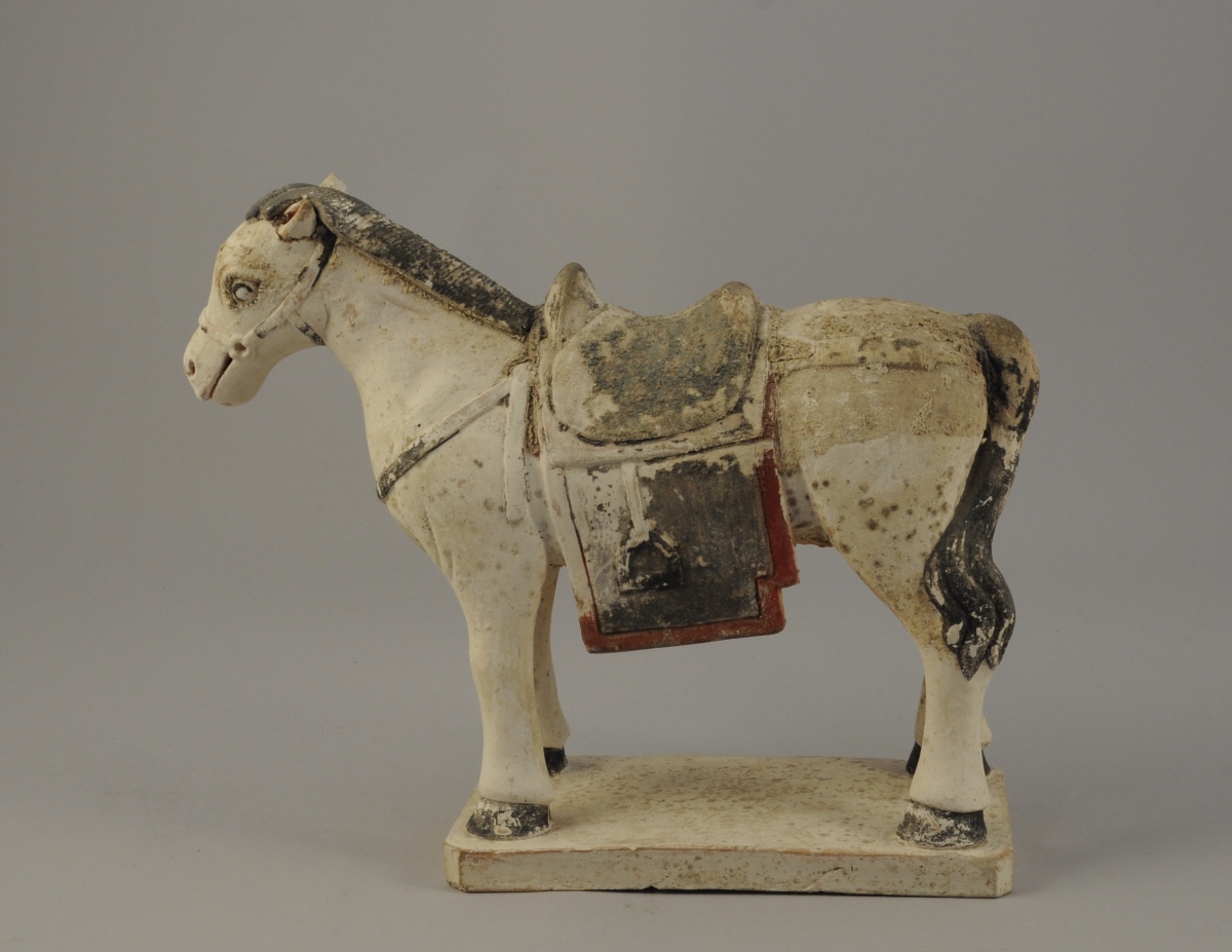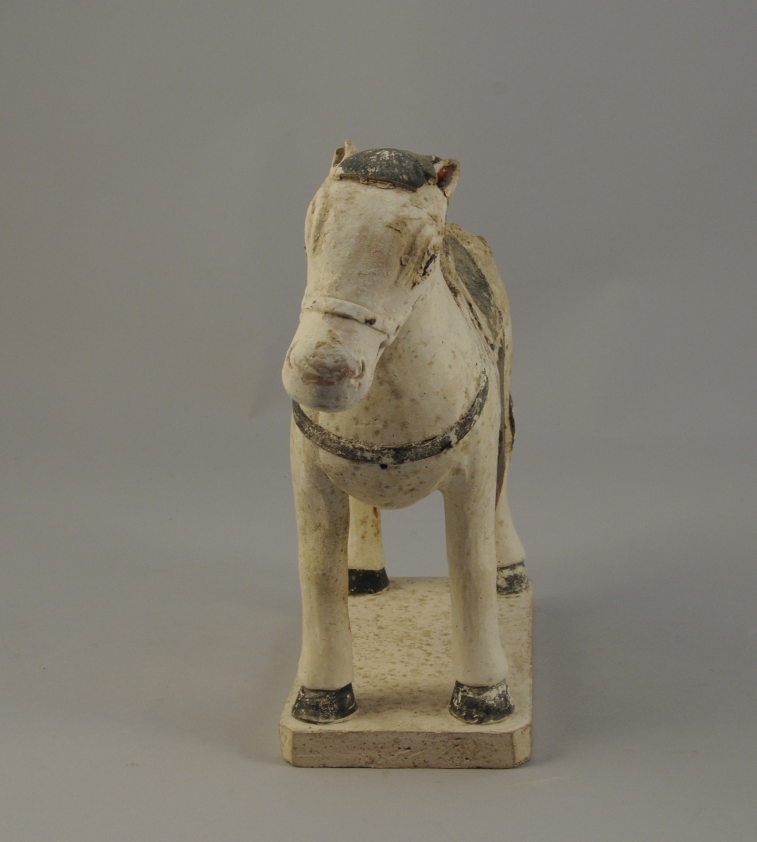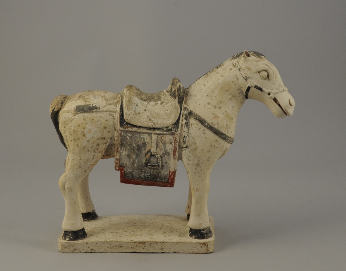 CHINE. STATUETTE DE CHEVAL debout HARNACHÉ en terre cuite à trace de polychromie.