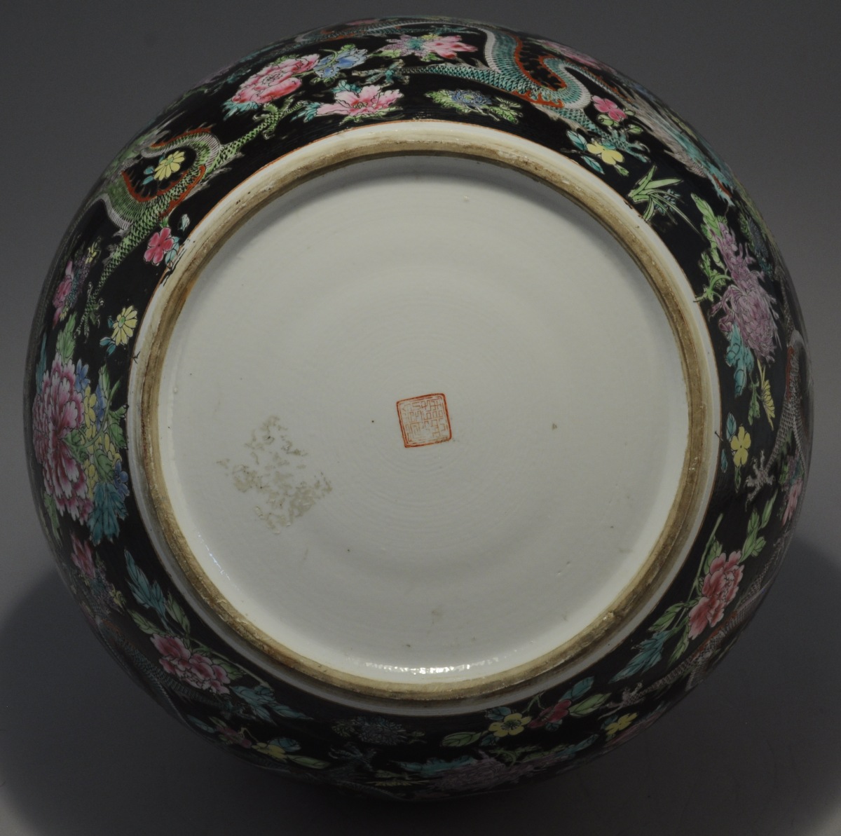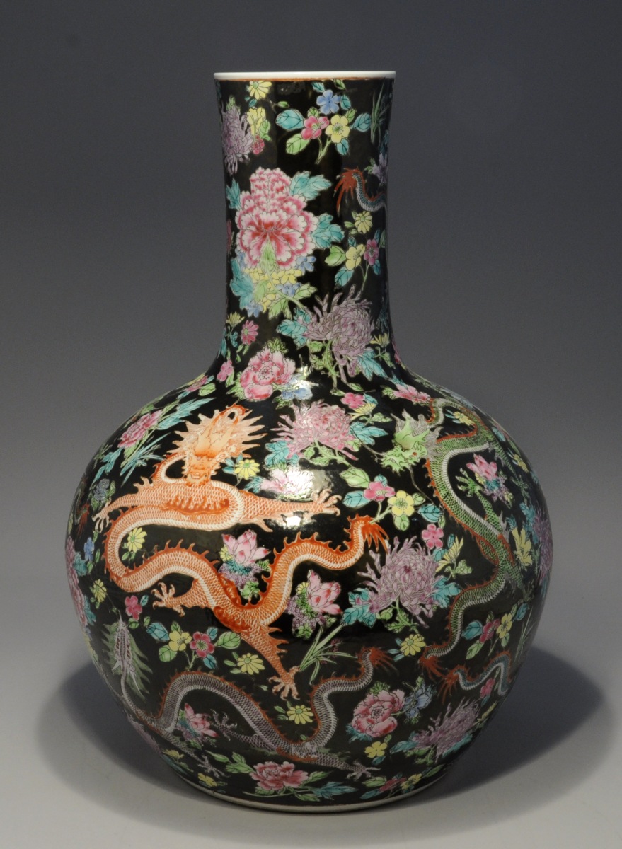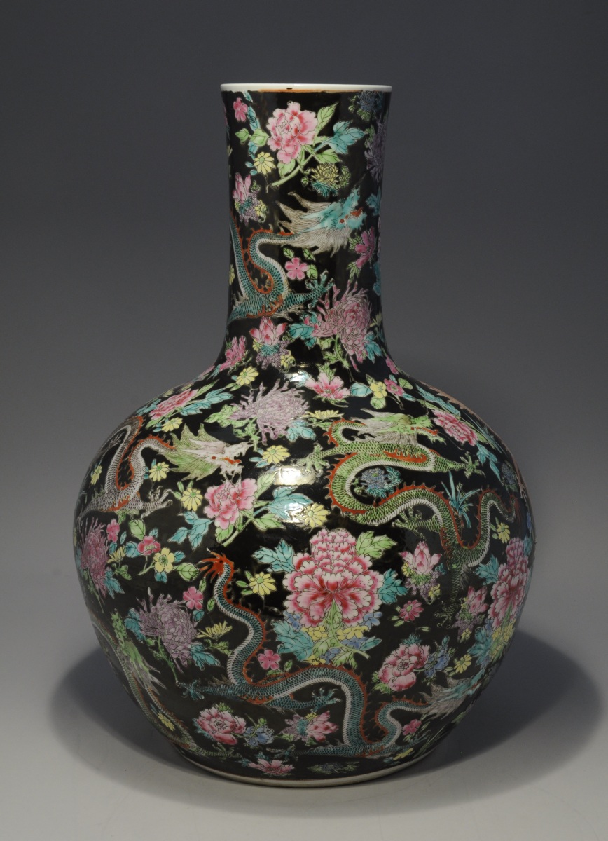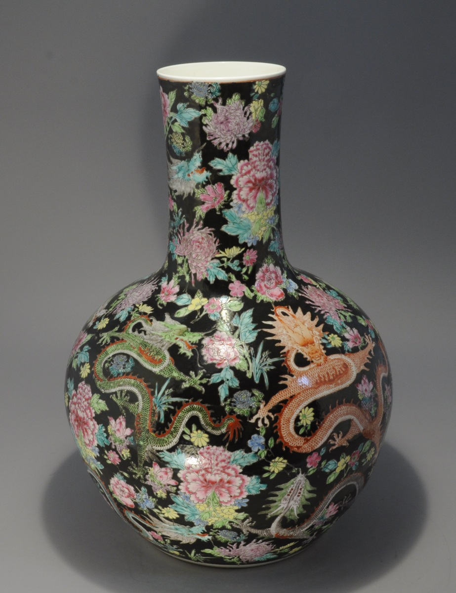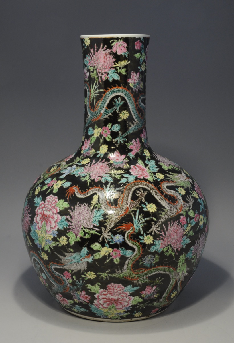 CHINE. VASE balustre à large panse et haut col en porcelaine à décor polychrome de dragons et de fleurs sur fond noir.