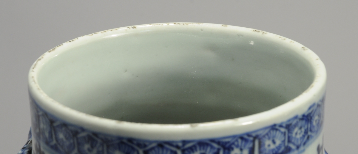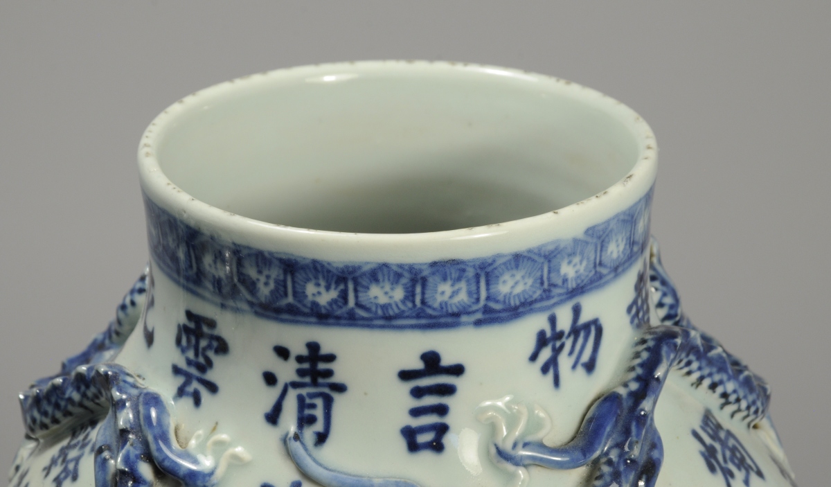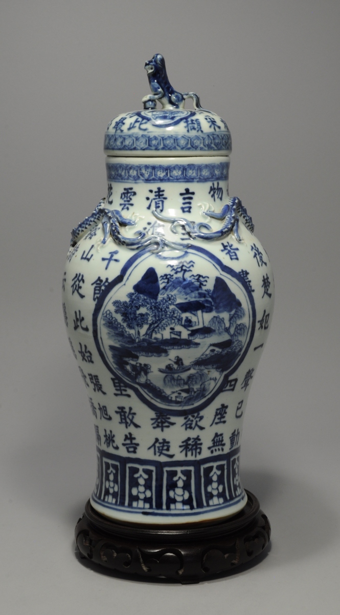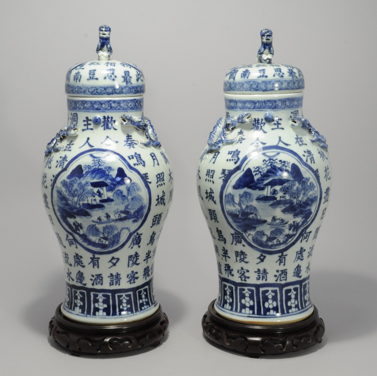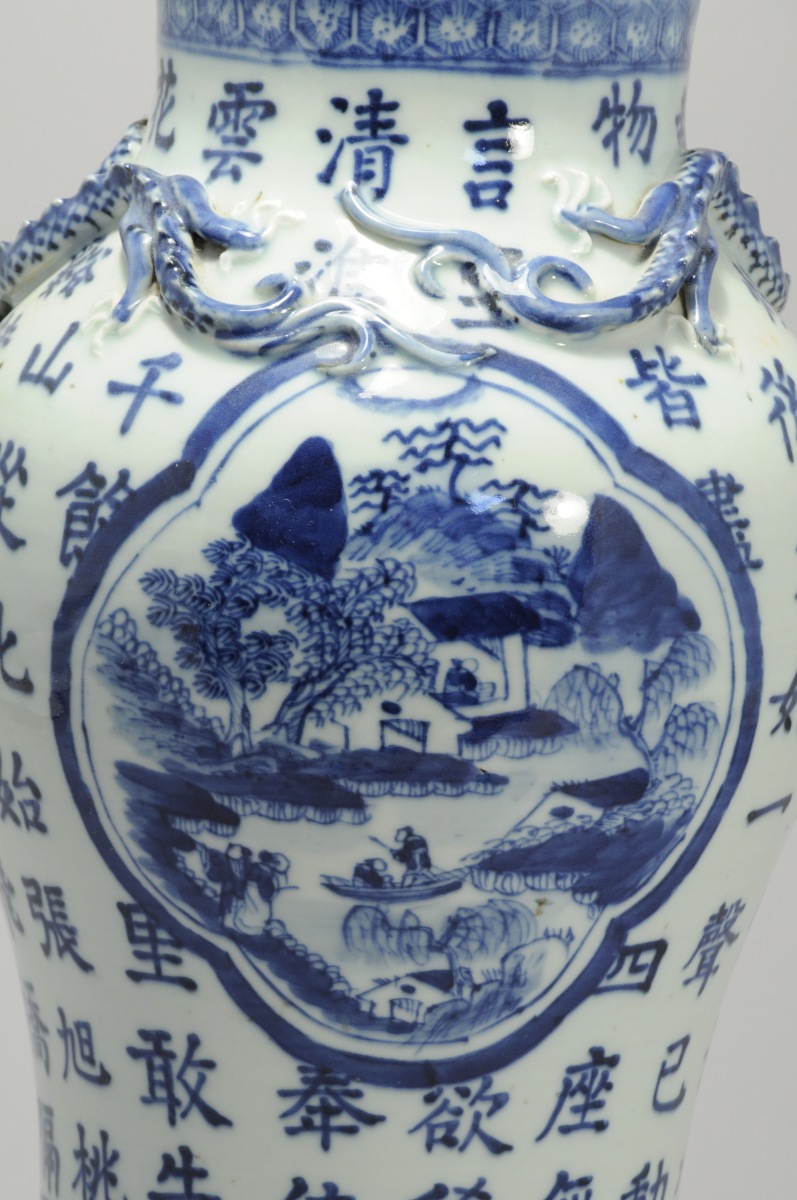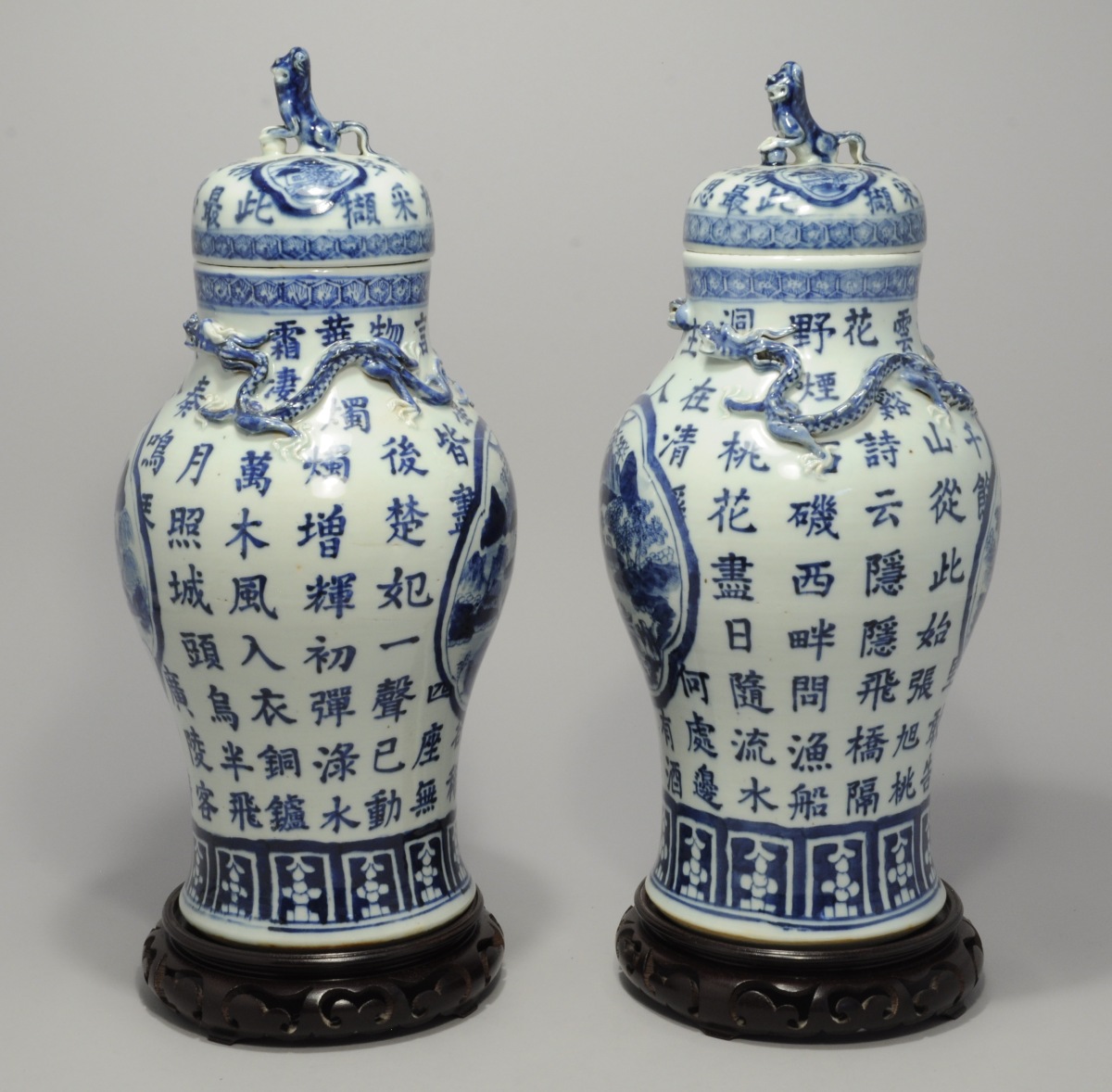 CHINE. Paire de POTICHES en porcelaine bleue et blanche à décor de paysage dans des cartouches en réserve d'idéogrammes. Le col orné d'une paire de dragons chassant la perle sacrée, le couvercle sommé d'un chien de Fô.