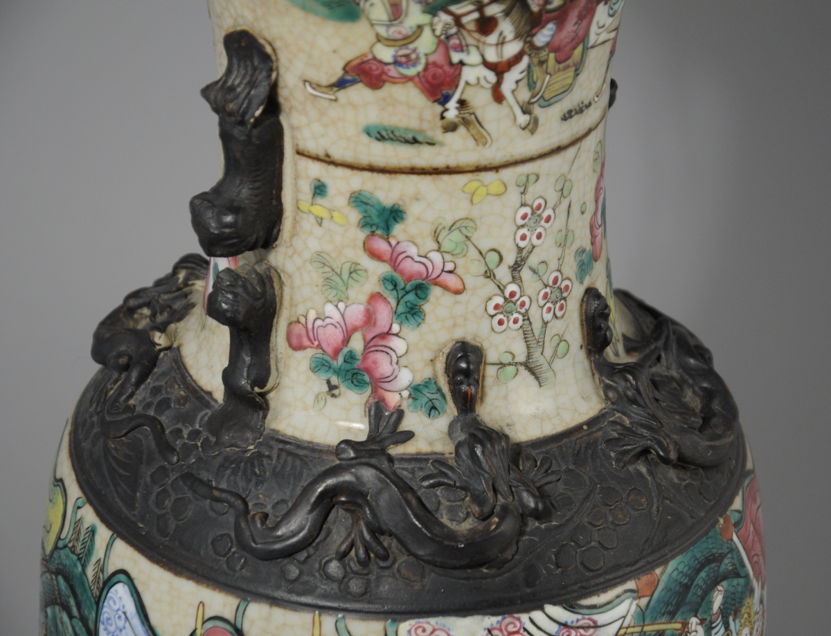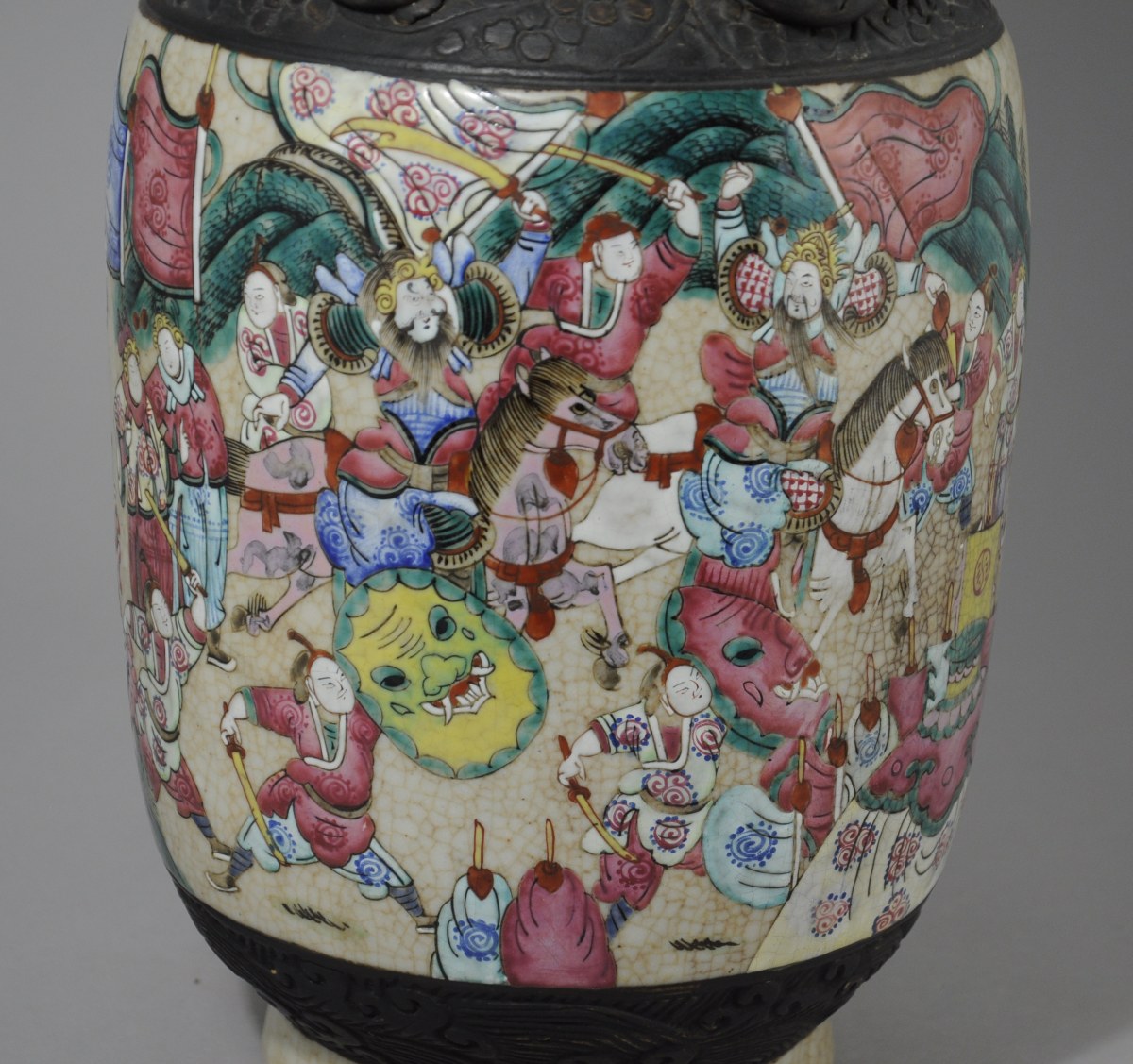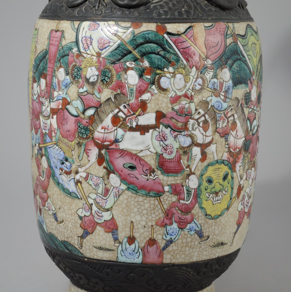 CHINE. VASE balustre en porcelaine craquelée à décor polychrome de scènes de bataille. Cachet sous la base.