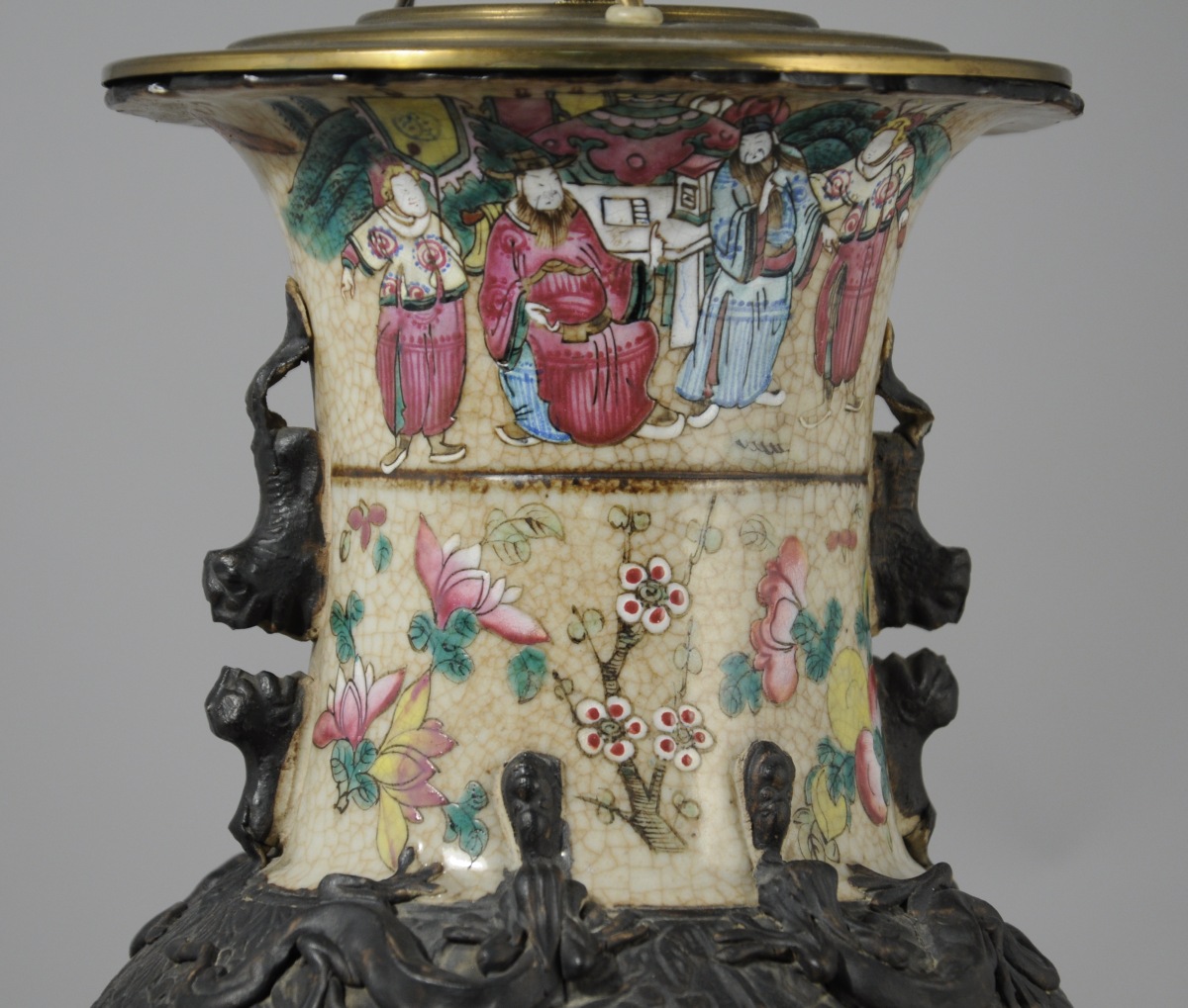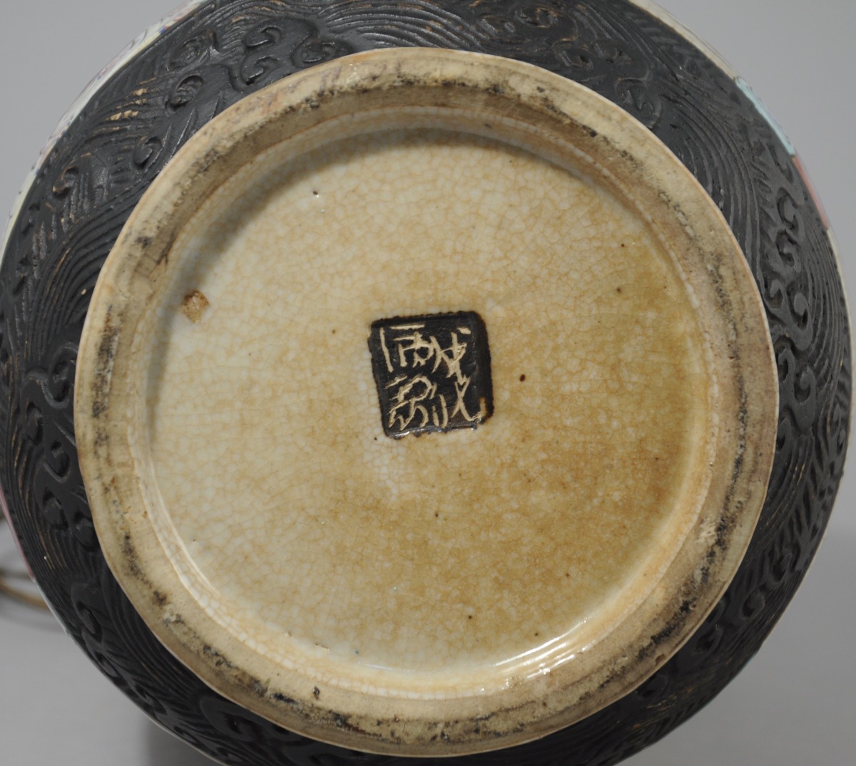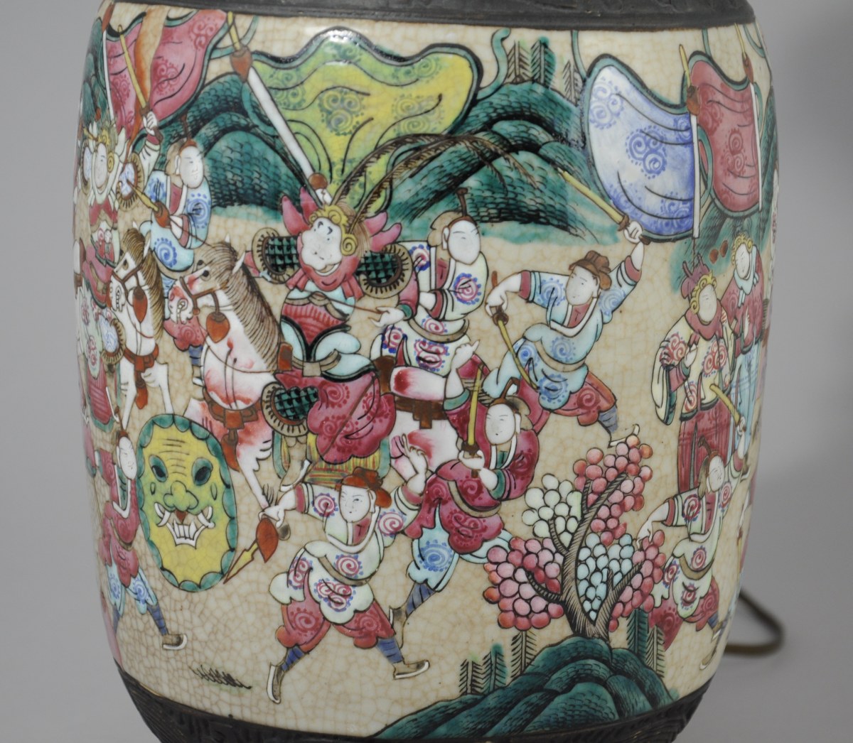 CHINE. VASE balustre en porcelaine craquelée à décor polychrome de scènes de bataille. Cachet sous la base.