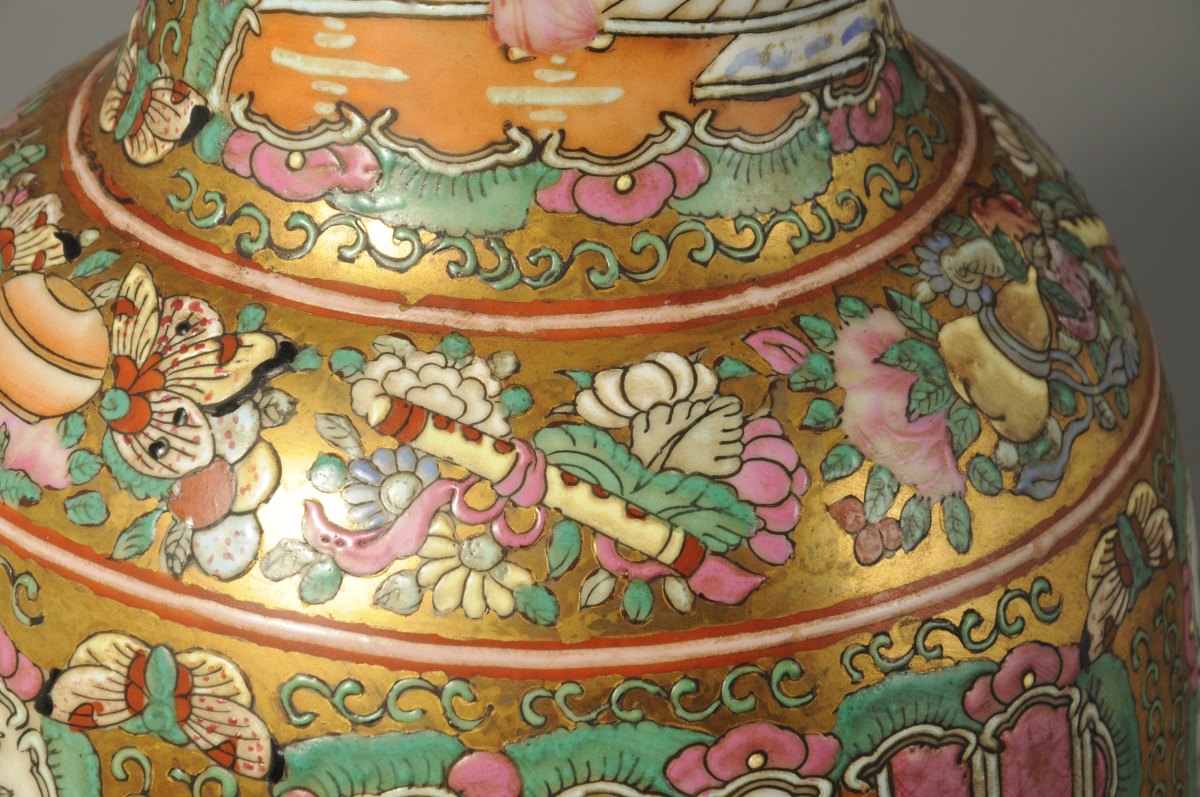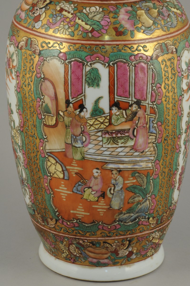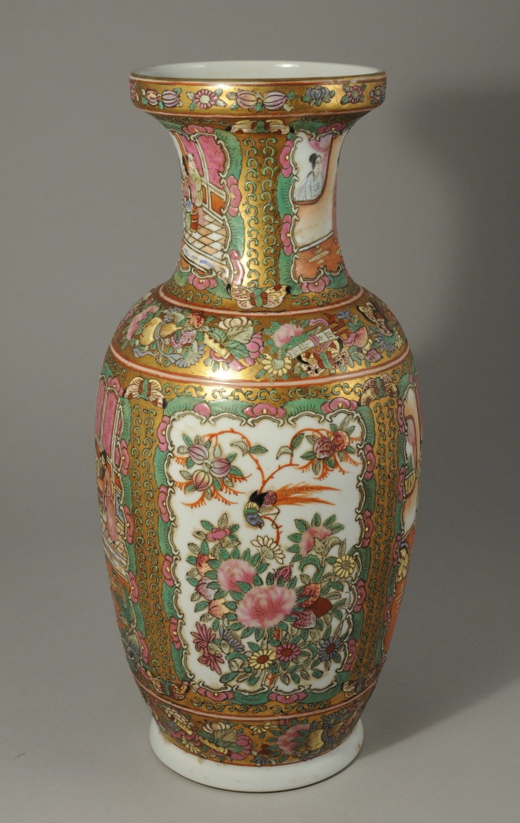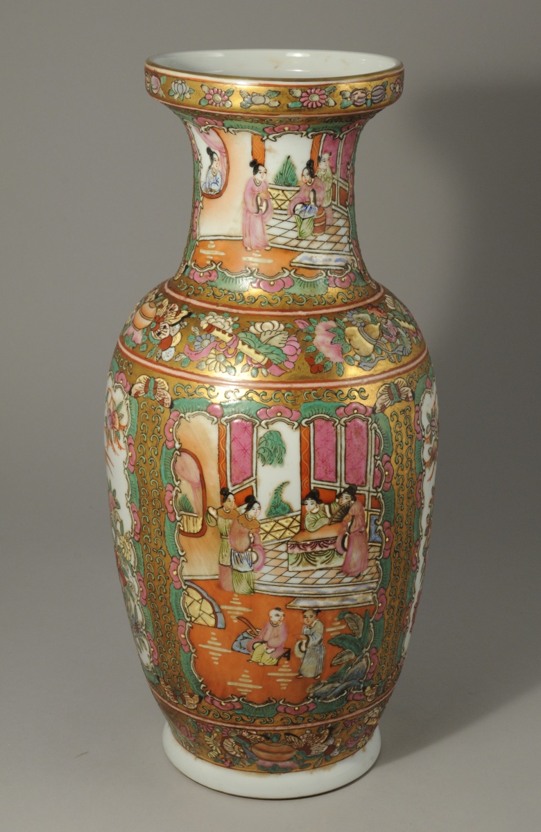 CHINE. VASE ROULEAU en porcelaine polychrome et dorée à décor dans des cartouches de scènes de palais. Marque olographe de Qianlong.