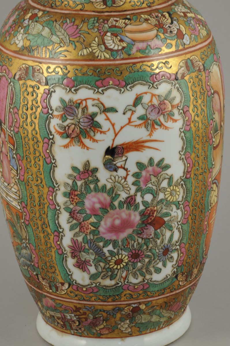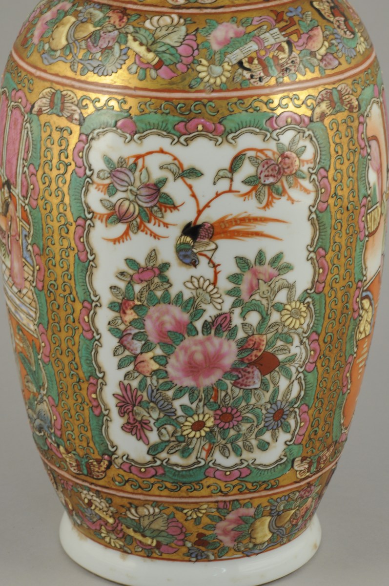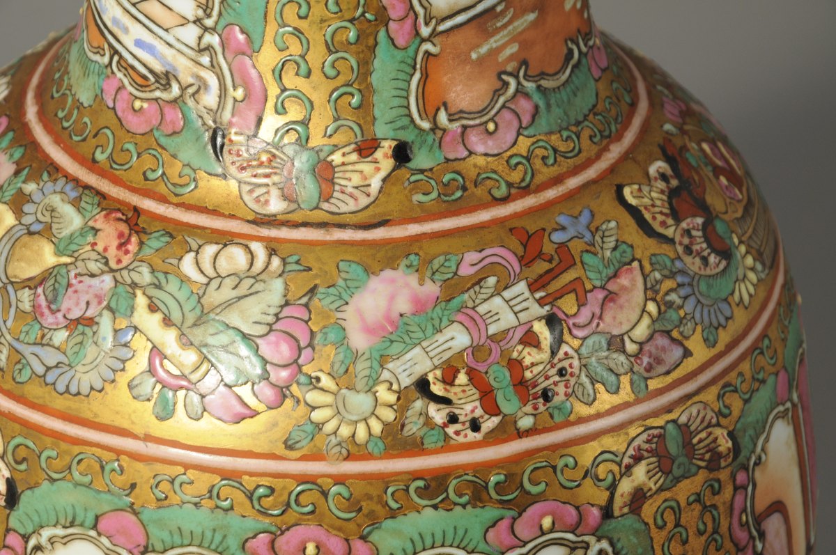 CHINE. VASE ROULEAU en porcelaine polychrome et dorée à décor dans des cartouches de scènes de palais. Marque olographe de Qianlong.