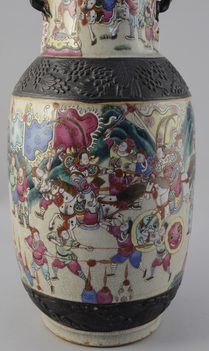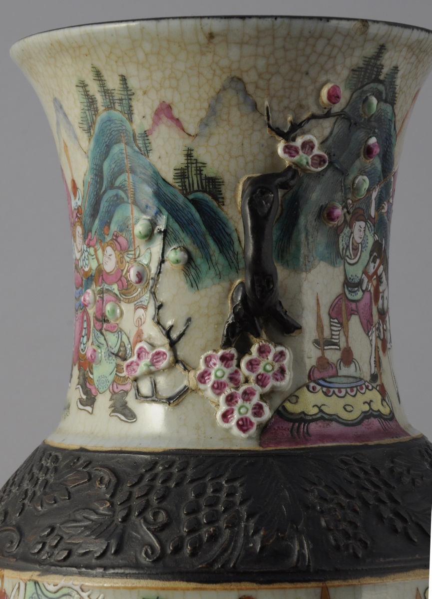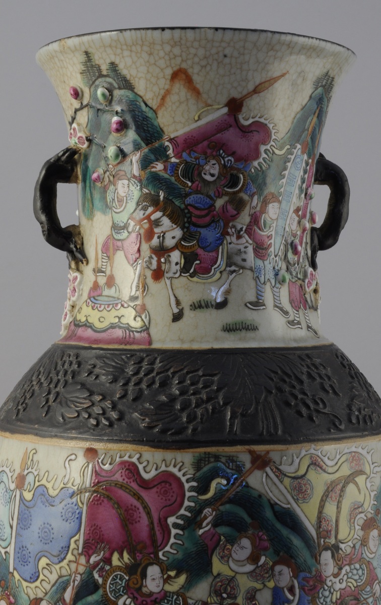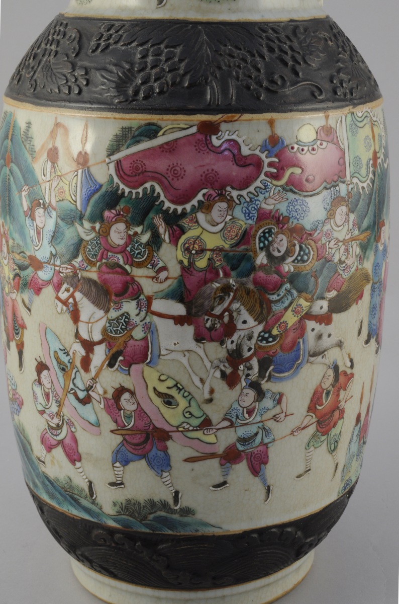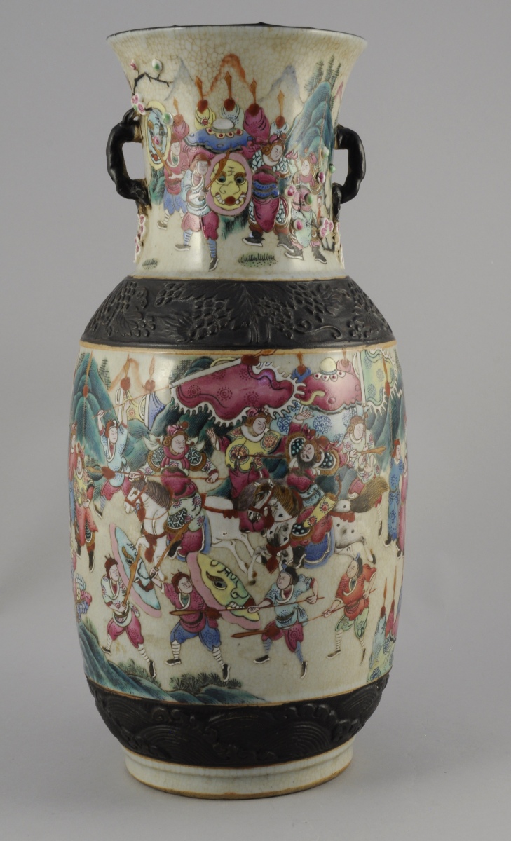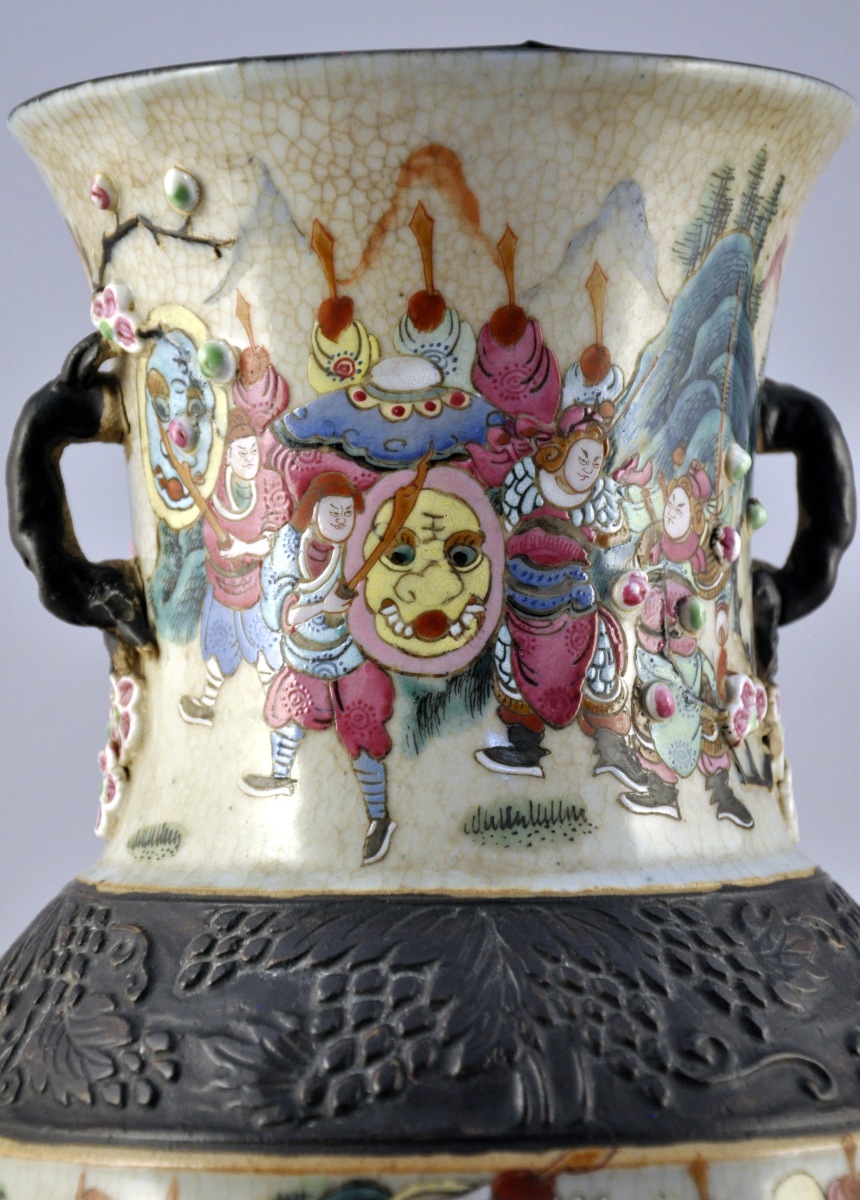 CHINE. VASE balustre en porcelaine à décor polychrome de scènes de bataille. Anses figurant une branche de cerisier en fleurs. Cachet sous la base.