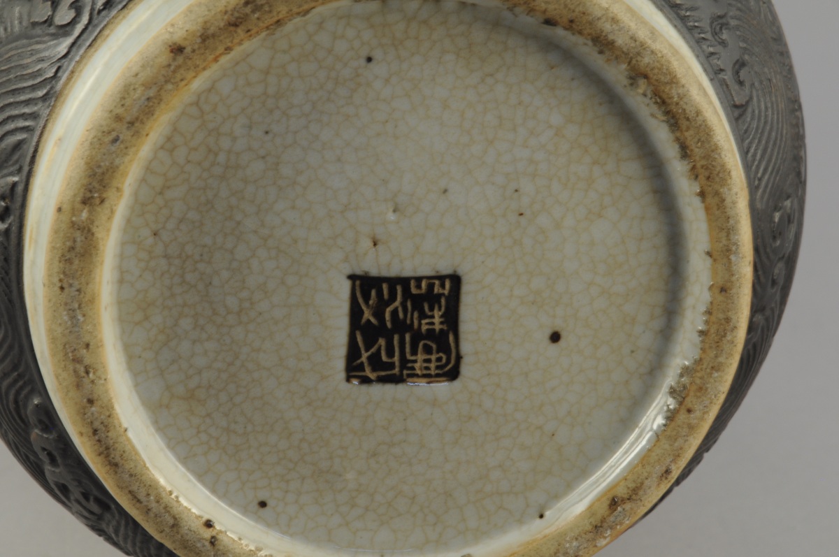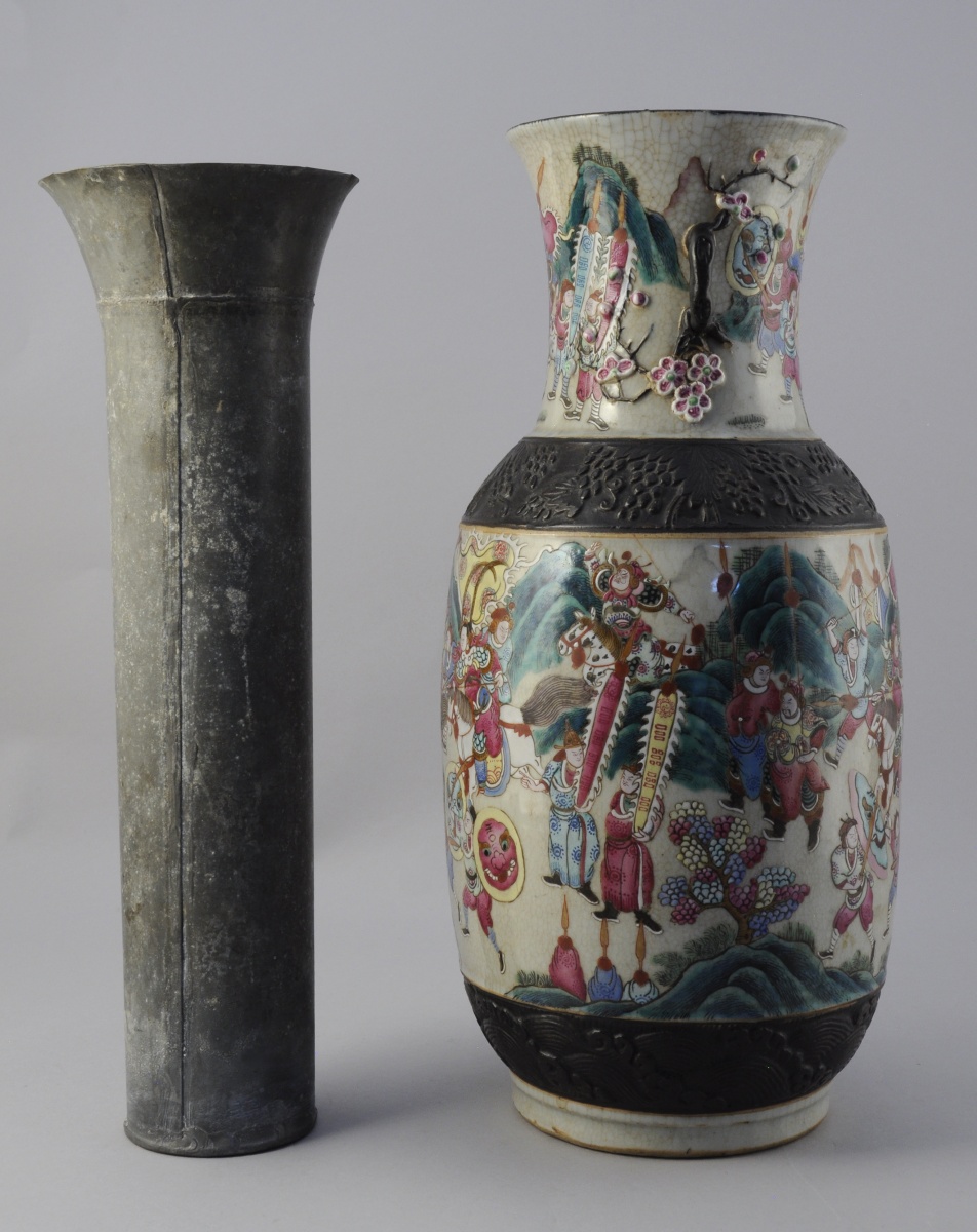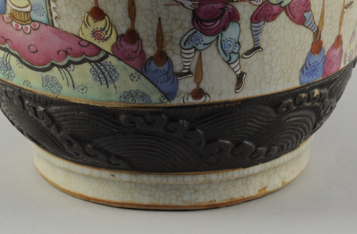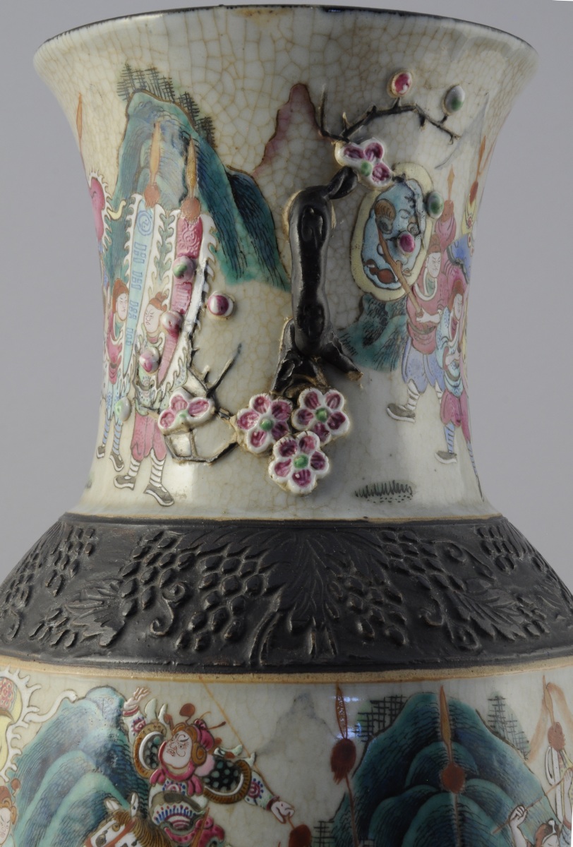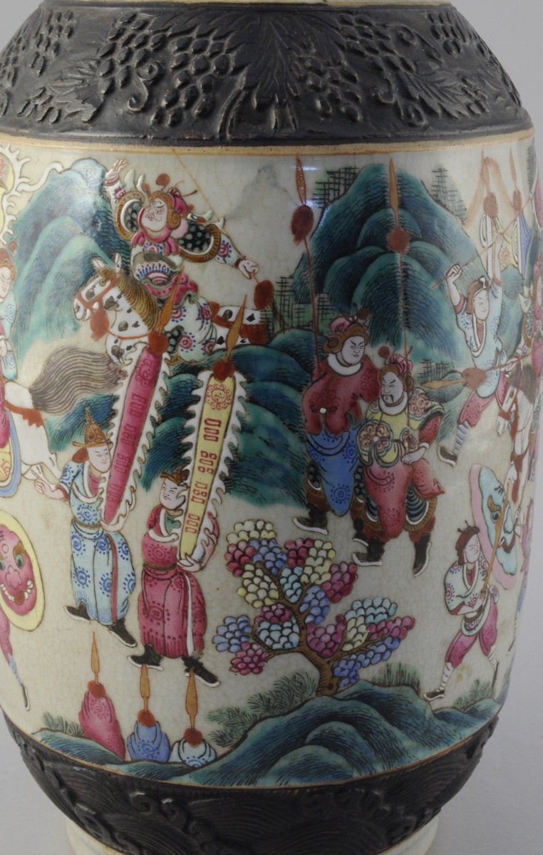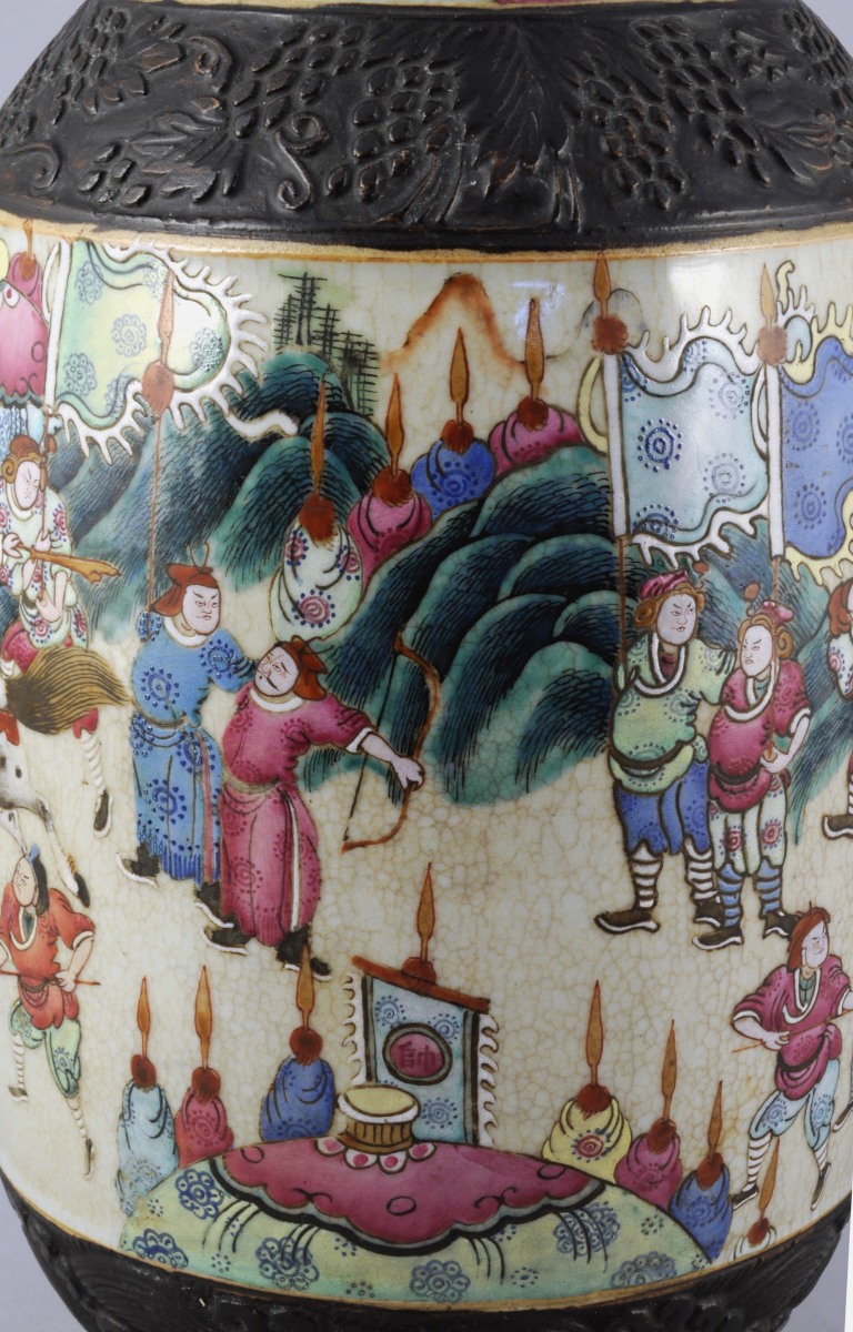 CHINE. VASE balustre en porcelaine à décor polychrome de scènes de bataille. Anses figurant une branche de cerisier en fleurs. Cachet sous la base.